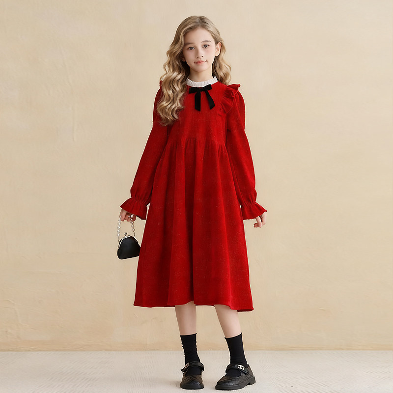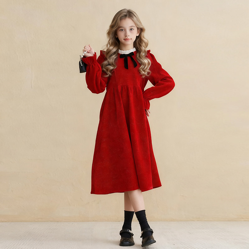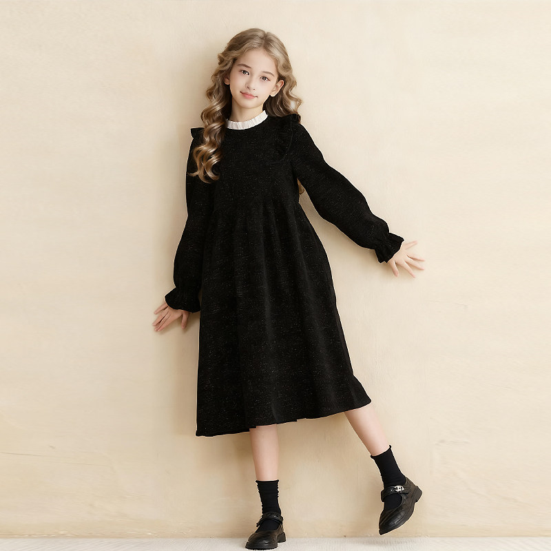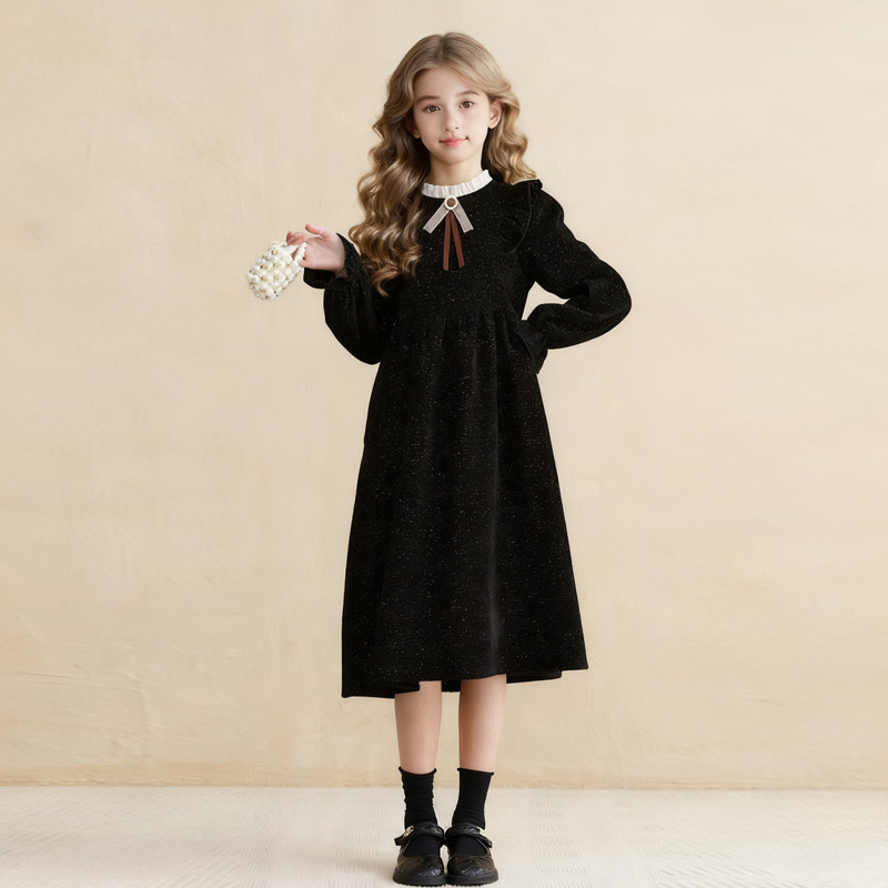 气质小黑裙花领蝴蝶结女童秋冬连衣裙中大童高级感公主裙加绒冬裙