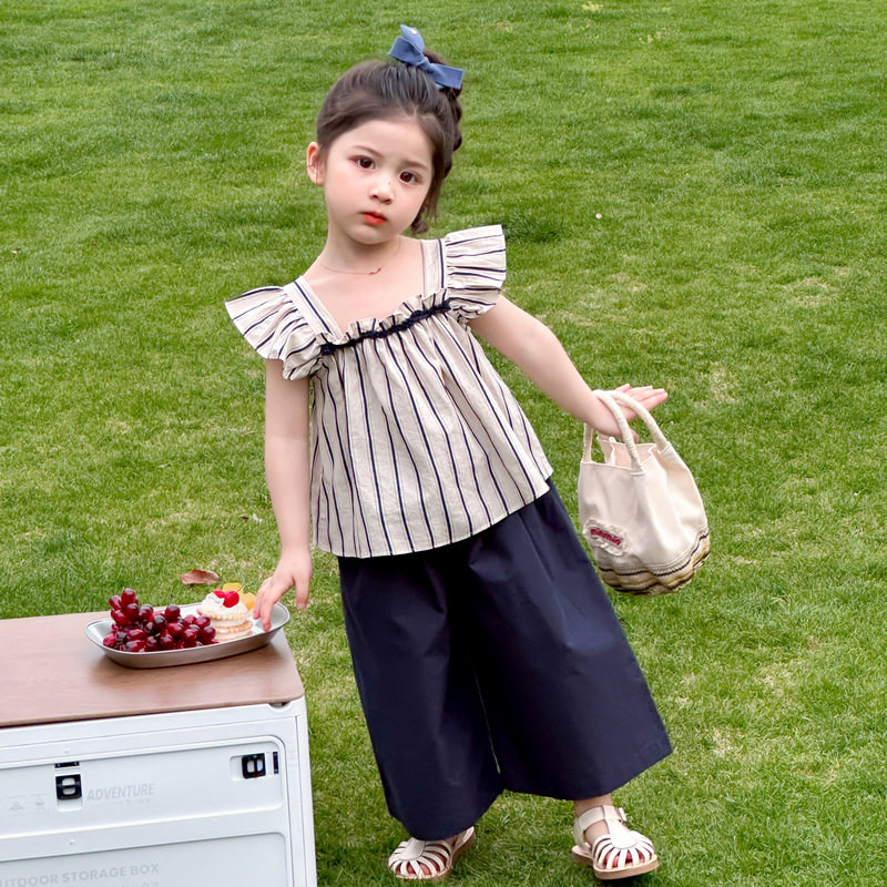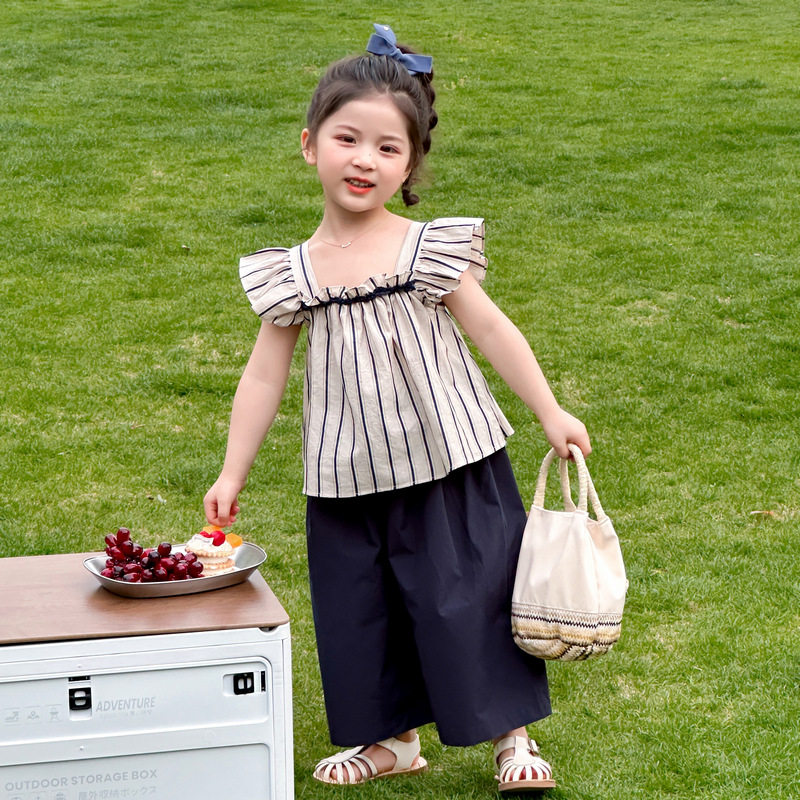 311线报网描述:2025新款洋气时髦女童竖纹T恤阔腿裤两件套