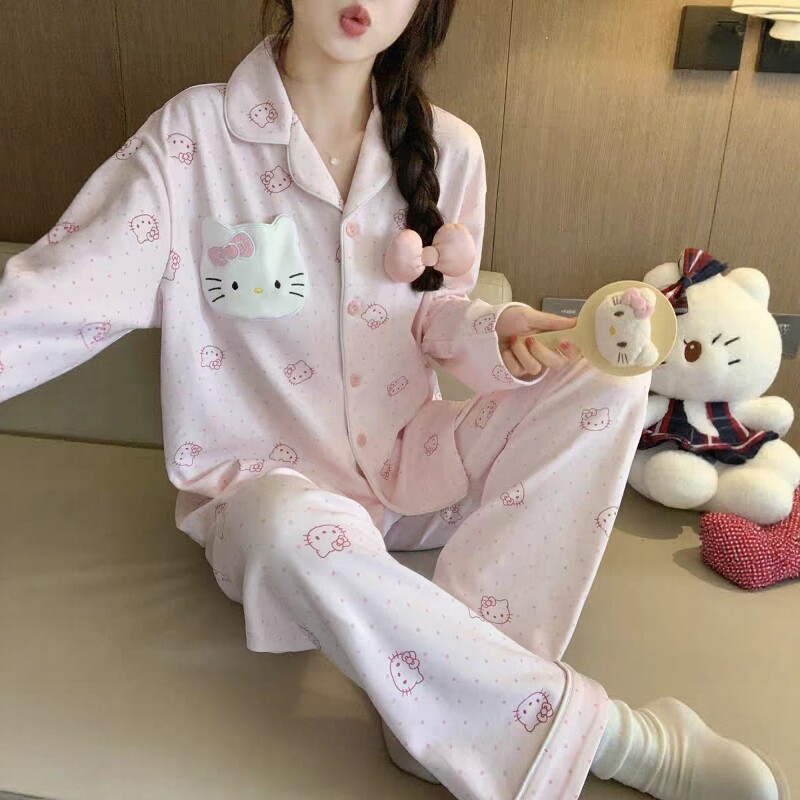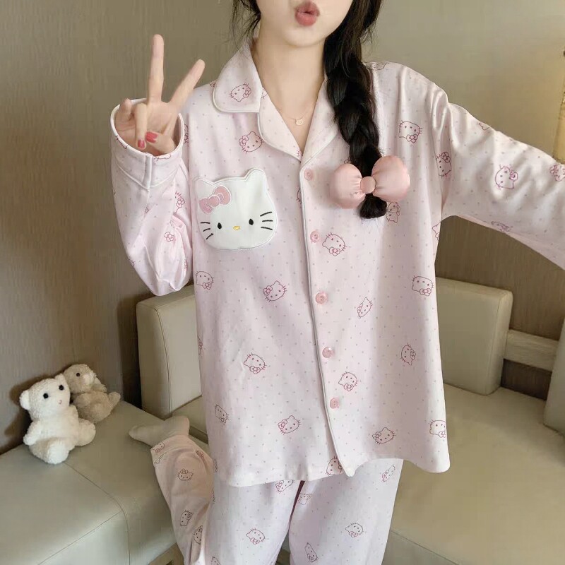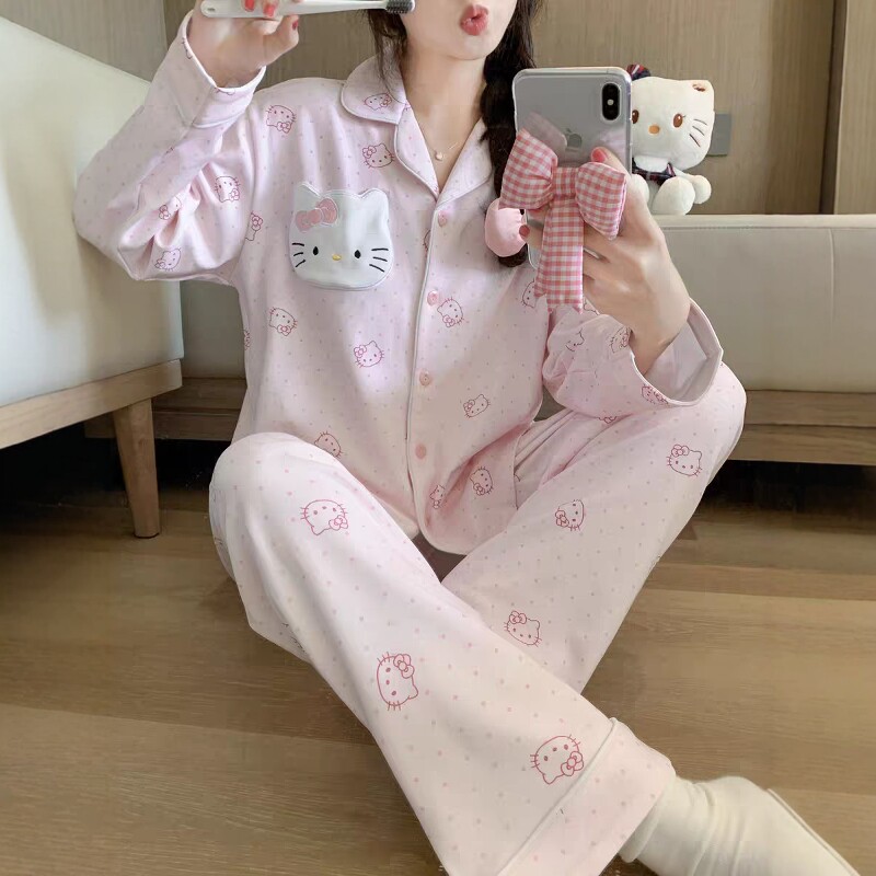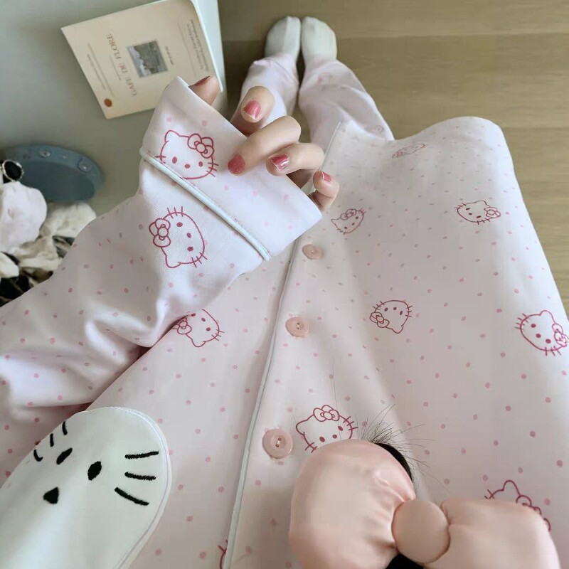 甜美波点KT猫纯棉睡衣女款春秋季2026新款可爱卡通长袖套装家居服