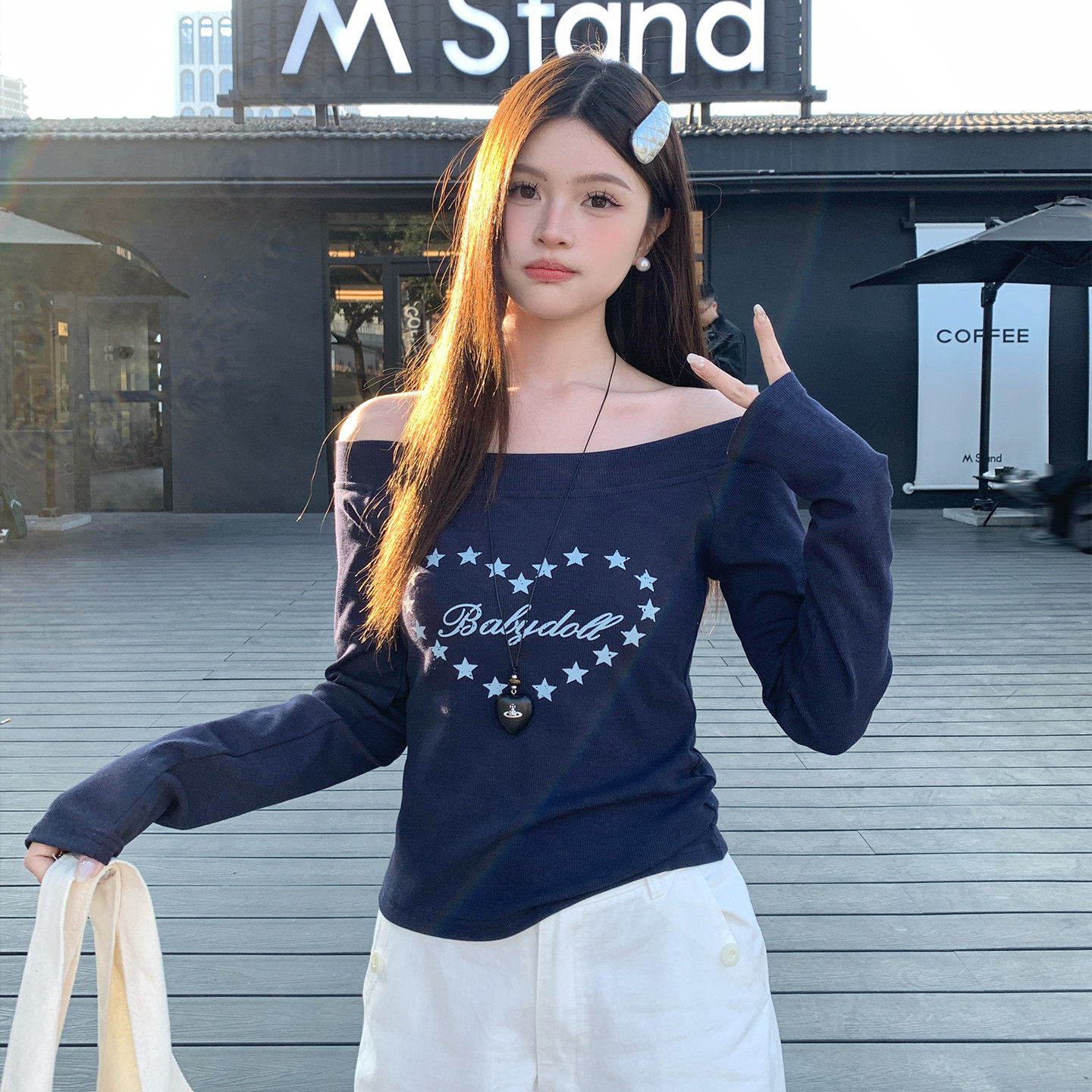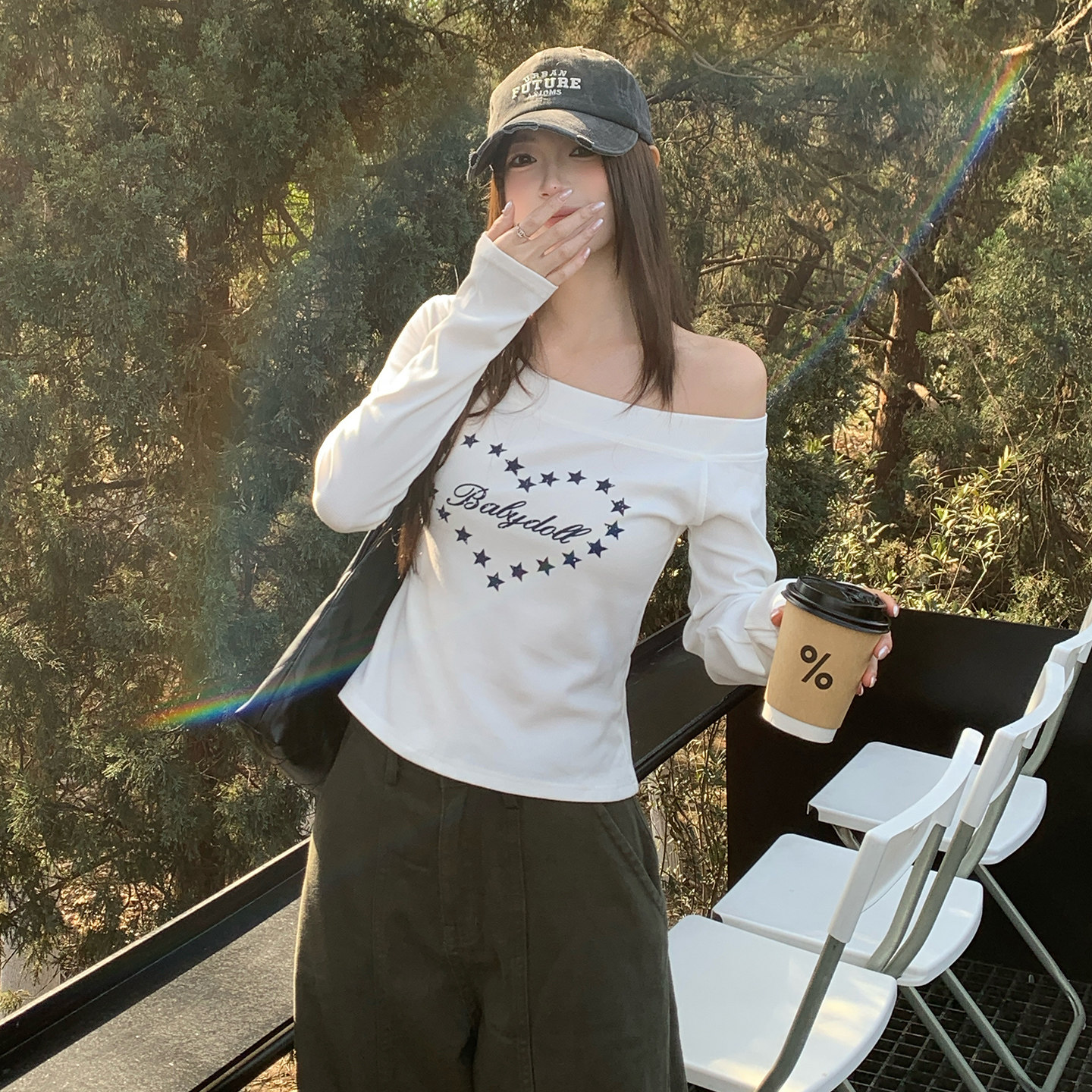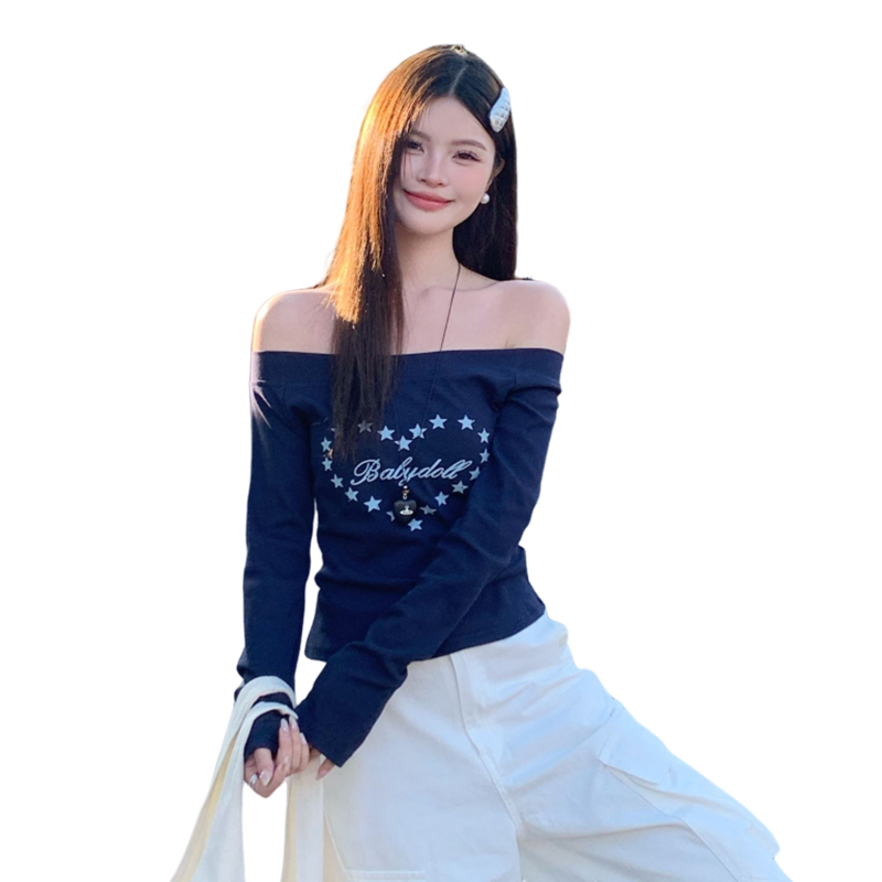 龙妹白色一字肩长袖T恤女外穿2026早春新款辣妹修身斜肩印花上衣