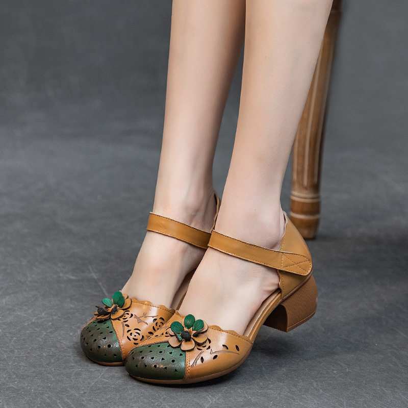 夏季新款女式中空凉鞋民族风头层牛皮粗跟魔术贴花朵拼色妈妈鞋子