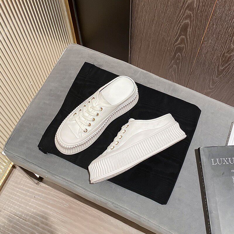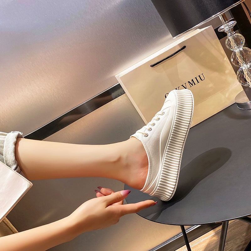 香港包头半拖鞋女春夏季外穿2025透气帆布鞋内增高厚底松糕小白鞋