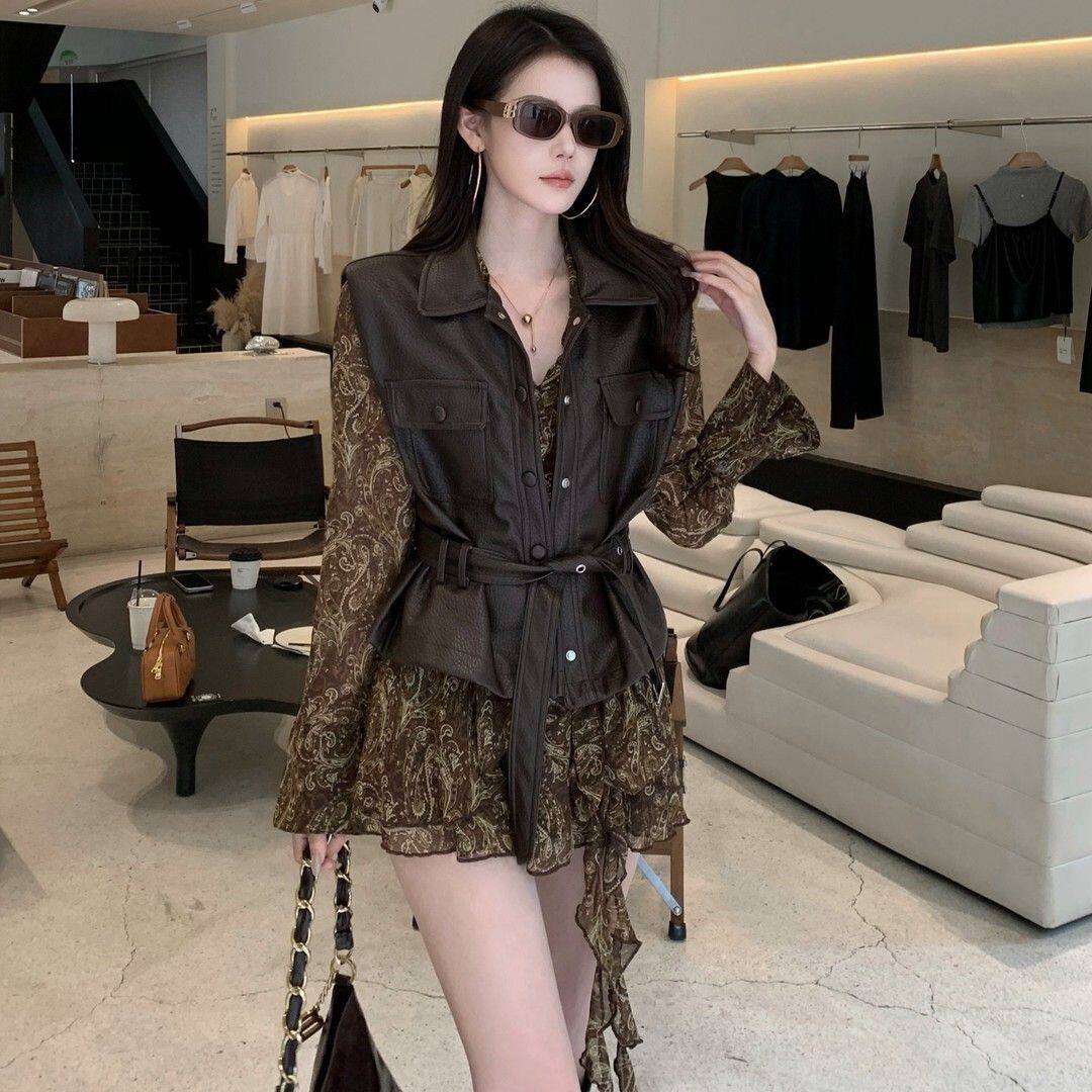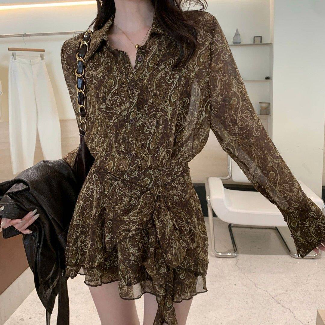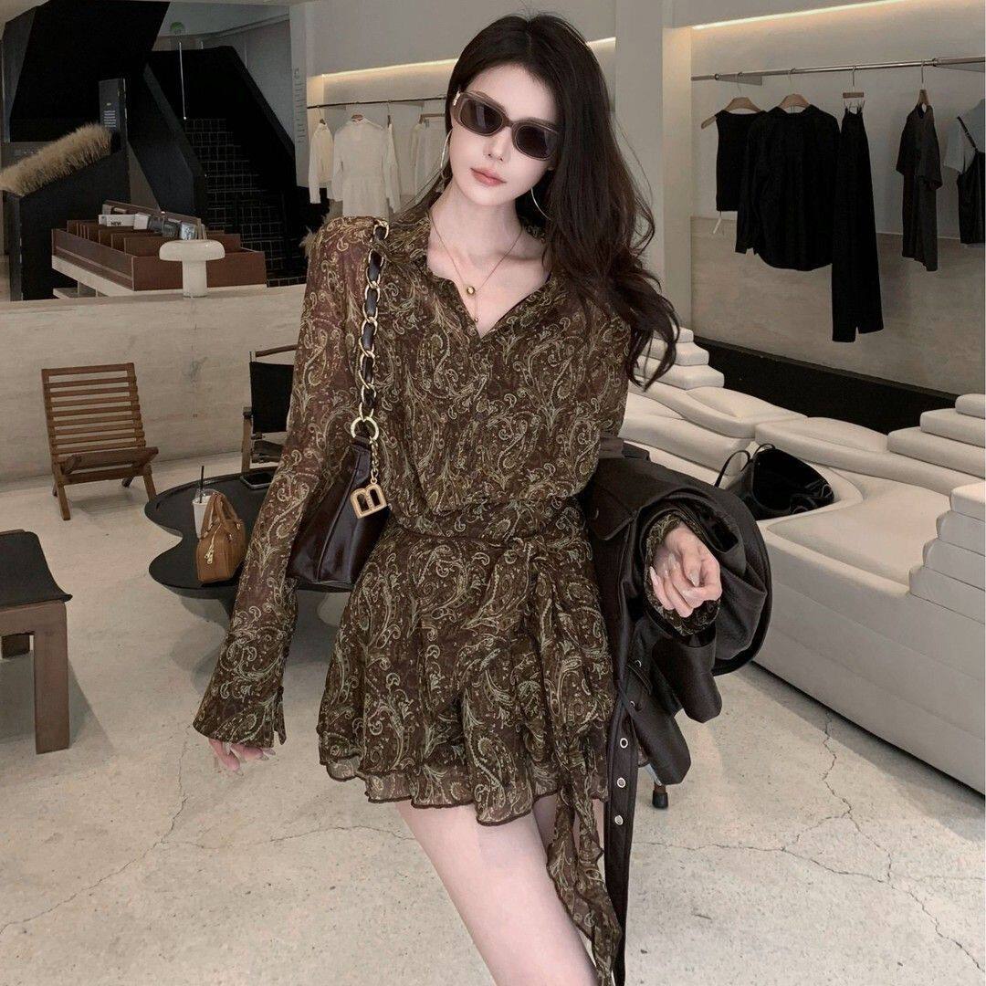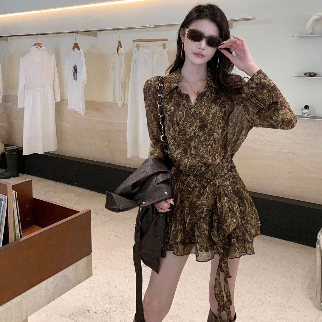 秋季新款性感腰果花V领长袖衬衫连衣裙高级感修身收腰气质短裙女