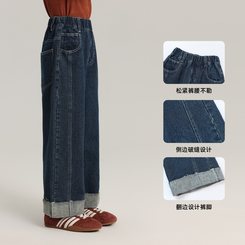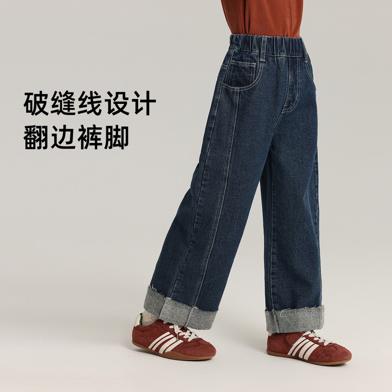 布丁哈鲁童装春装女童百搭裤子2026春秋新款儿童翻边直筒牛仔裤
