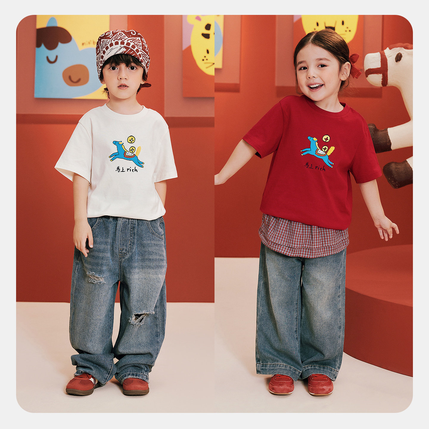 【亲子装】迷你巴拉男女童短袖T恤纯棉一家三口亲子装红色夏季