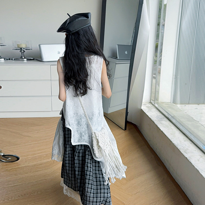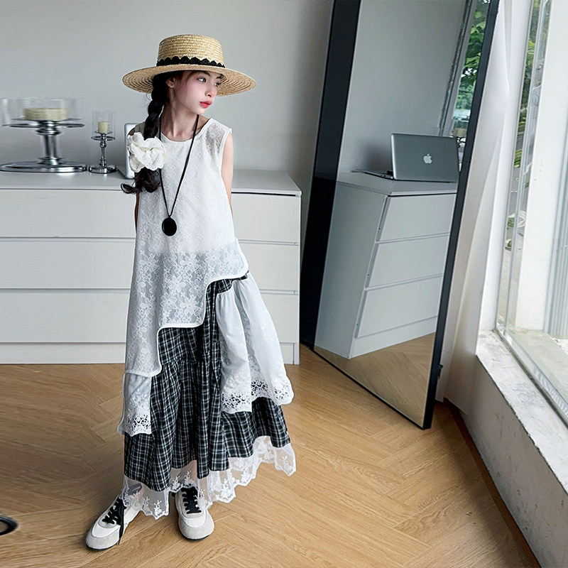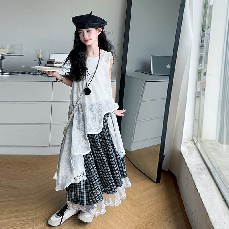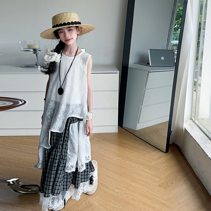 夏季蕾丝T恤连衣裙女童套装薄款2026新款大儿童格子半身裙两件套