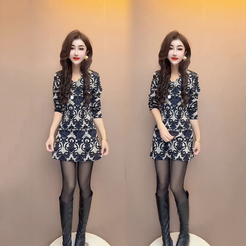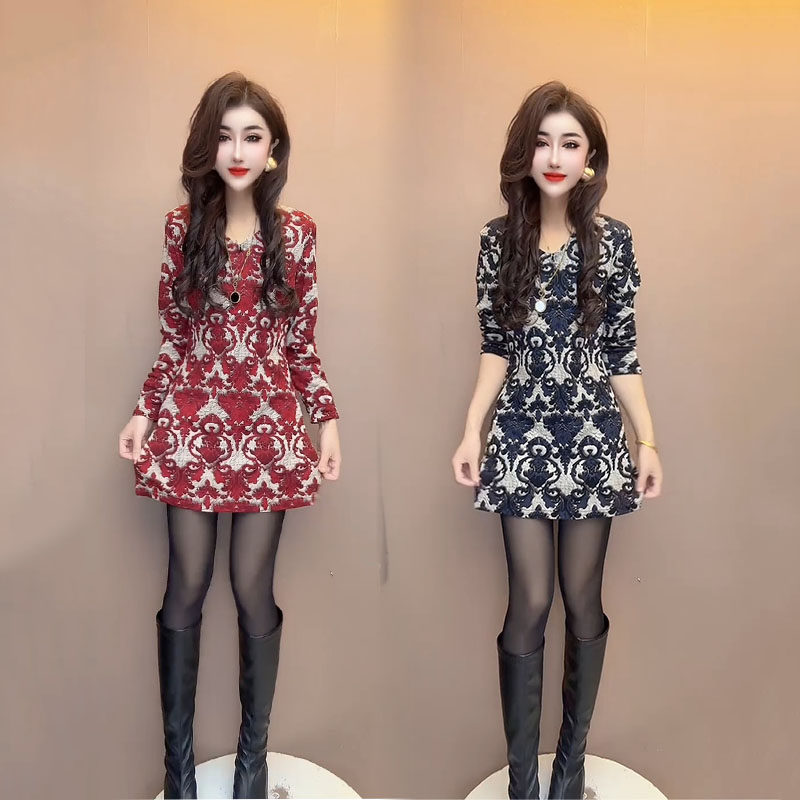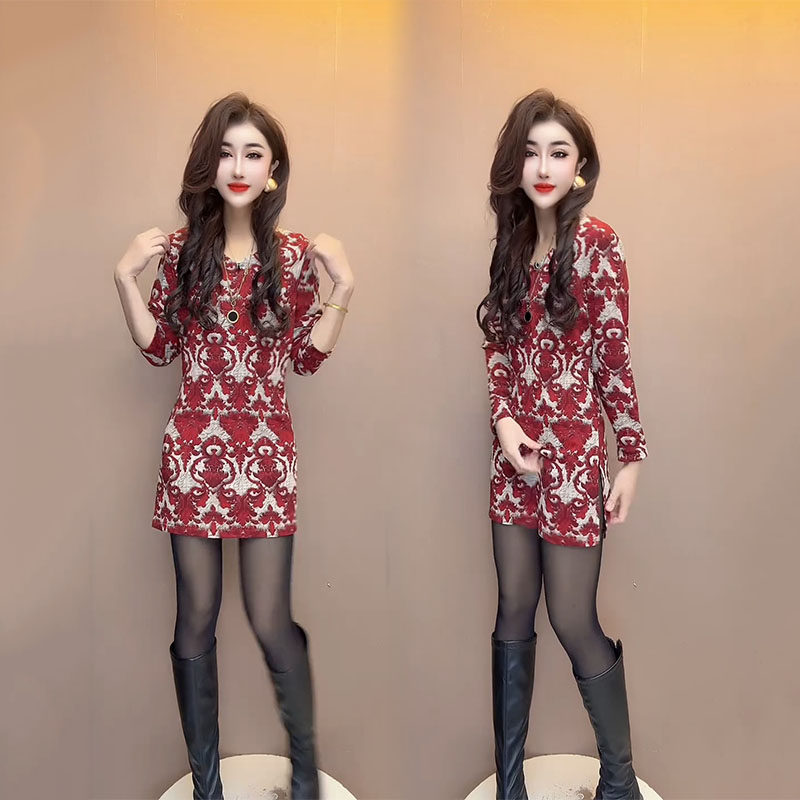 2026早春新款欧花时尚连衣裙女洋气百搭V领长袖休闲遮肉显瘦大衫