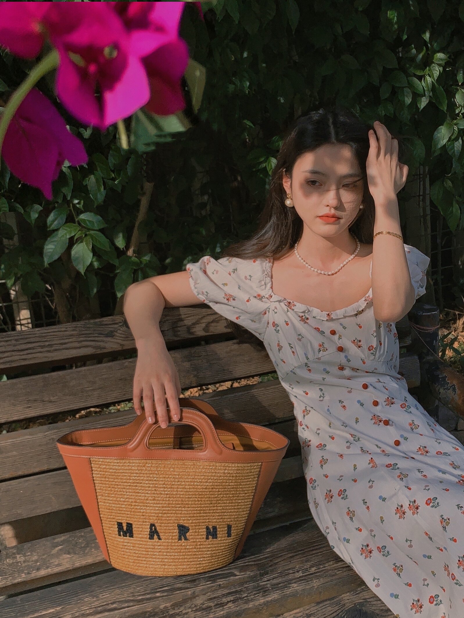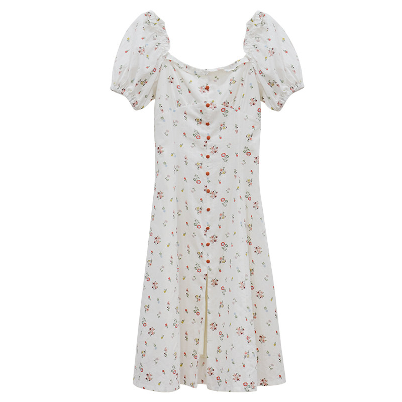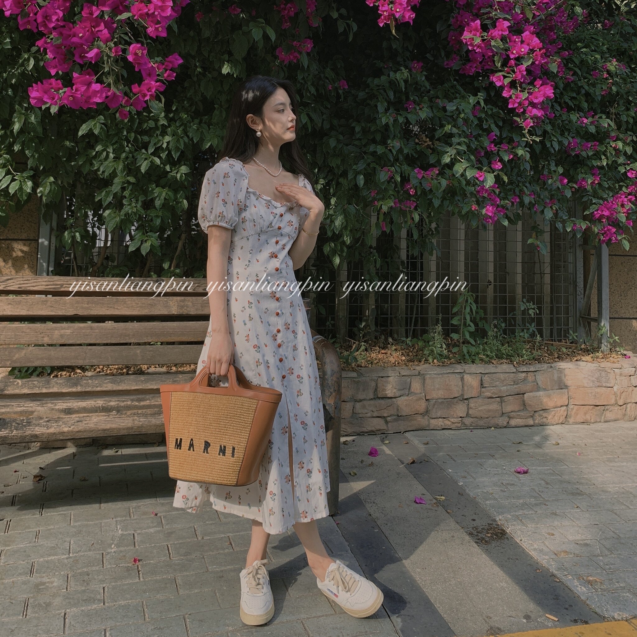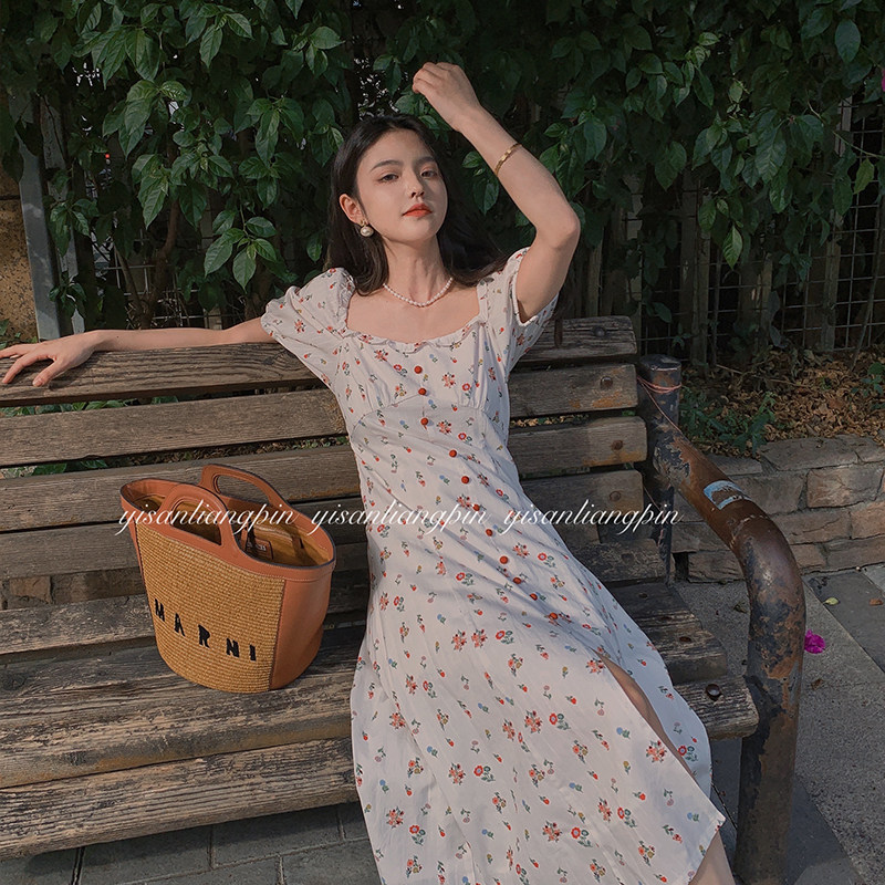 一三良品小个子 西西里漫花~法式方领修身收腰碎花连衣裙长裙夏