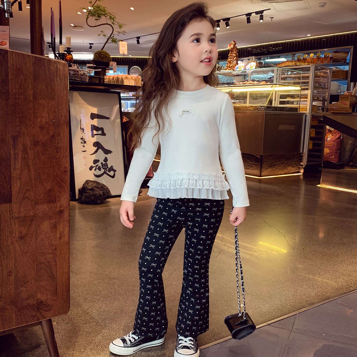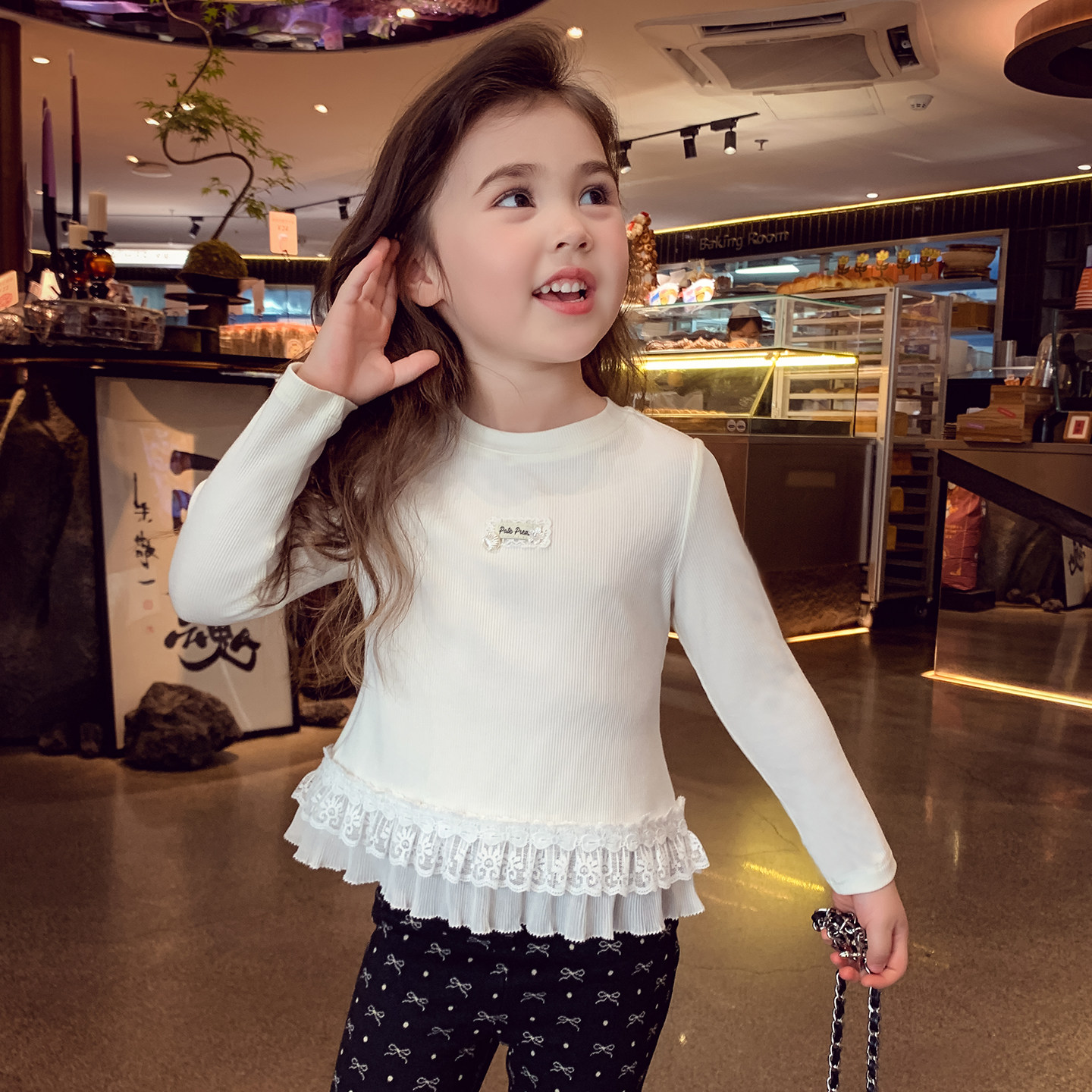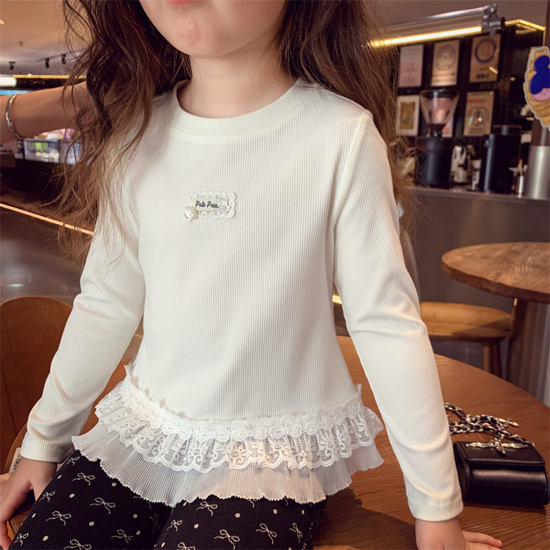 女童长袖T恤春装2026新款女孩芭蕾风花边打底衫女孩白色内搭上衣