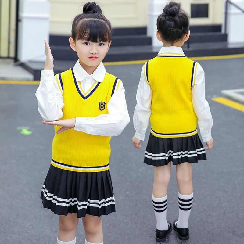 儿童马甲女孩毛衣小学生坎肩女童针织背心校服学院风春秋黄色马夹