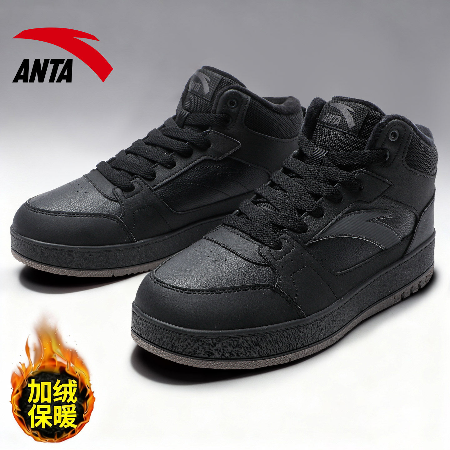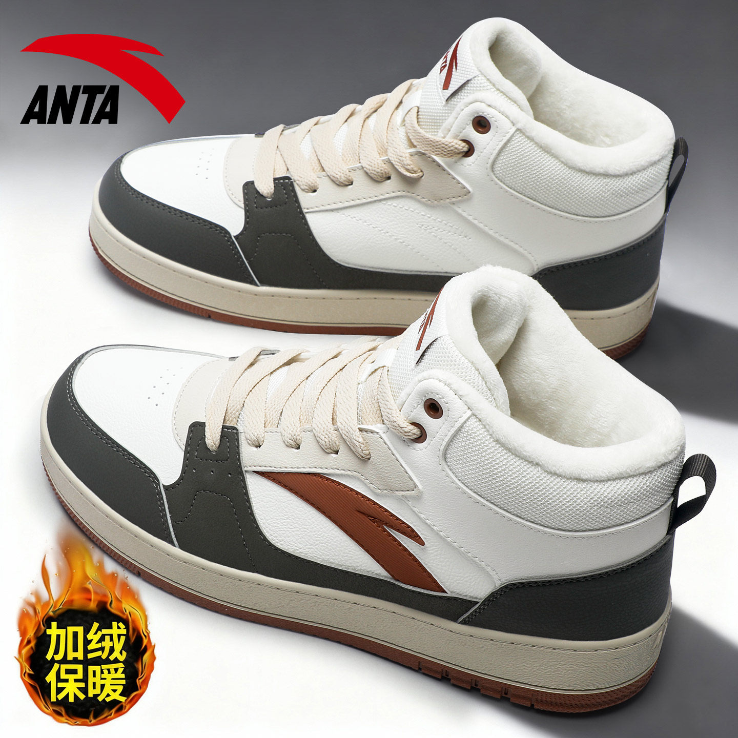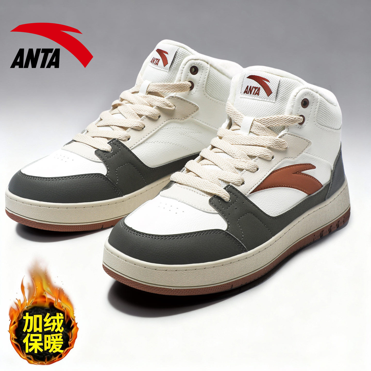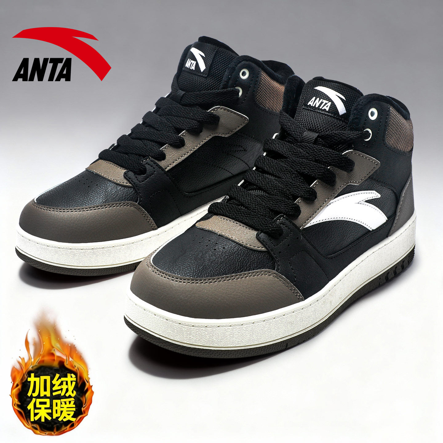 安踏男鞋高帮板鞋休闲皮面加绒保暖复古2026春季新款潮流运动鞋子