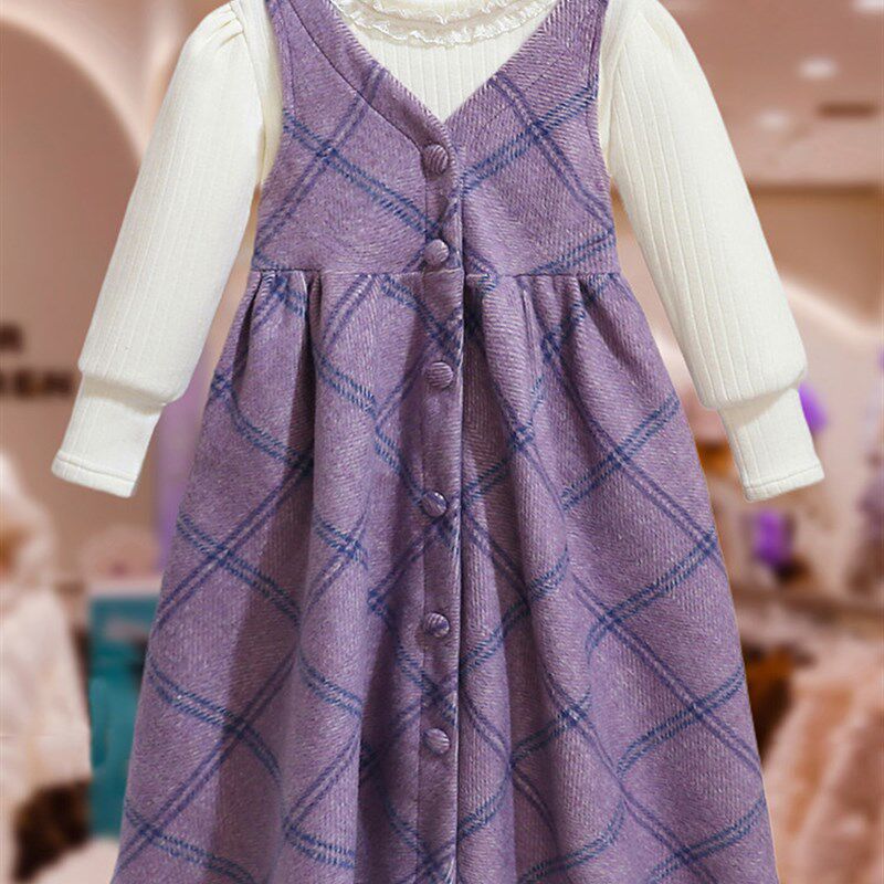 女童毛呢连衣裙秋冬2025新款儿童加绒格子背心裙套装新年红色裙子