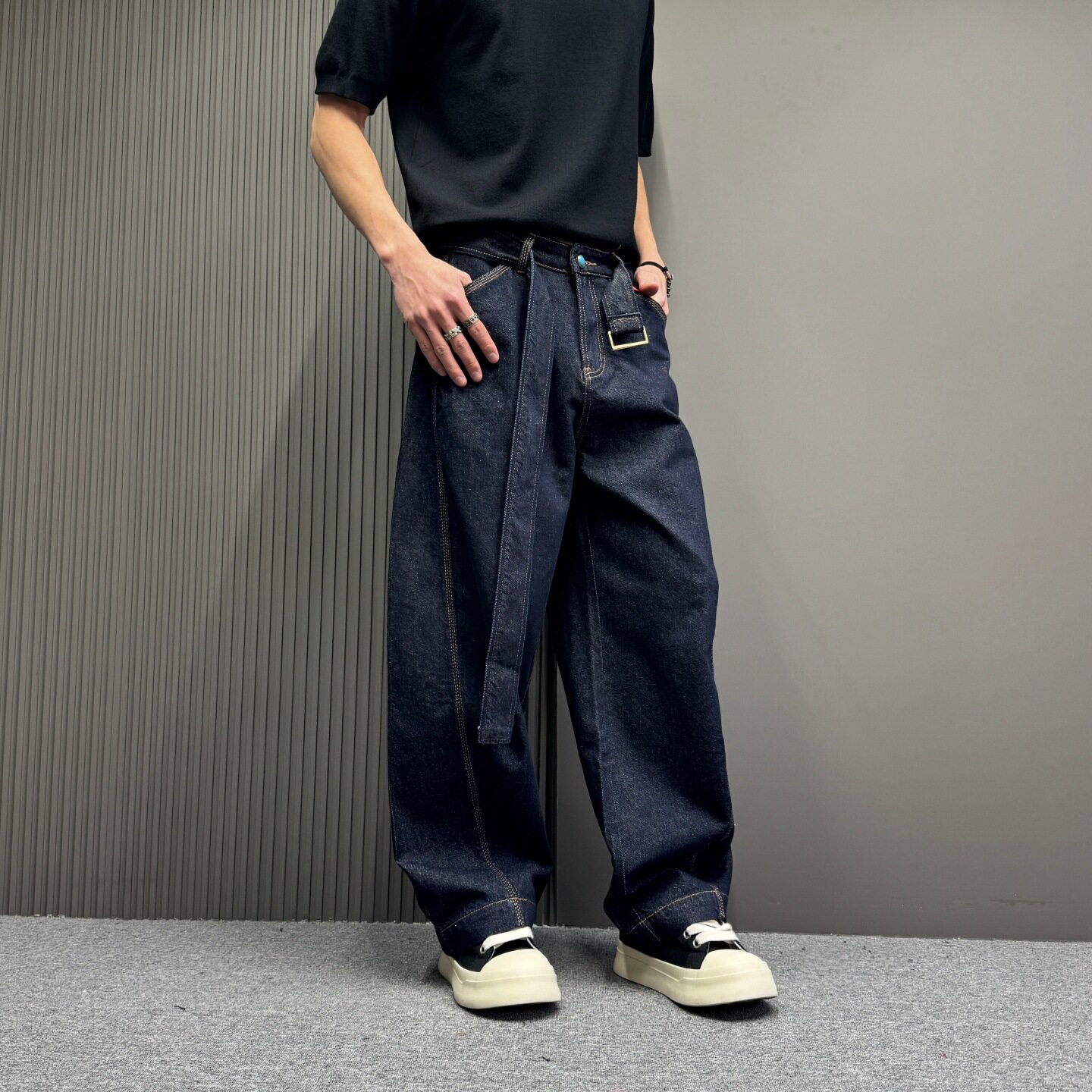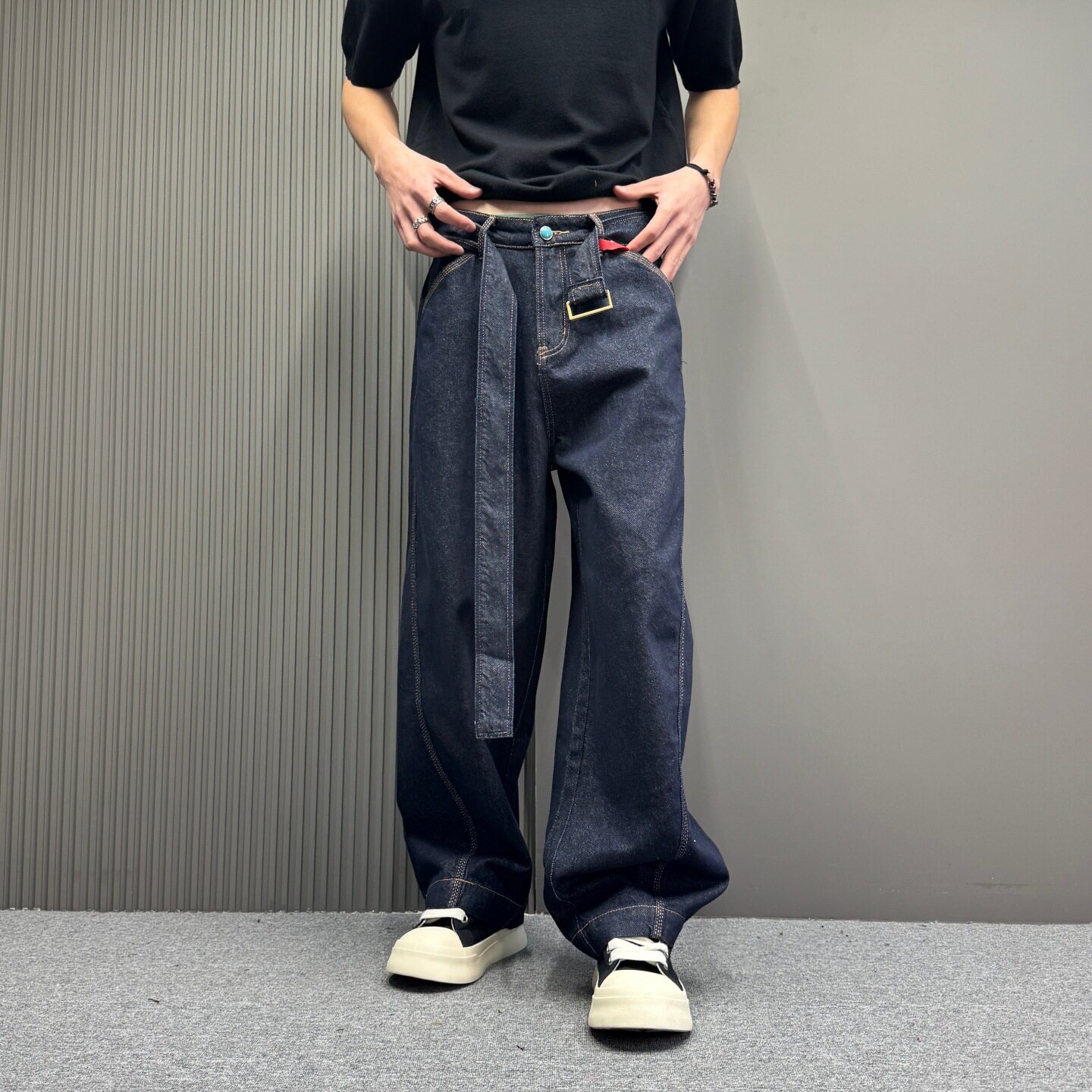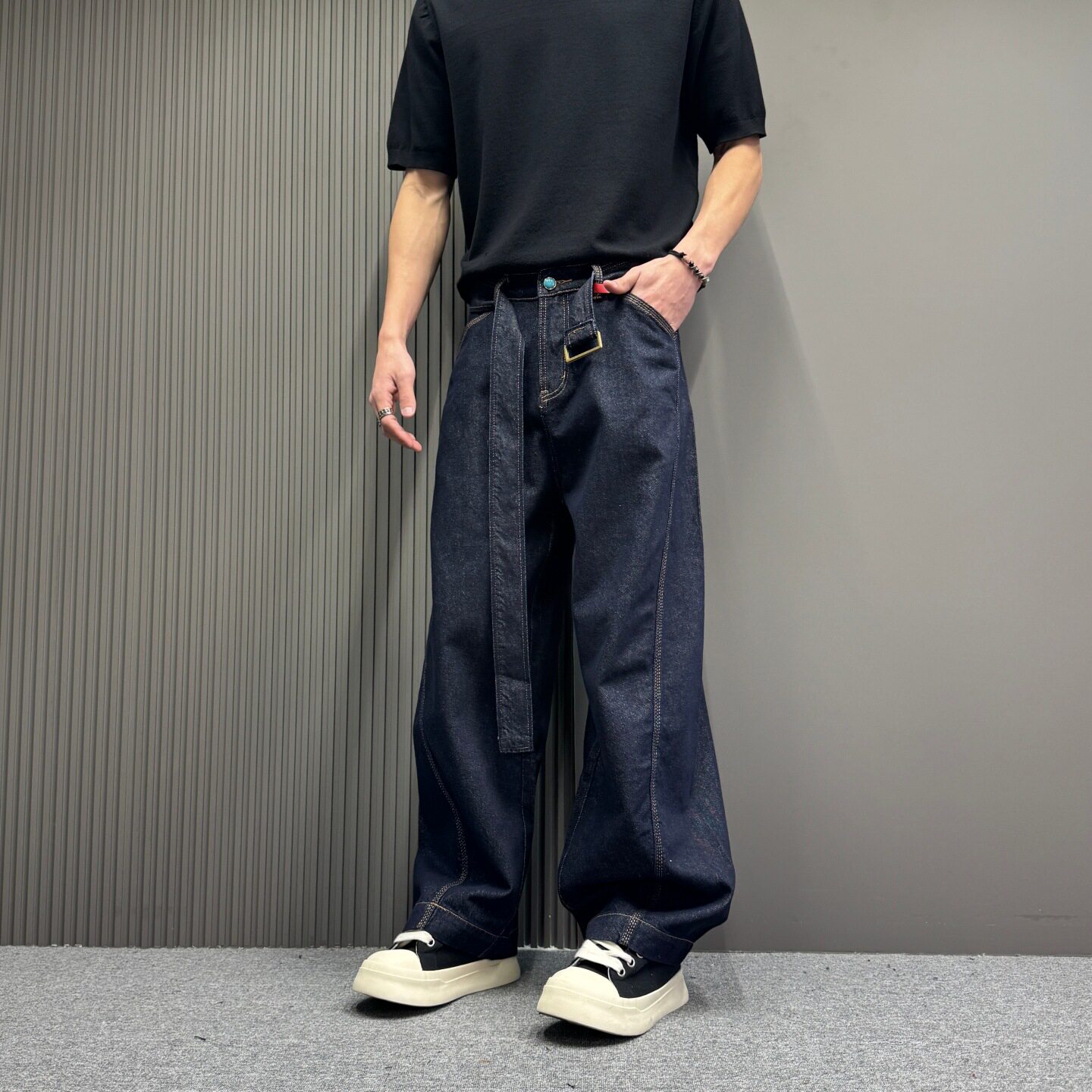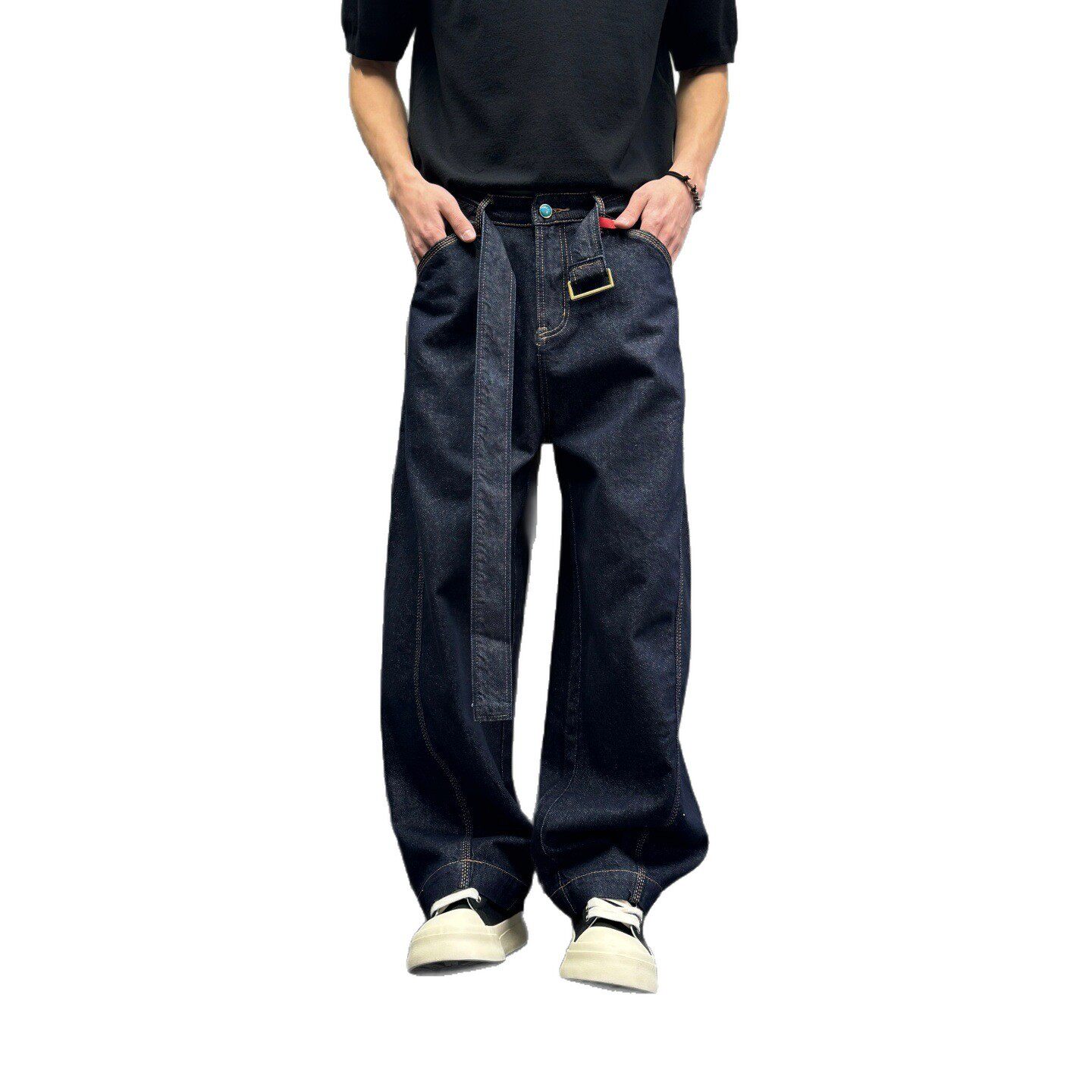 美式水洗复古腰带牛仔裤男女款宽松廓形镰刀弯刀阔腿裤子风穿搭