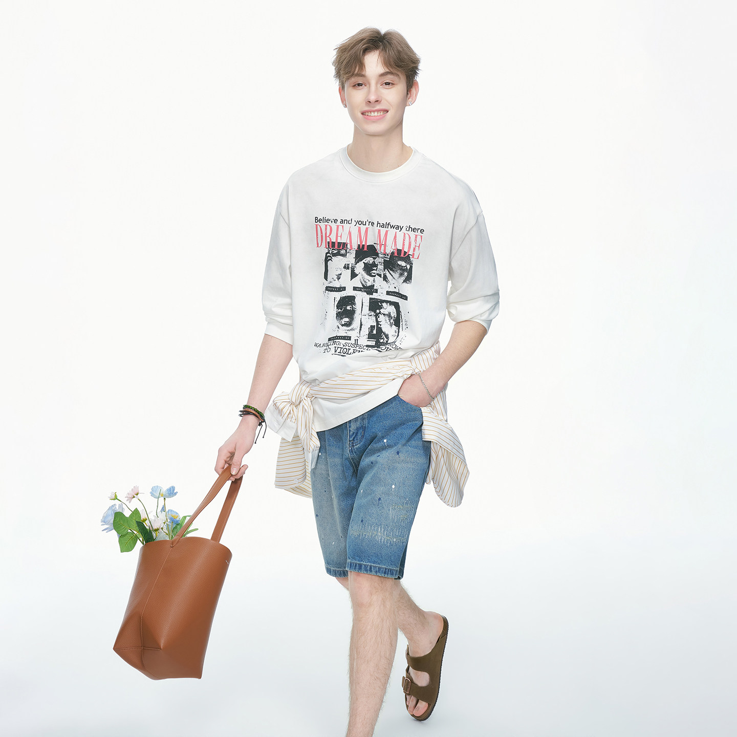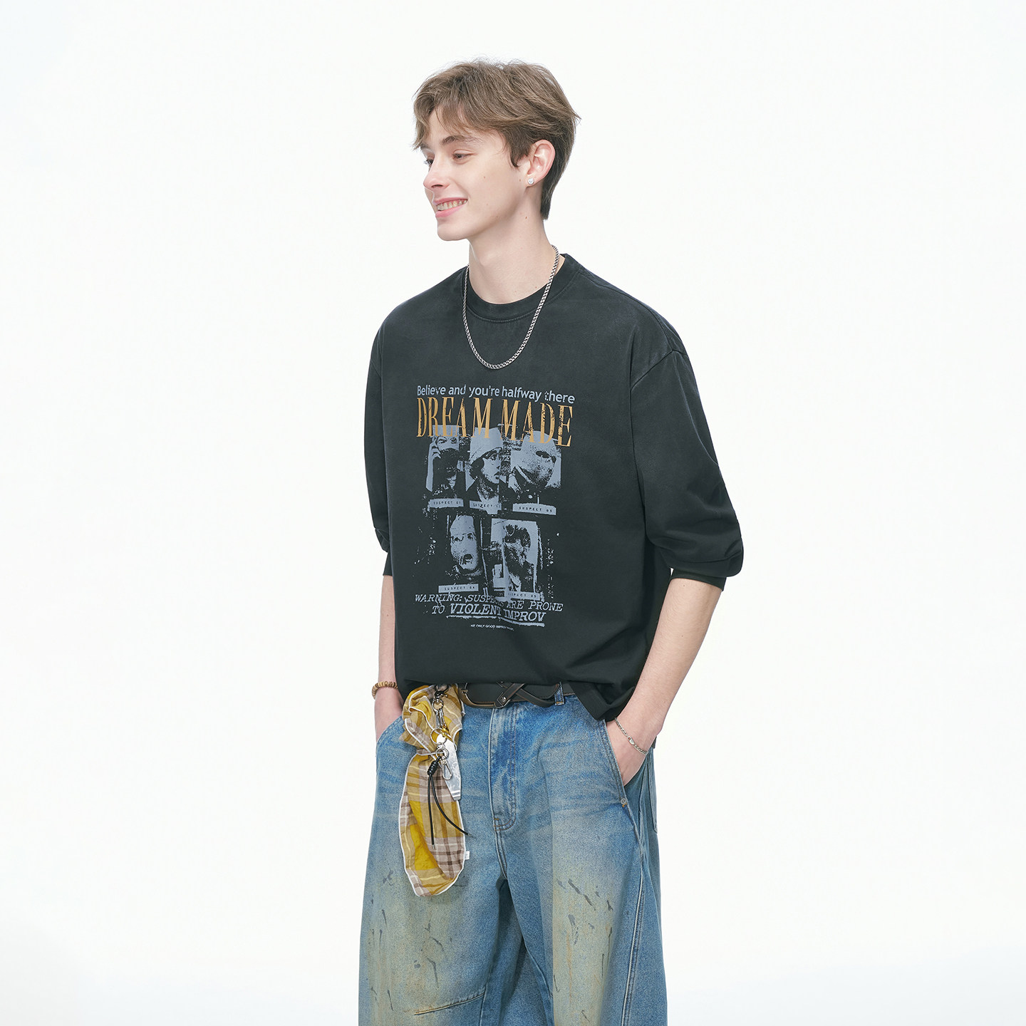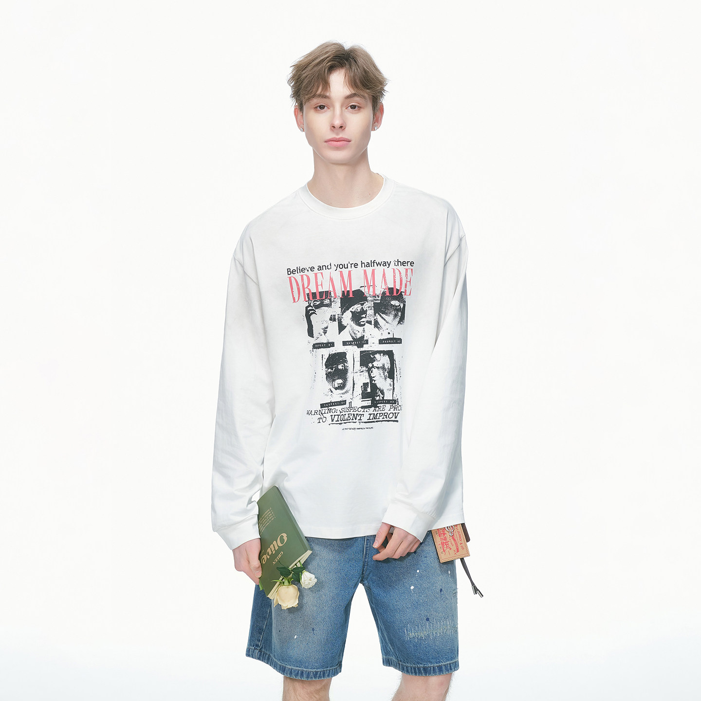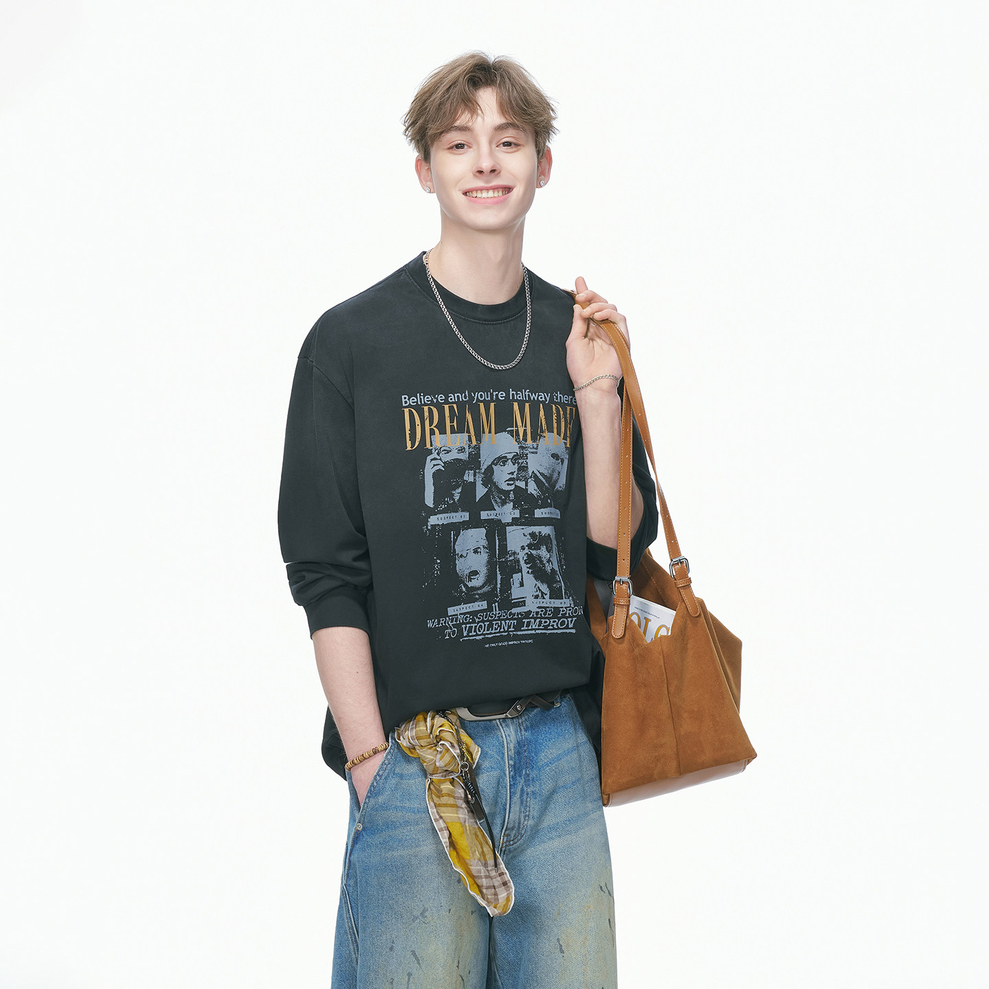 Dream made美式vintage人物印花长袖T恤男款春秋季水洗重磅打底衫