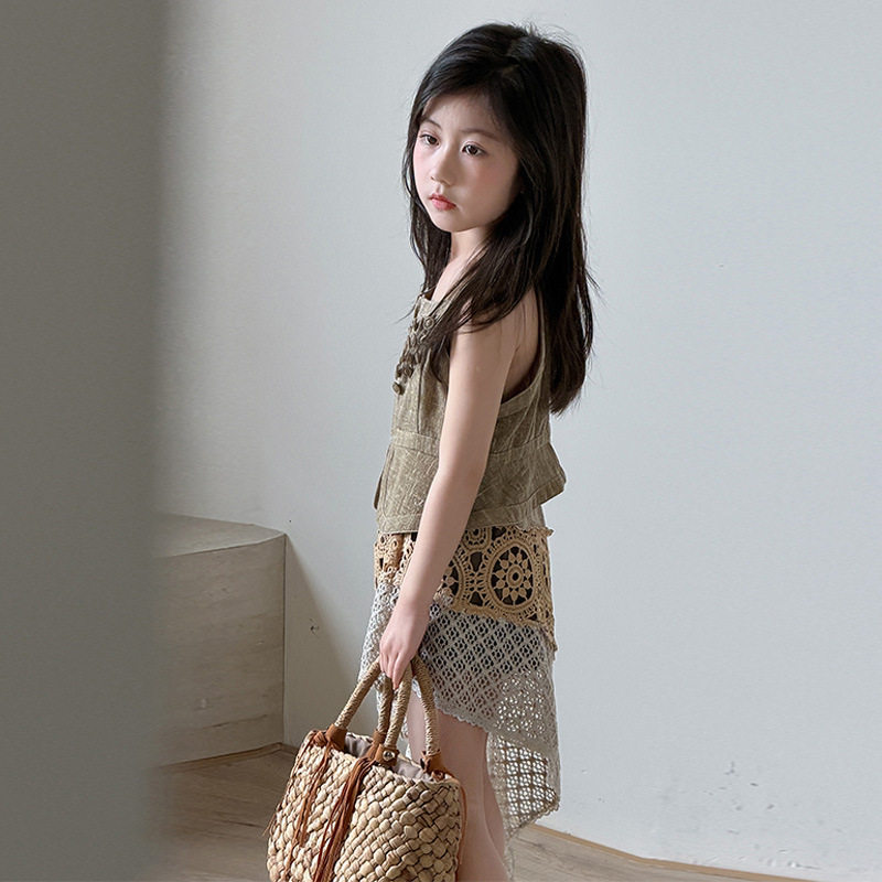 女童夏季套装薄款洋气时髦吊带儿童时尚不规则针织镂空短裙两件套