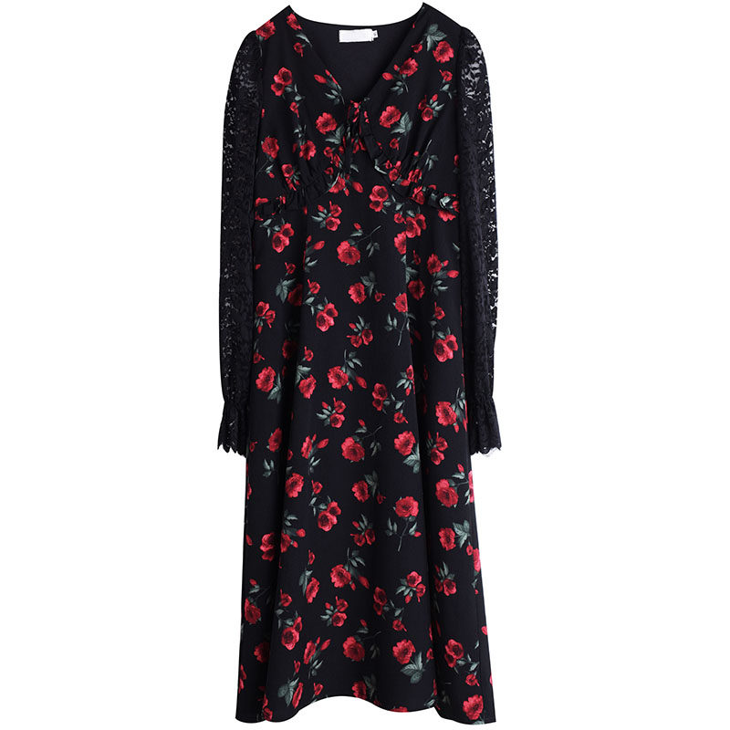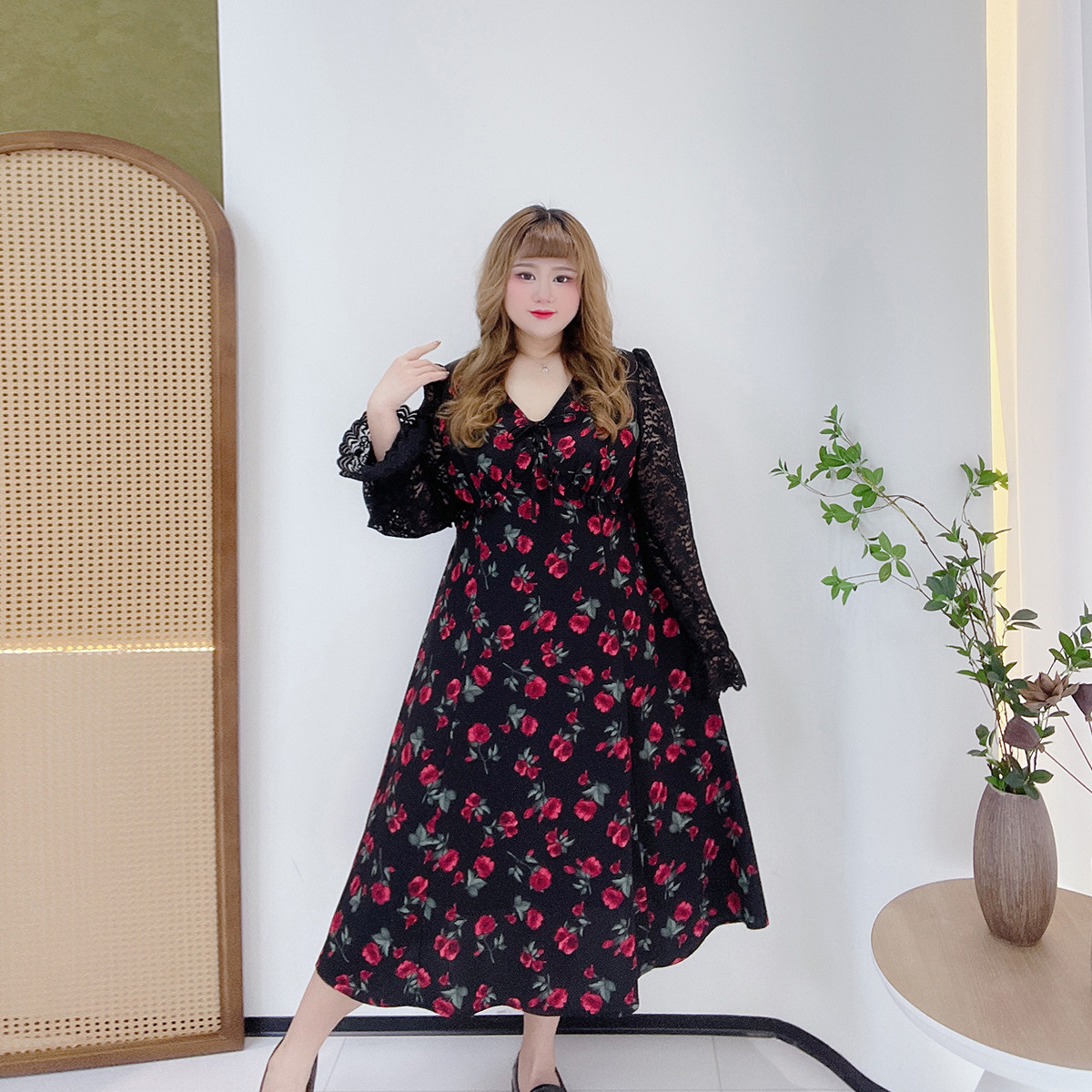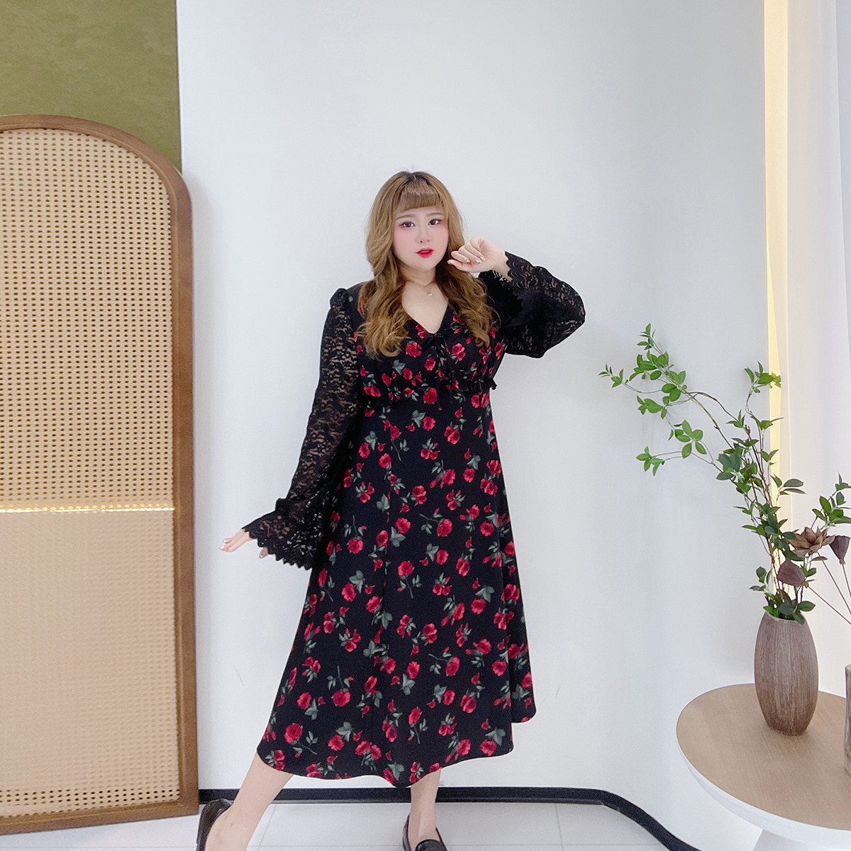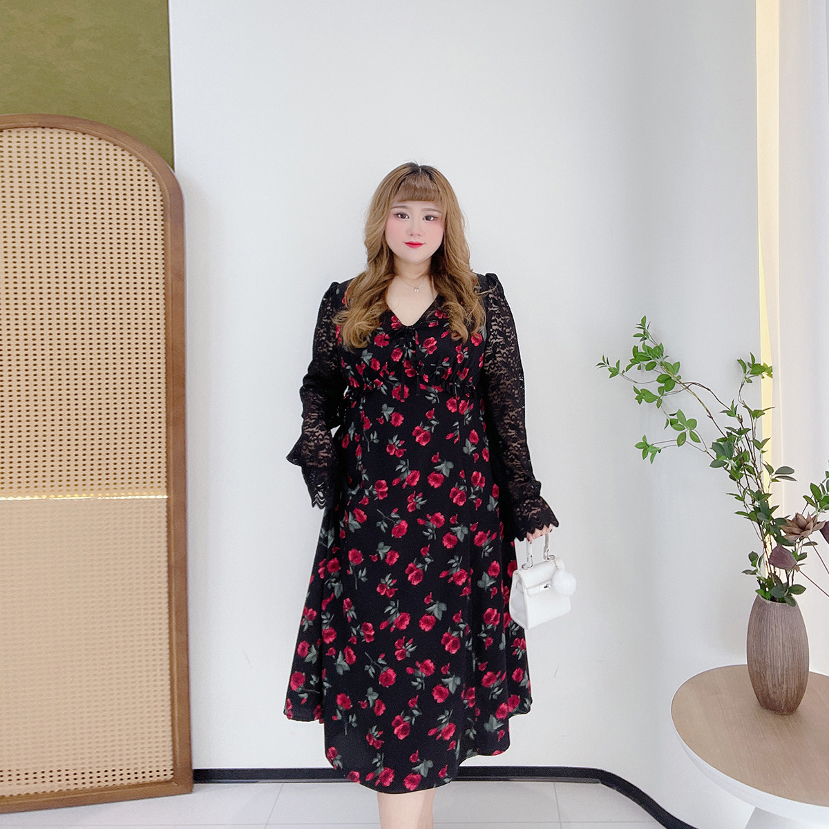 不撞款性感蕾丝泡泡袖长裙胖仙女莹莹大码女装胖mm玫瑰碎花连衣裙
