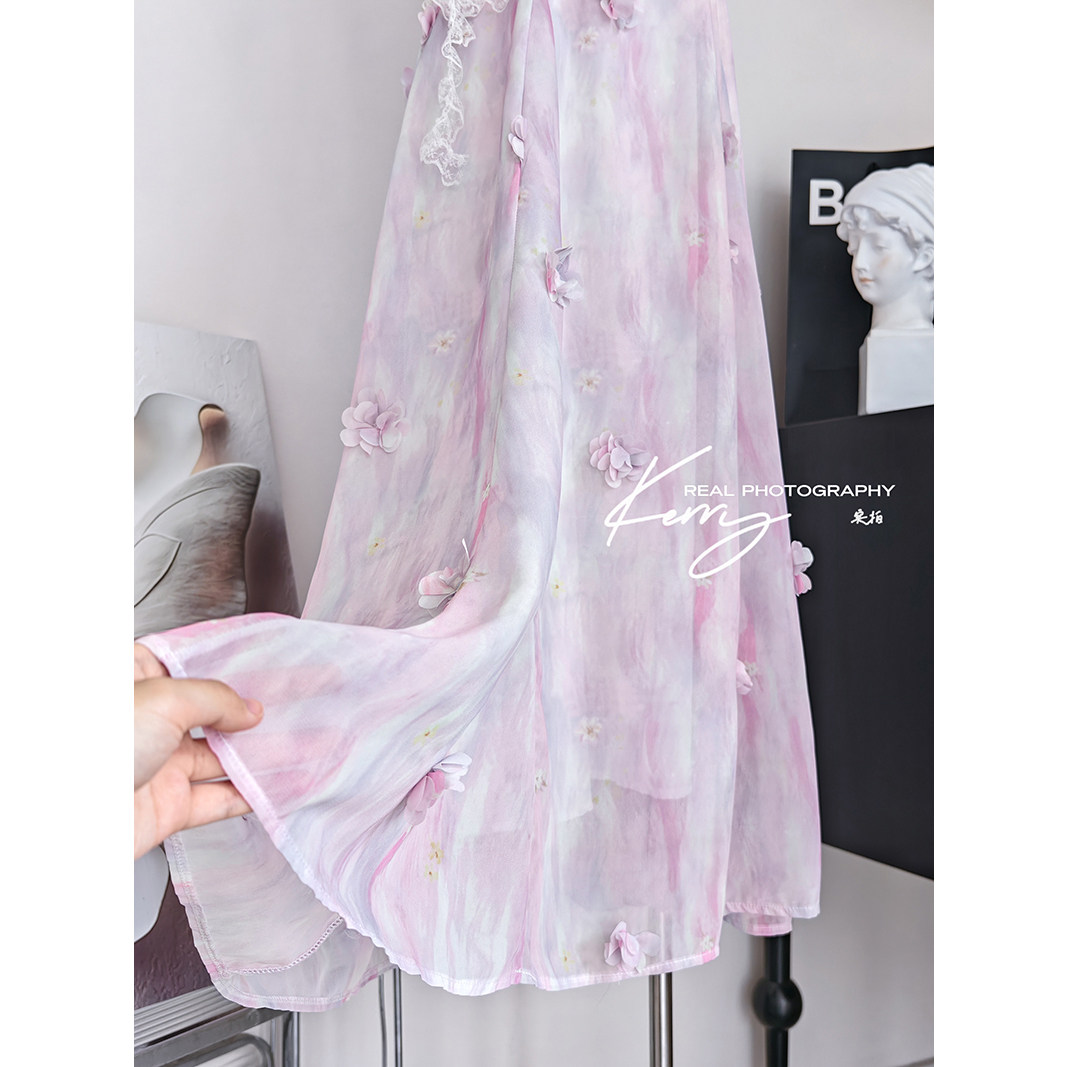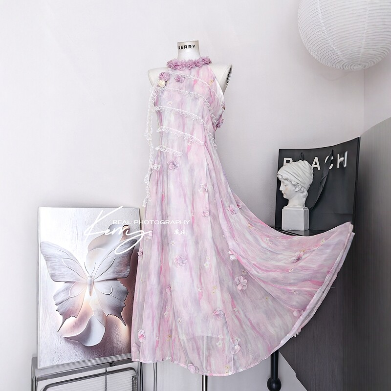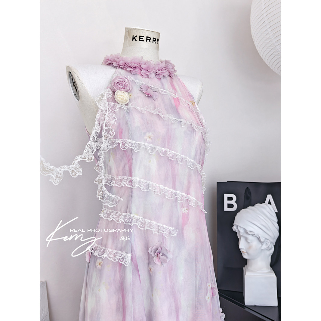 Kerry 紫色长款挂脖吊带连衣裙女夏季法式复古修身显瘦气质裙子