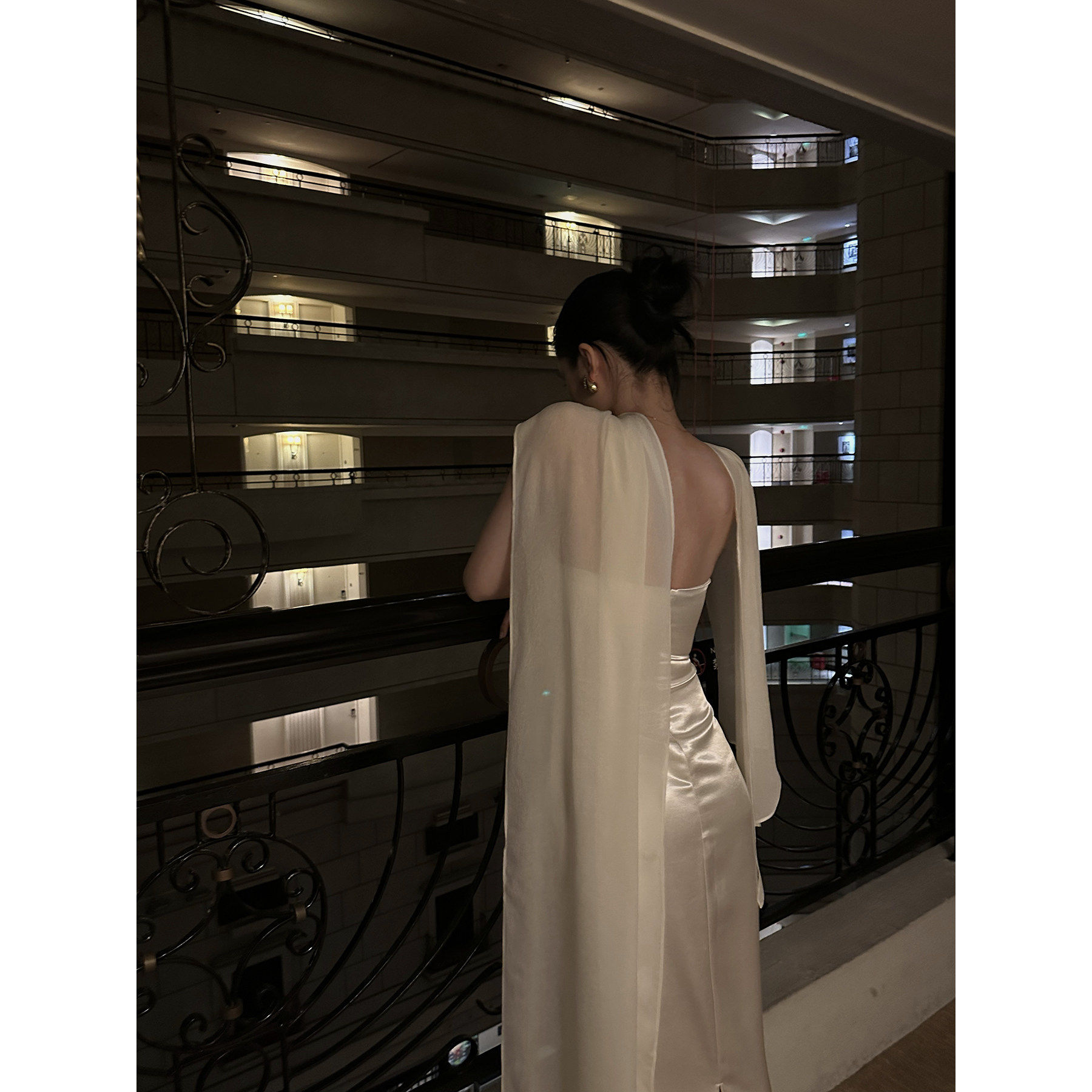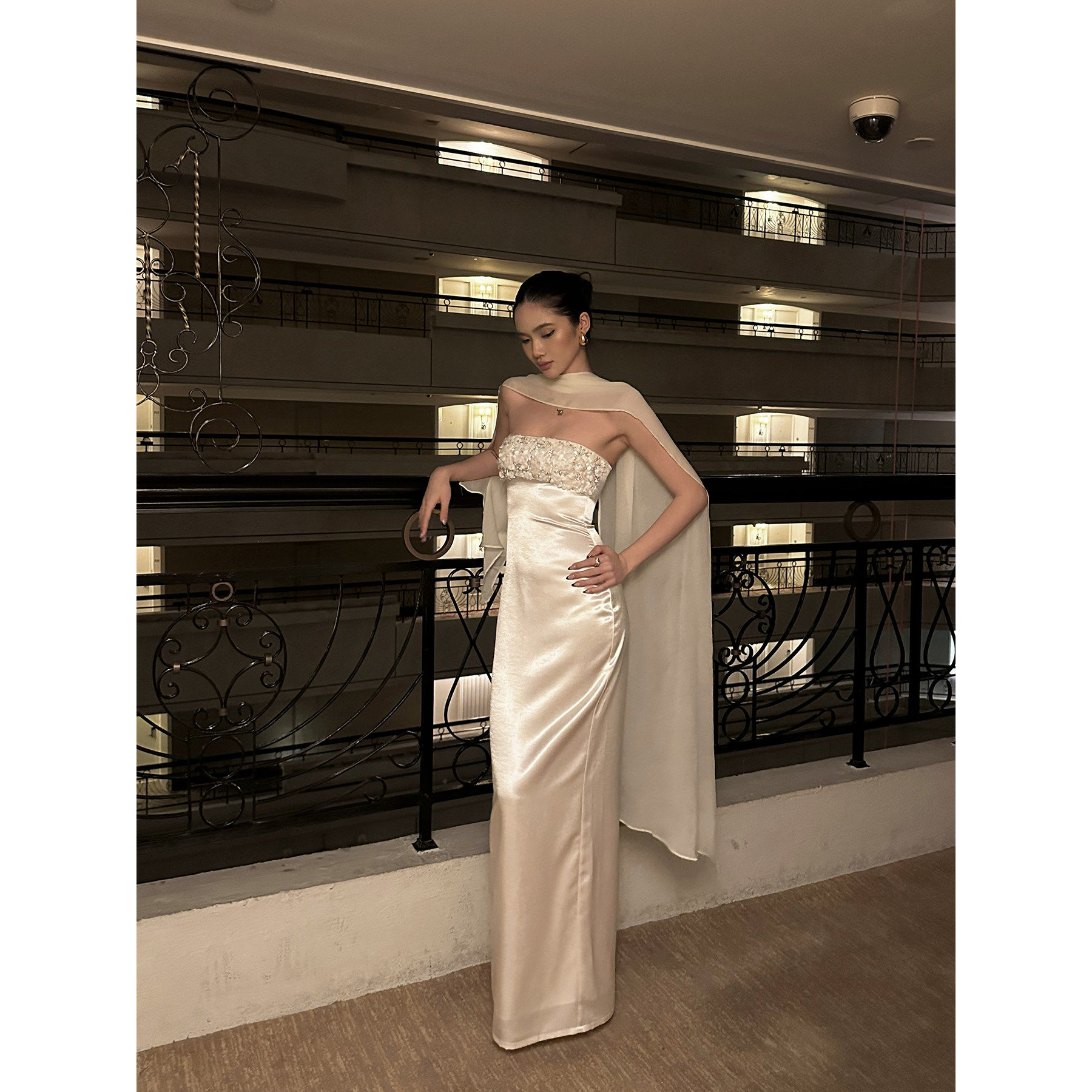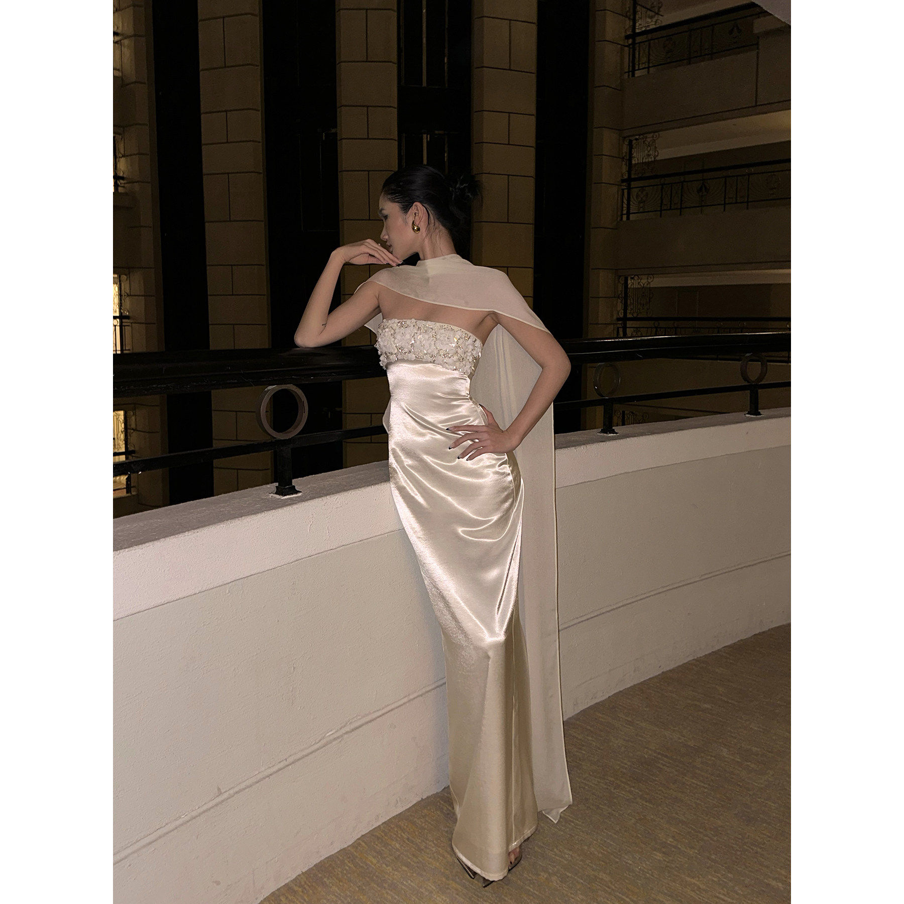 rovente 流光盛宴白色抹胸连衣裙女修身显瘦披肩亮片名媛礼服长裙