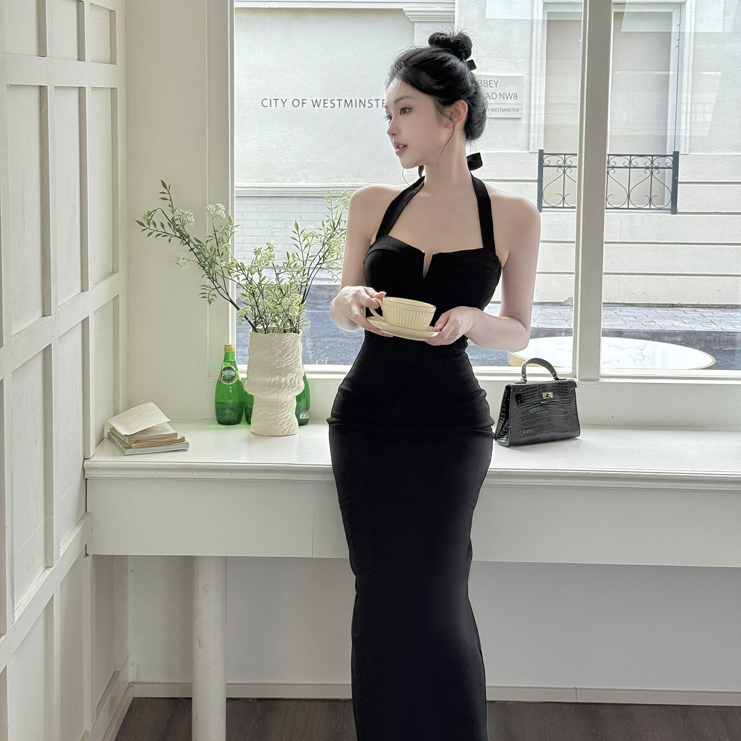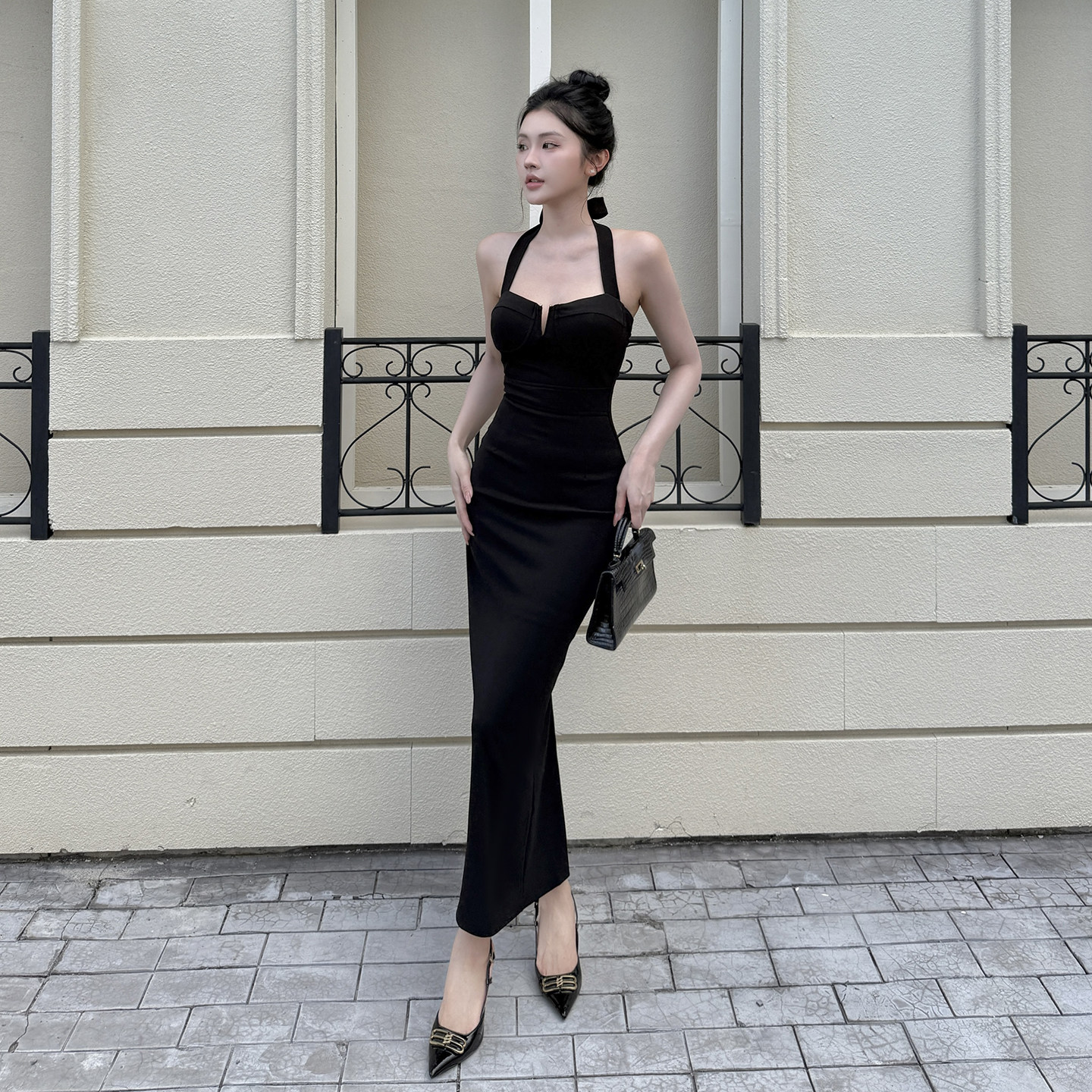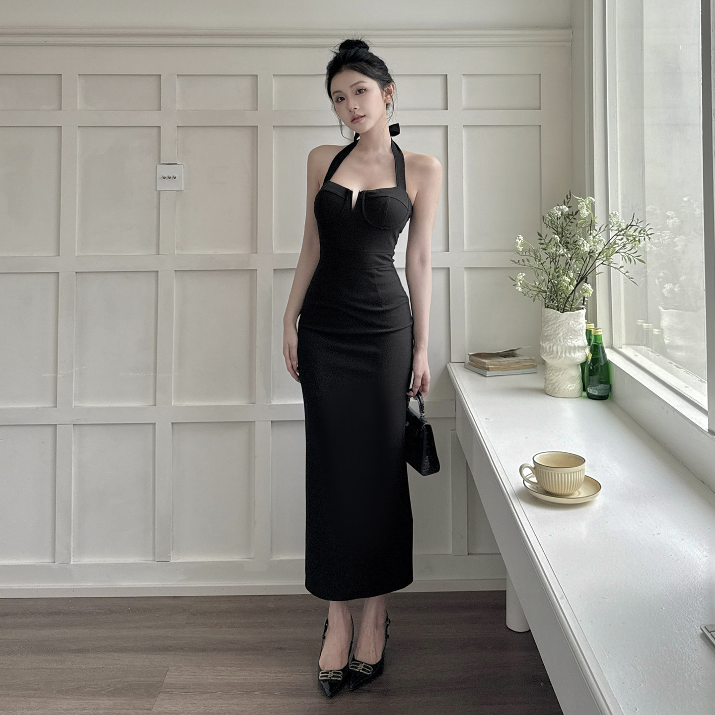 GirlsAt18 黑色挂脖吊带连衣裙女法式高级生日小黑裙气质修身长裙