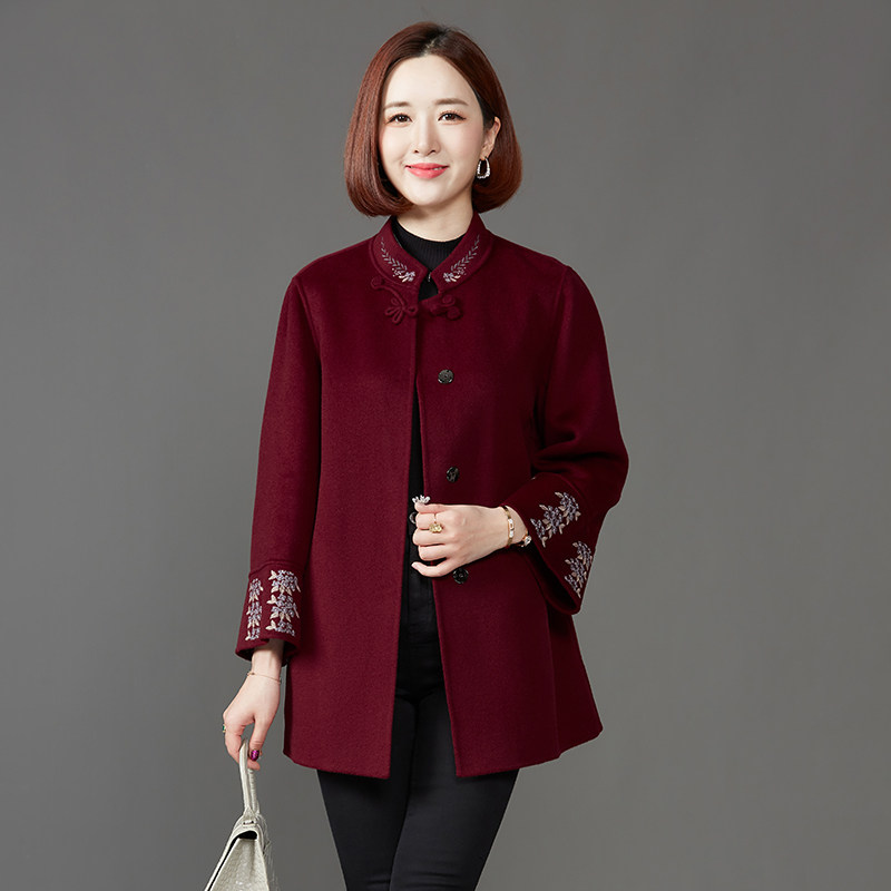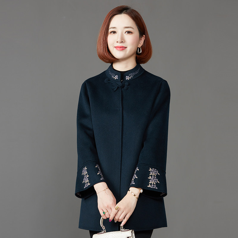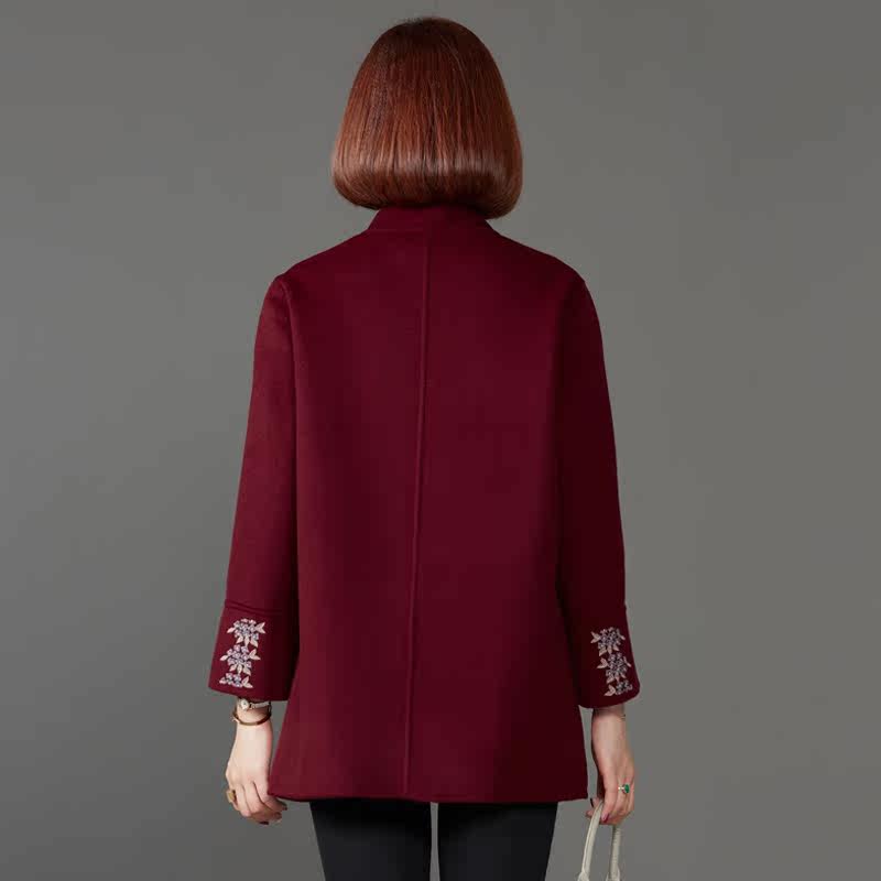民族风双面羊绒大衣女士短款直筒正肩立领绣花宽松中老年呢子外套