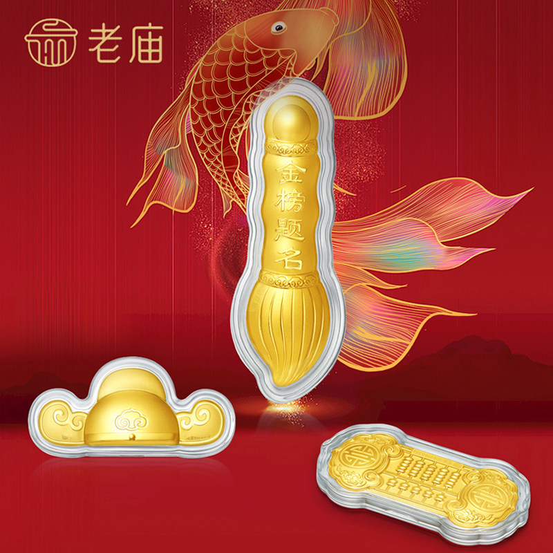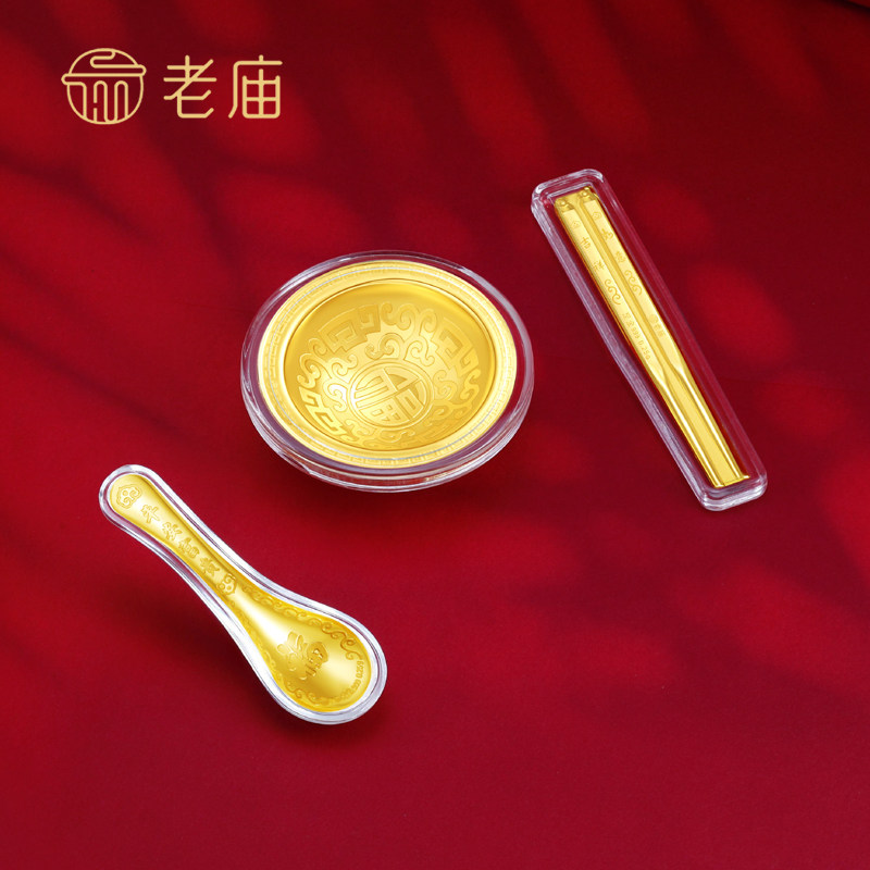 老庙黄金 祝福金碗筷勺三件套 金榜题名足金摆件 礼赠佳品XQD