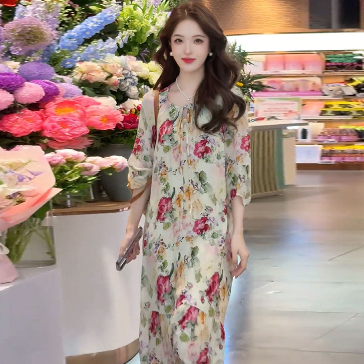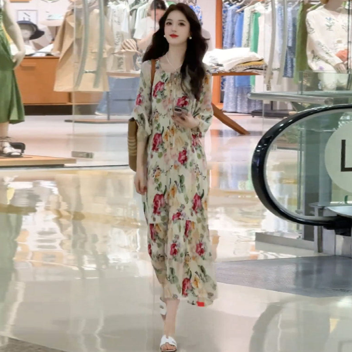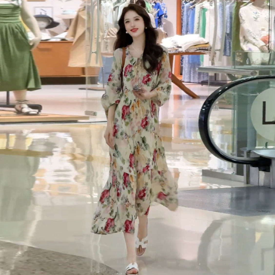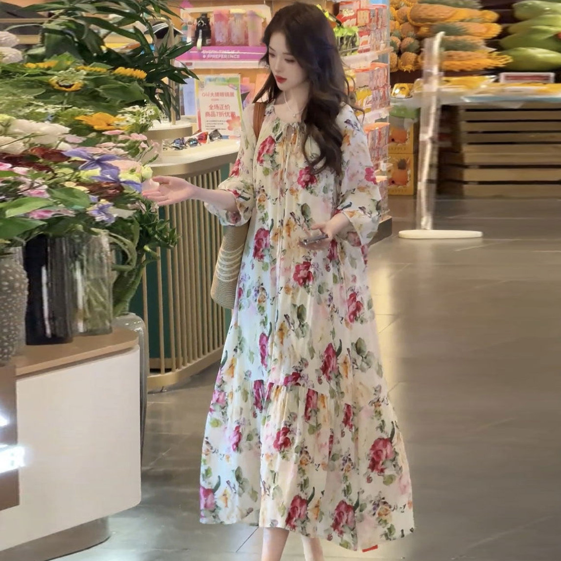 高级感宽松法式印花连衣裙女2026夏季新款时尚中长款遮肉显瘦裙子