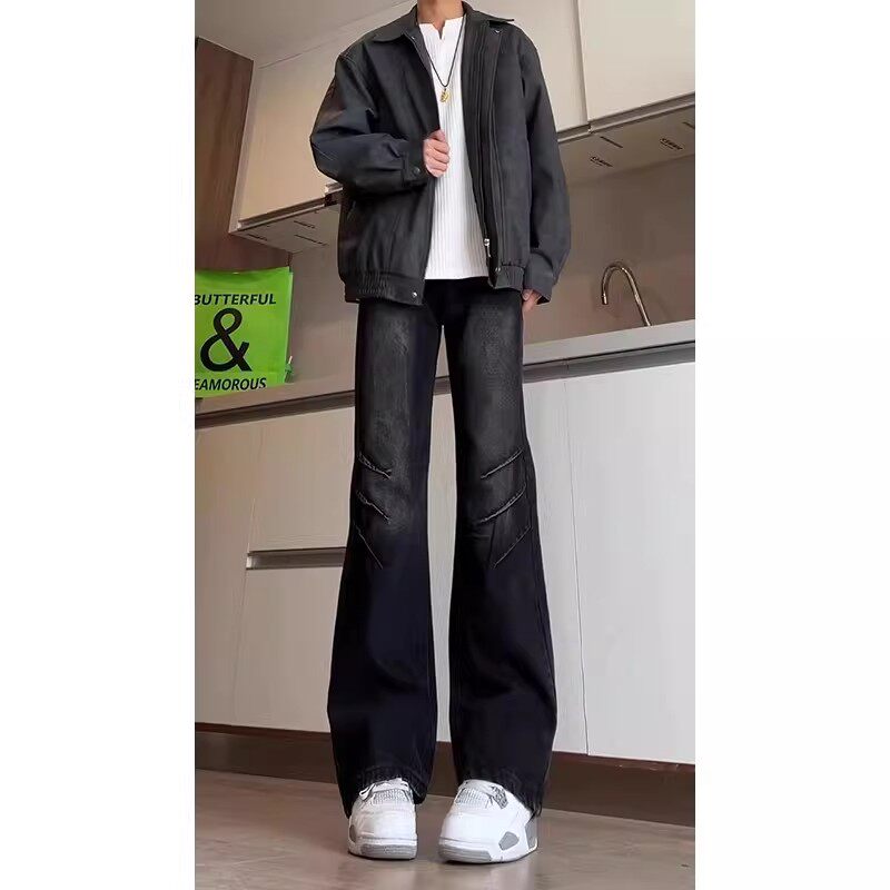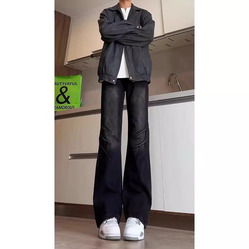 美式复古黑色弯刀牛仔裤男款潮牌高街vibe裤子水洗修身直筒微喇裤