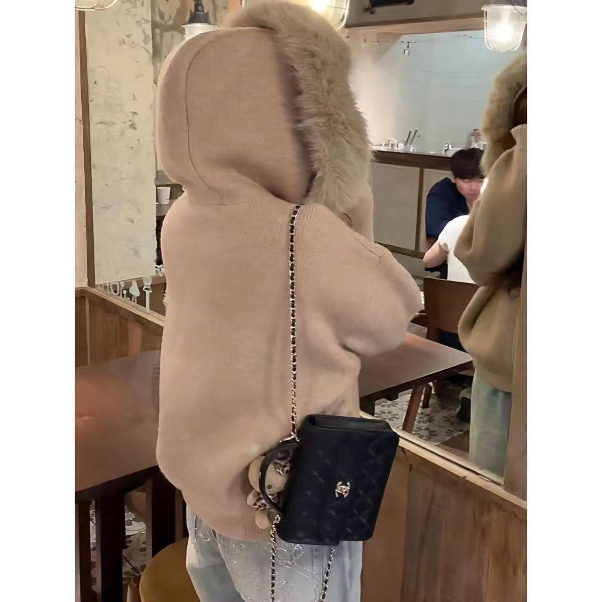 韩系高级感大毛领连帽针织开衫毛衣女秋冬宽松加厚外穿慵懒风外套