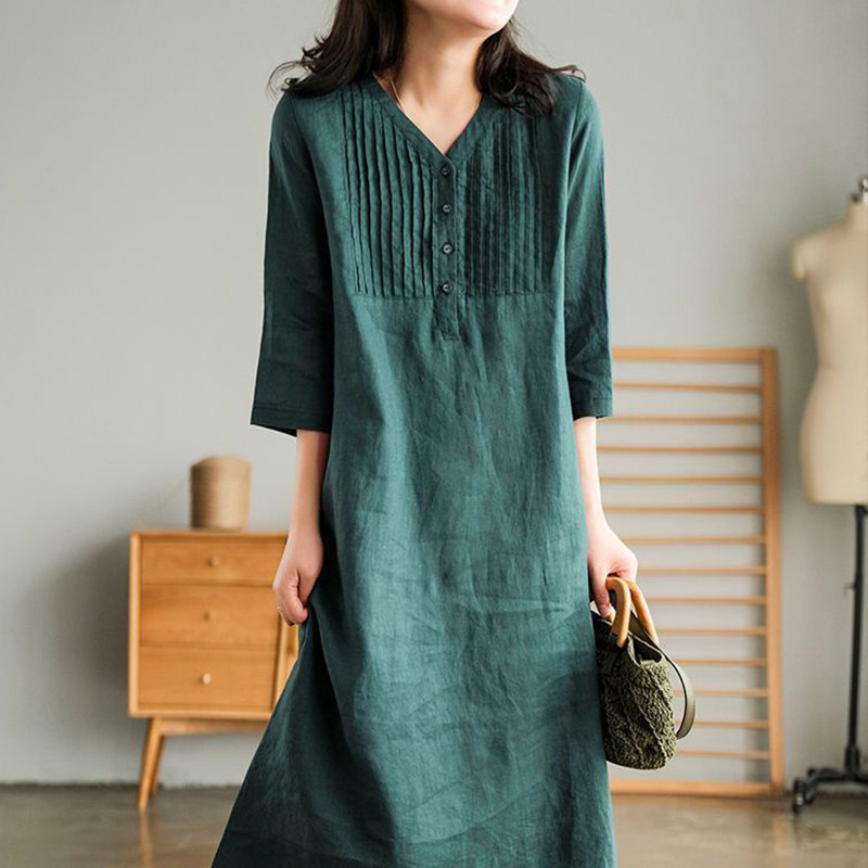 慵懒风文艺休闲连衣裙短袖V领棉麻裙子女2026夏季新款中长款宽松