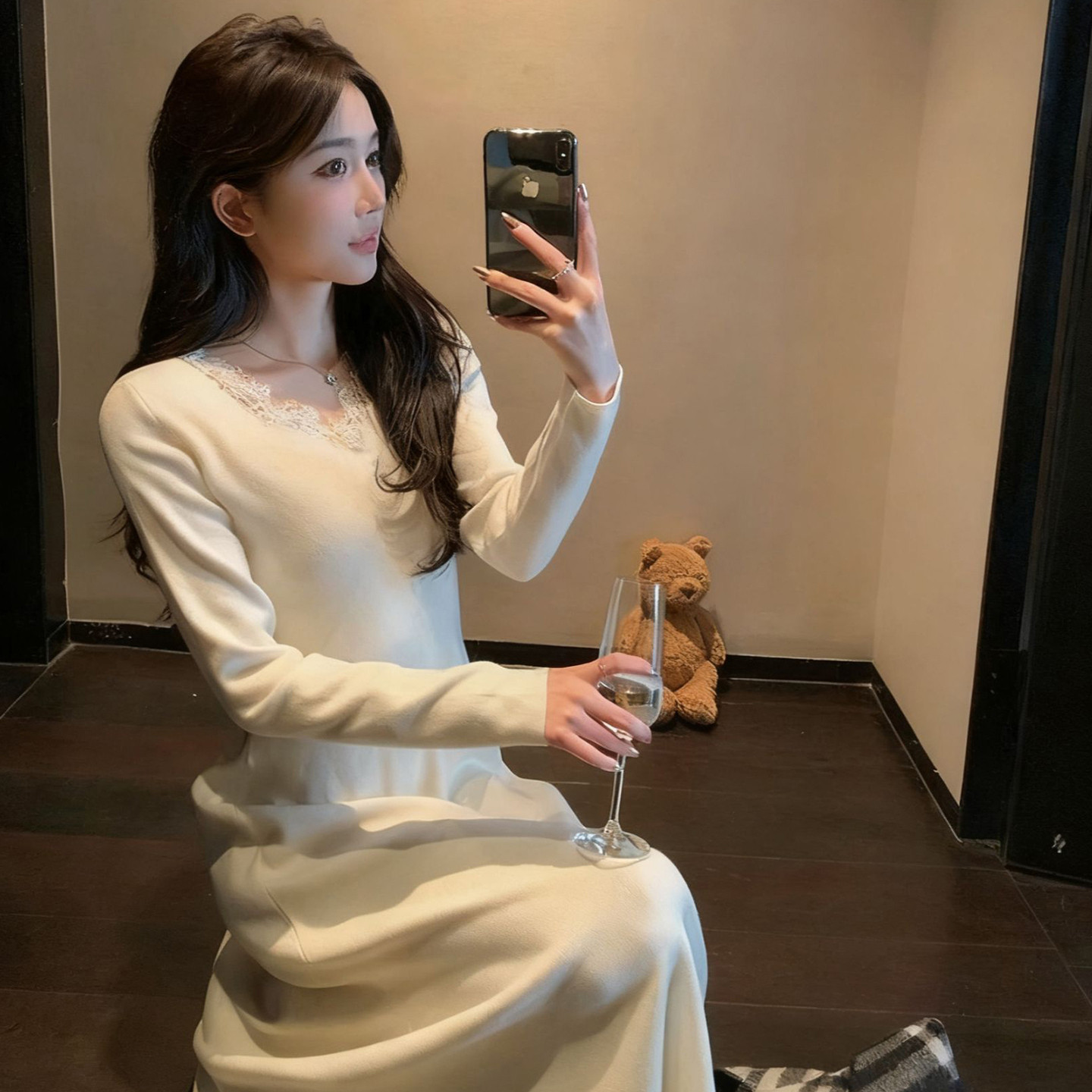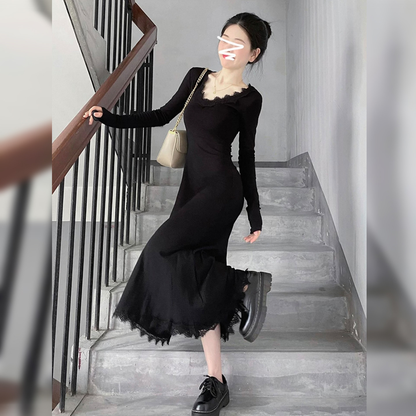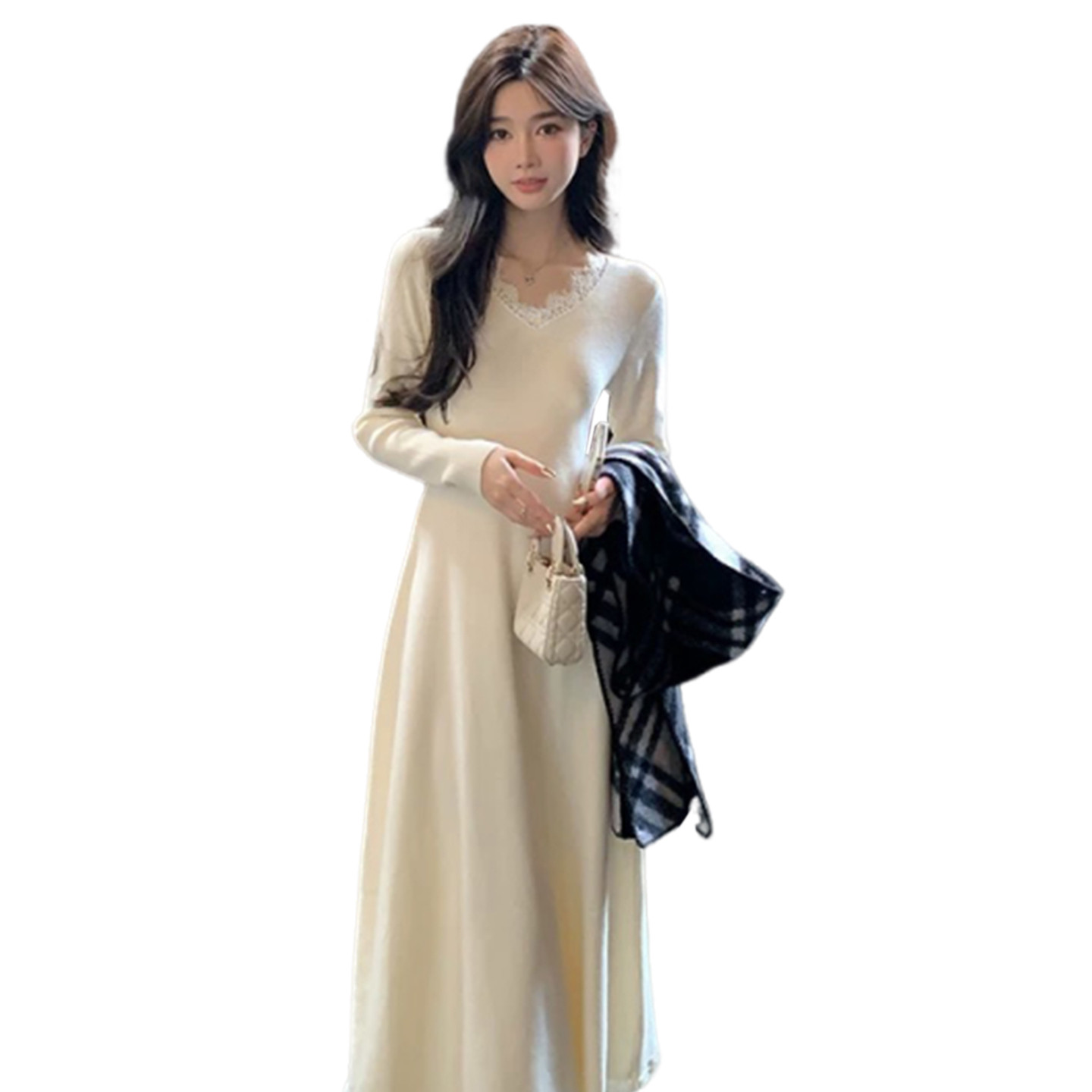 法式白色蕾丝边V领长袖A字长裙秋冬季洋气修身打底显瘦连衣裙子女