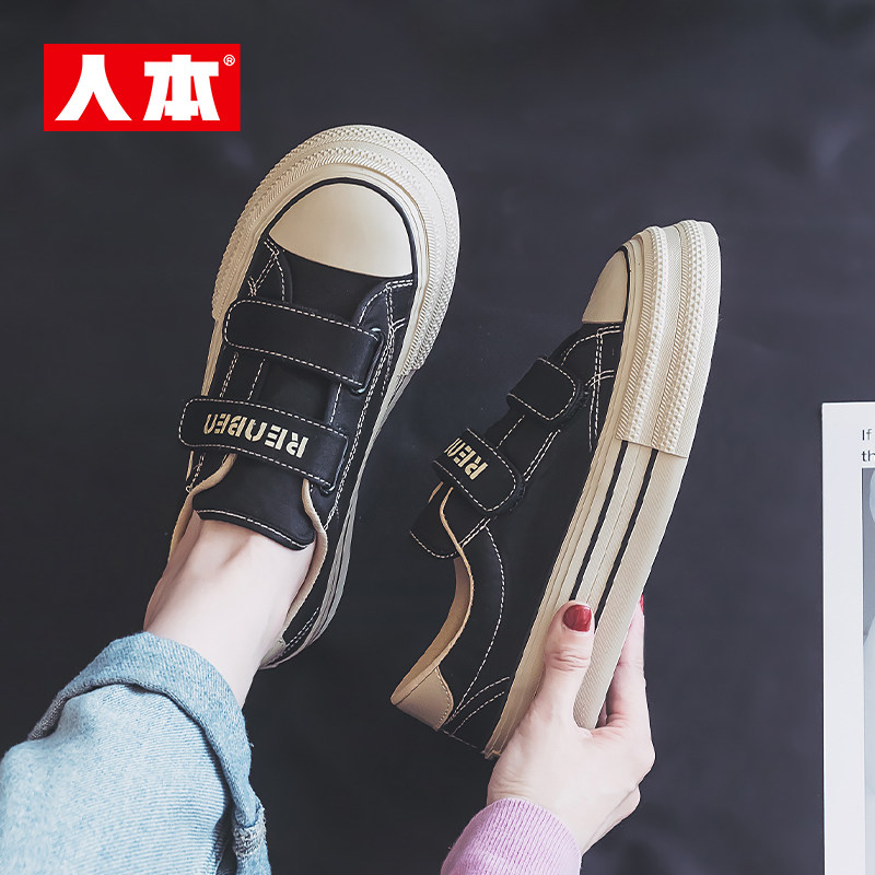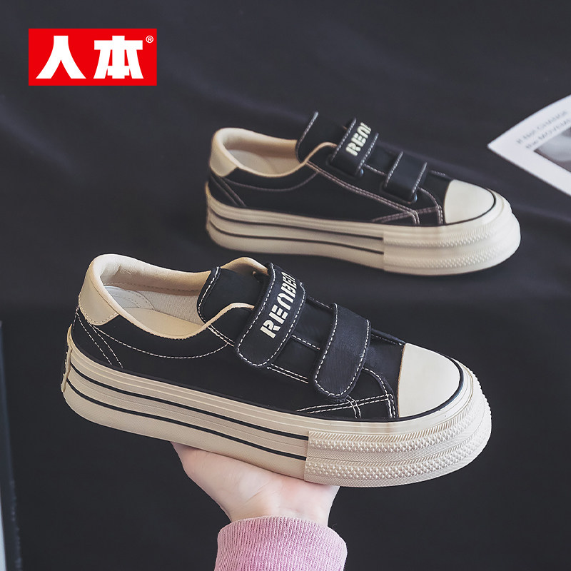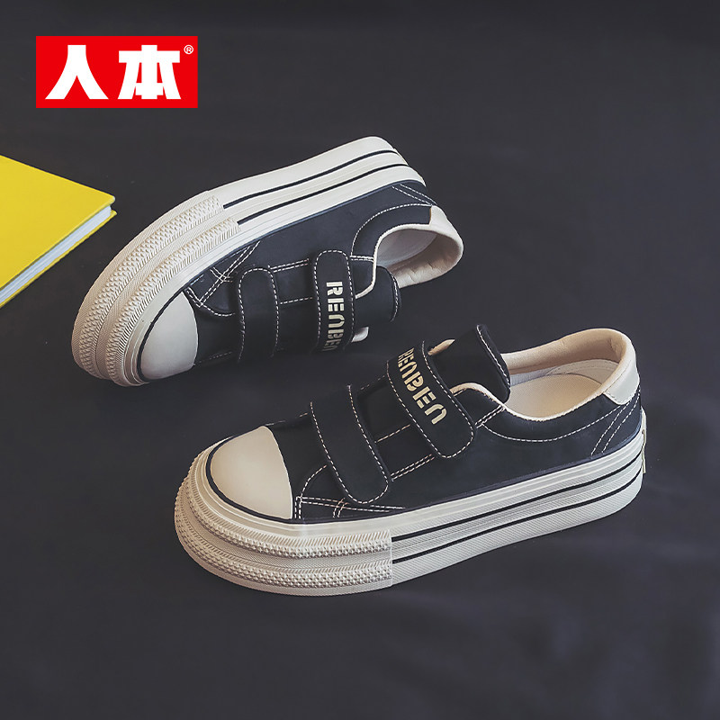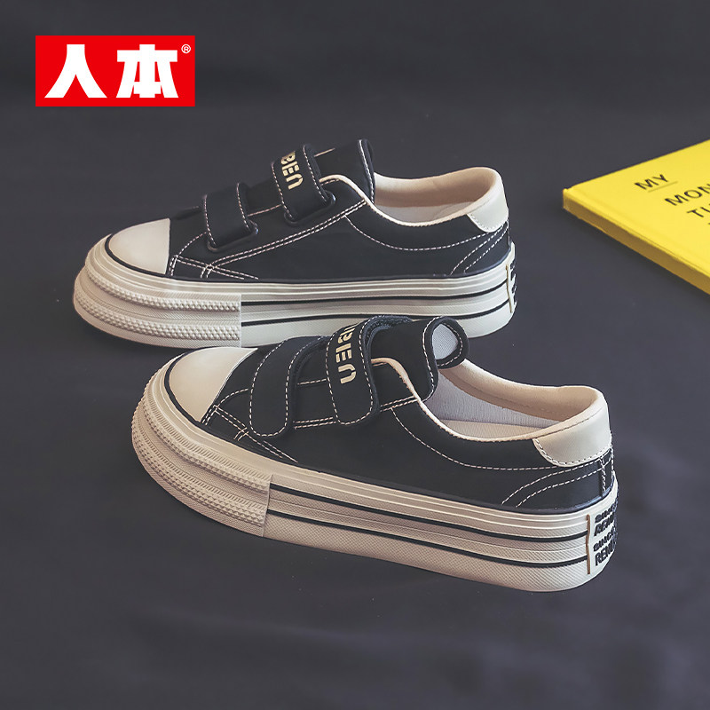 人本帆布鞋女2026春季新款厚底增高女鞋魔术贴休闲粘扣学生板鞋子