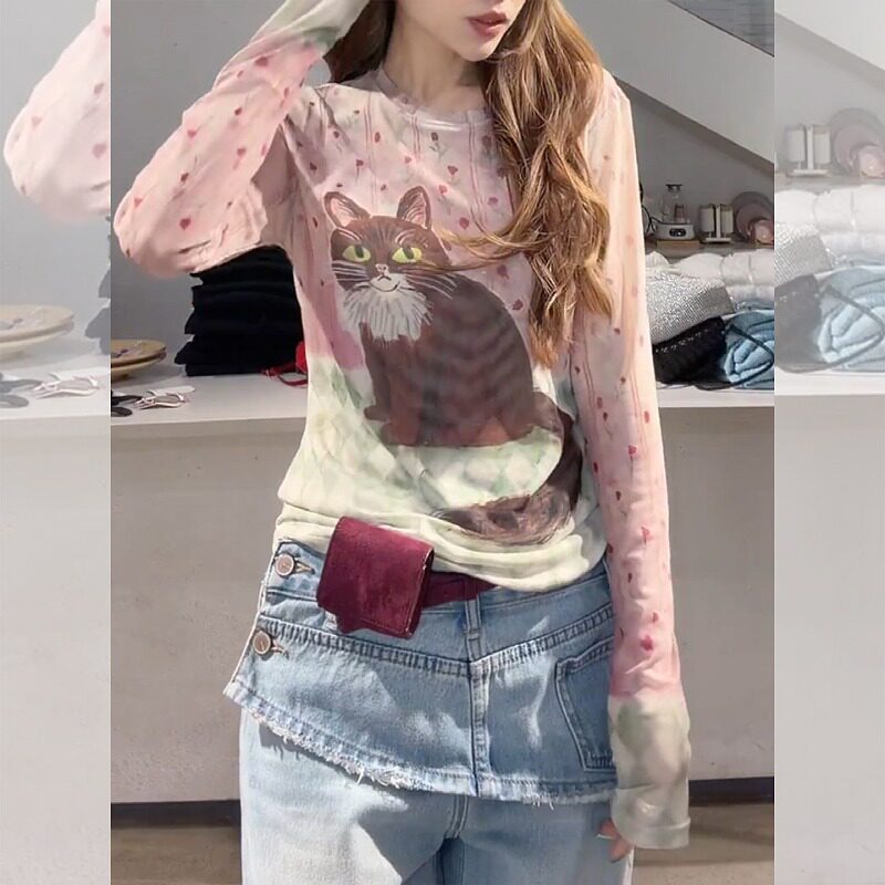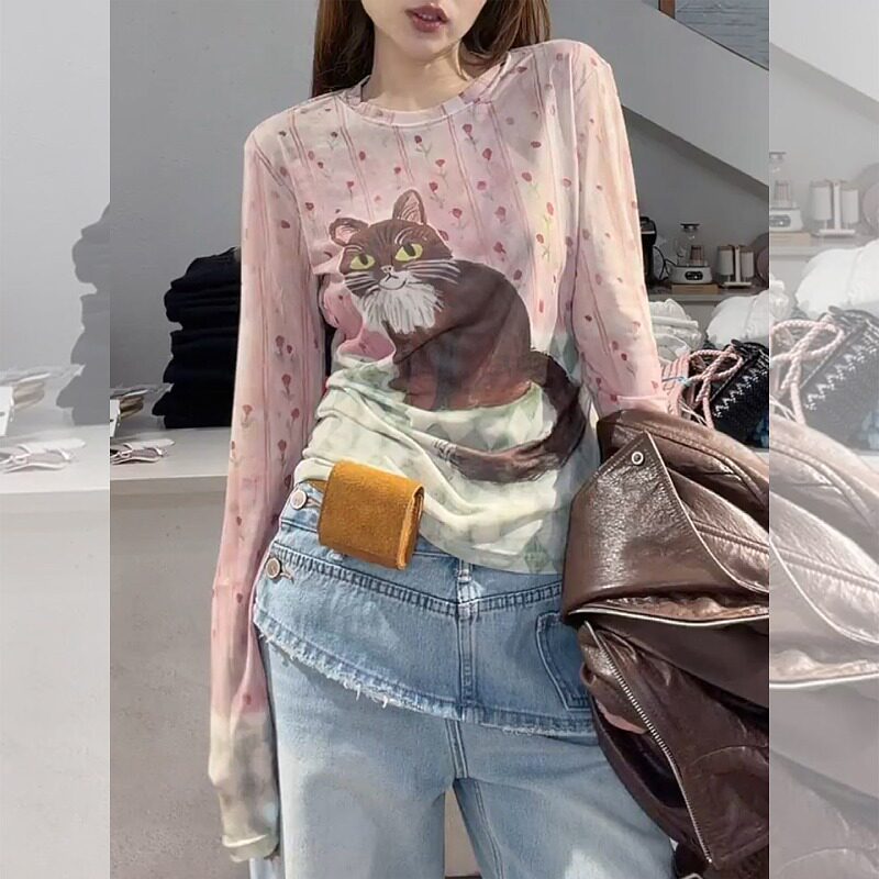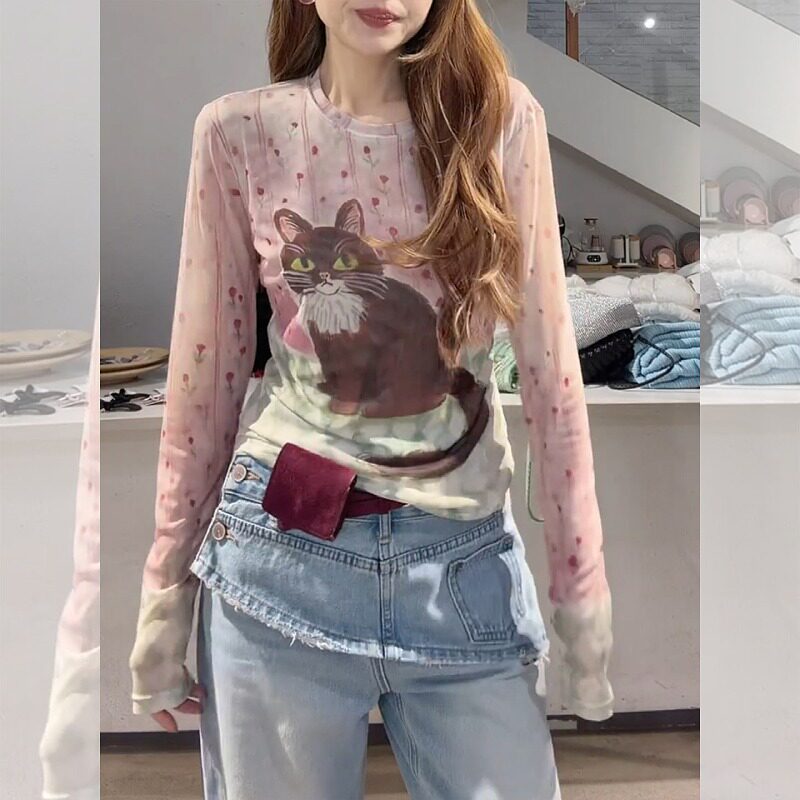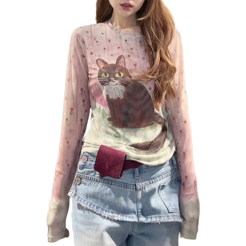 大码微胖mm粉色小猫网纱长袖t恤女2026春季新款修身绝美圆领上衣