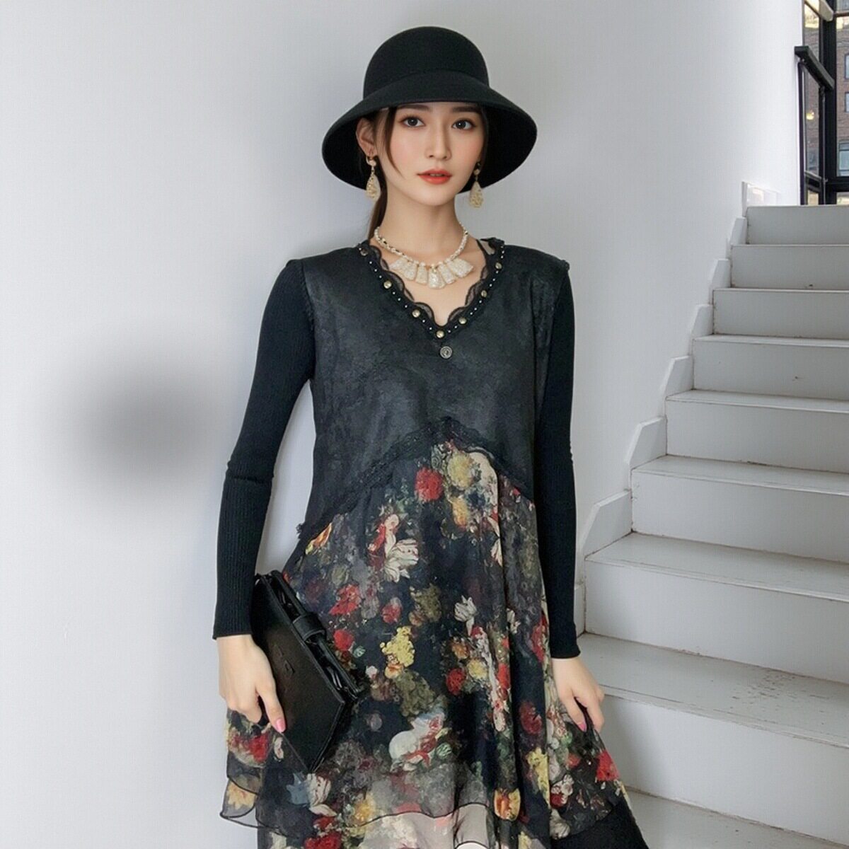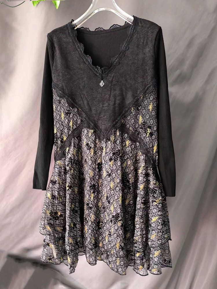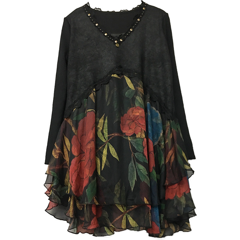 民族风加绒长袖连衣裙V领中长款秋冬雪纺拼接大摆打底裙遮肚显瘦