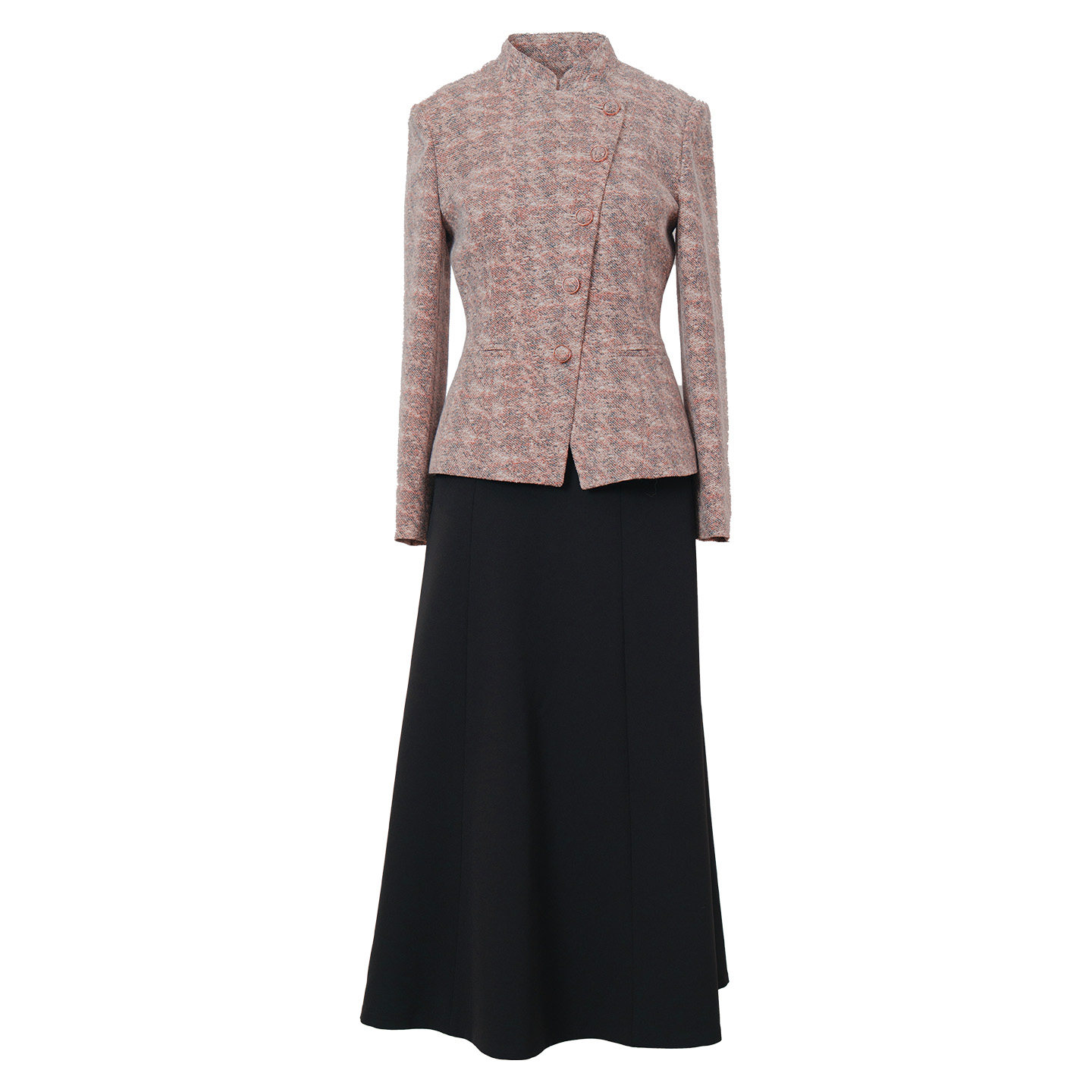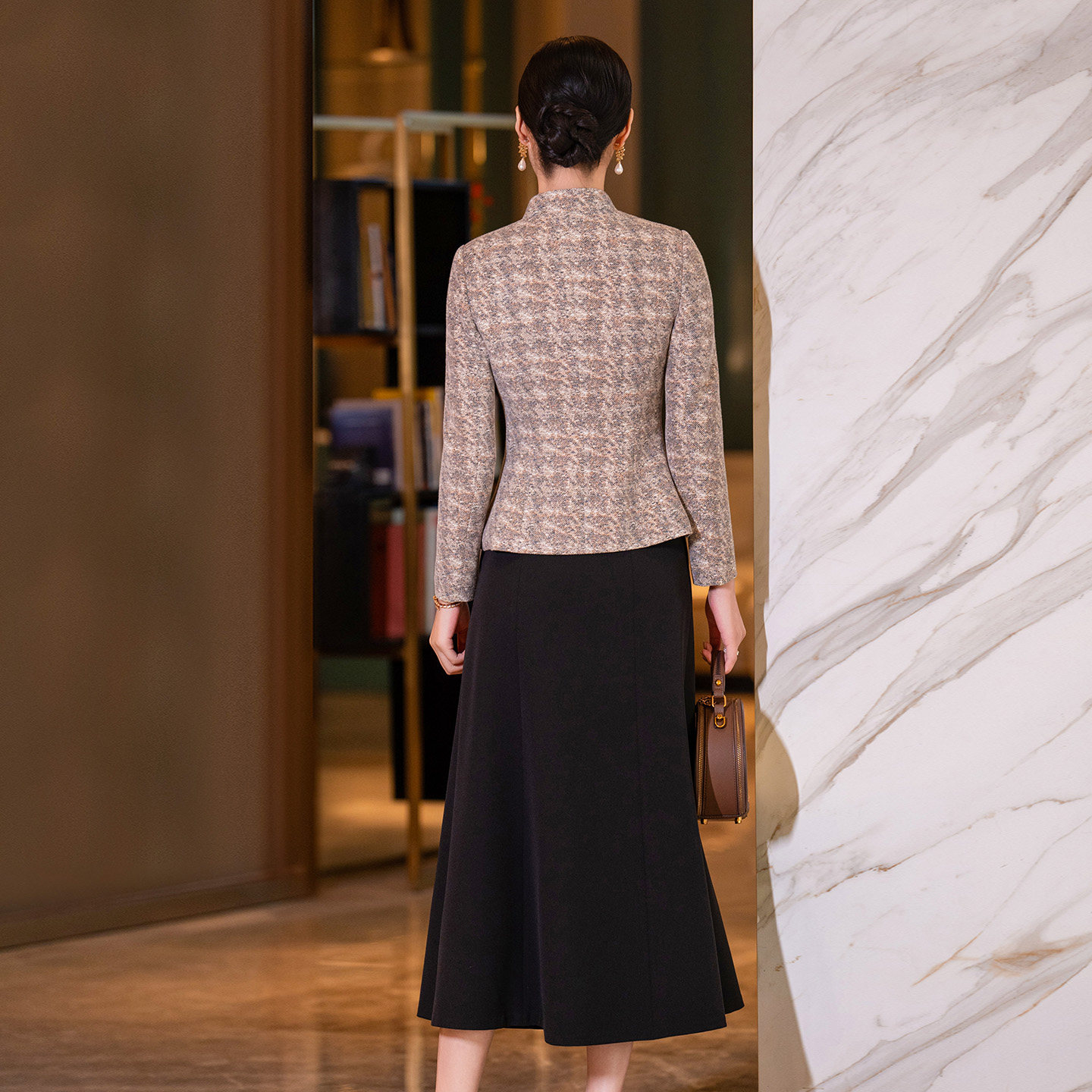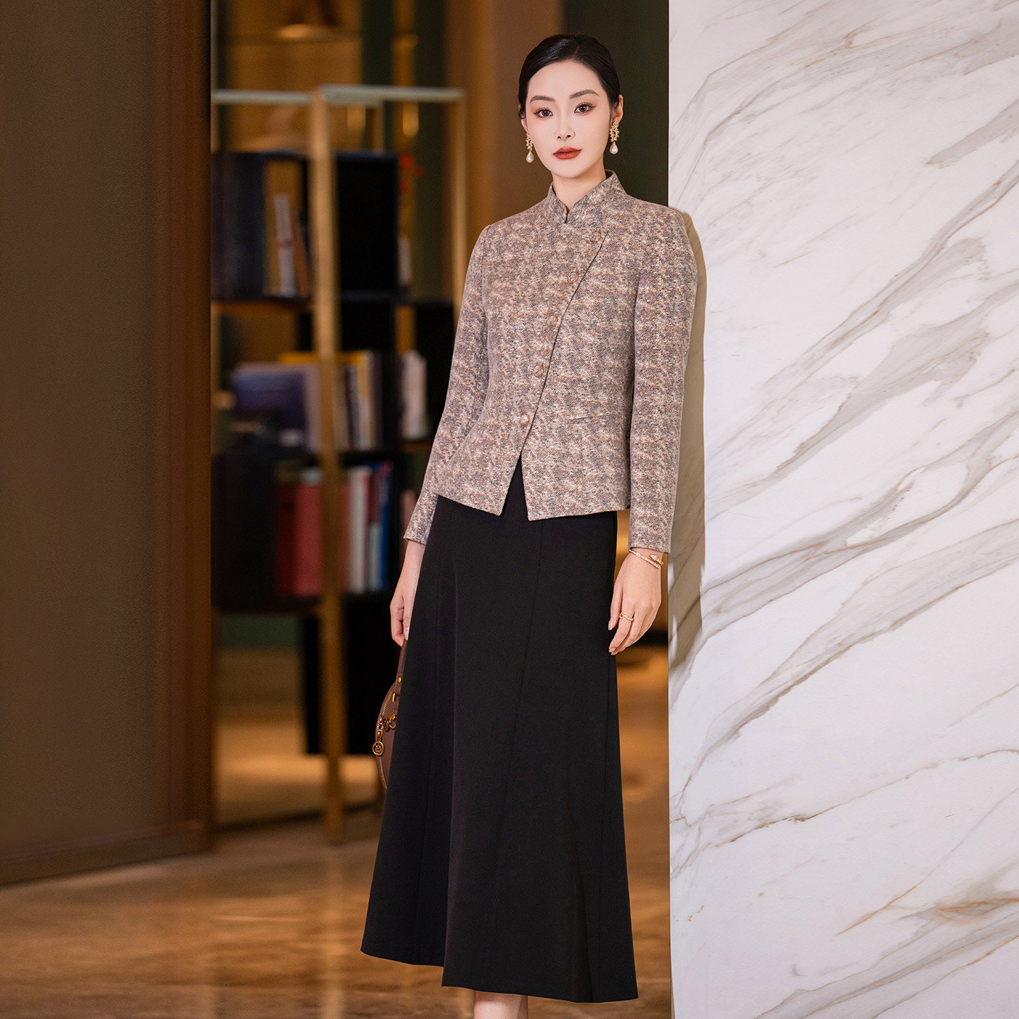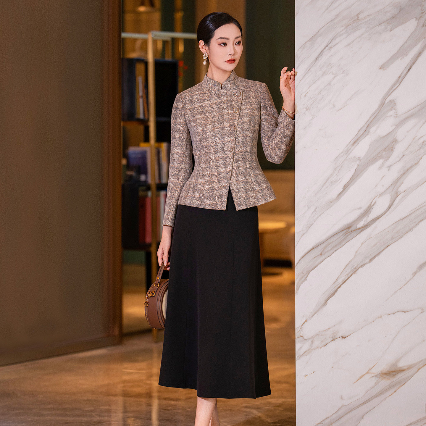 毛呢套装裙女2026春季新款女装咖色立领西装外套修身半身裙两件套