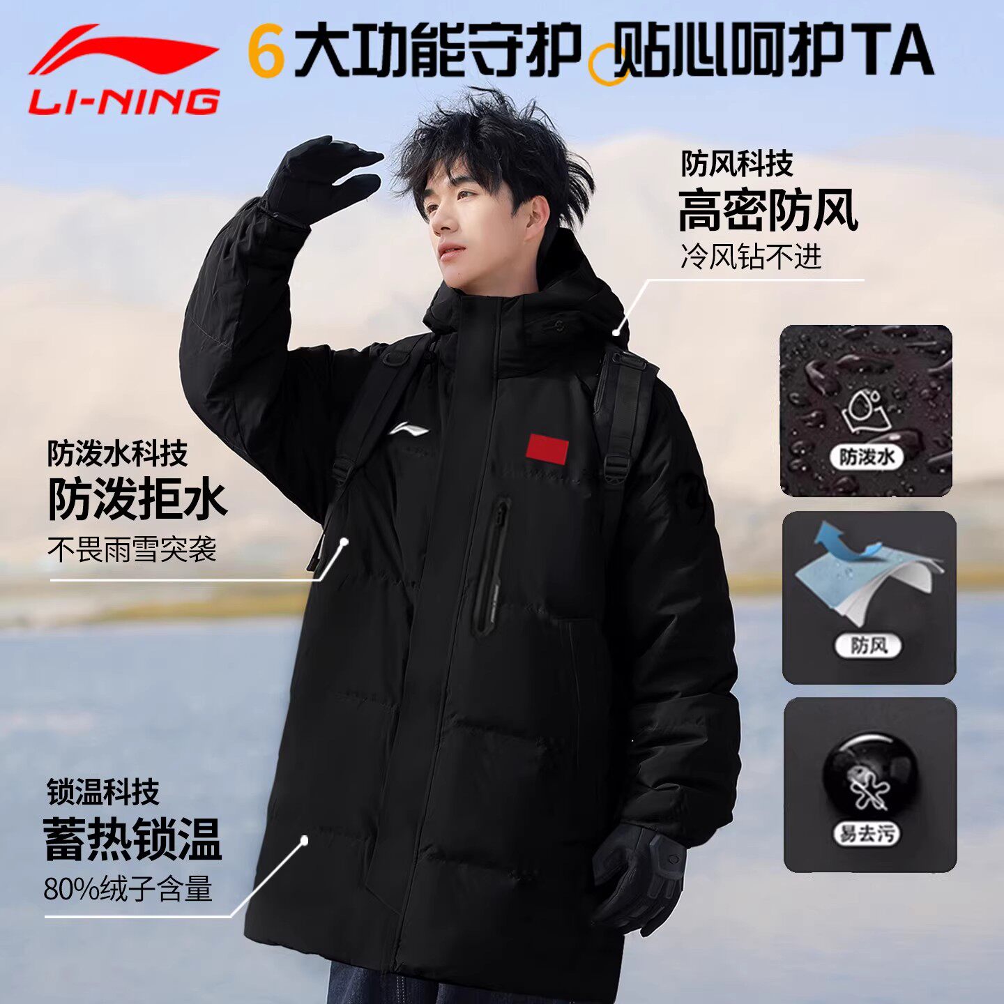 李宁中长款羽绒服男生2025新款冬季青少年学生国标鸭绒情侣带旗