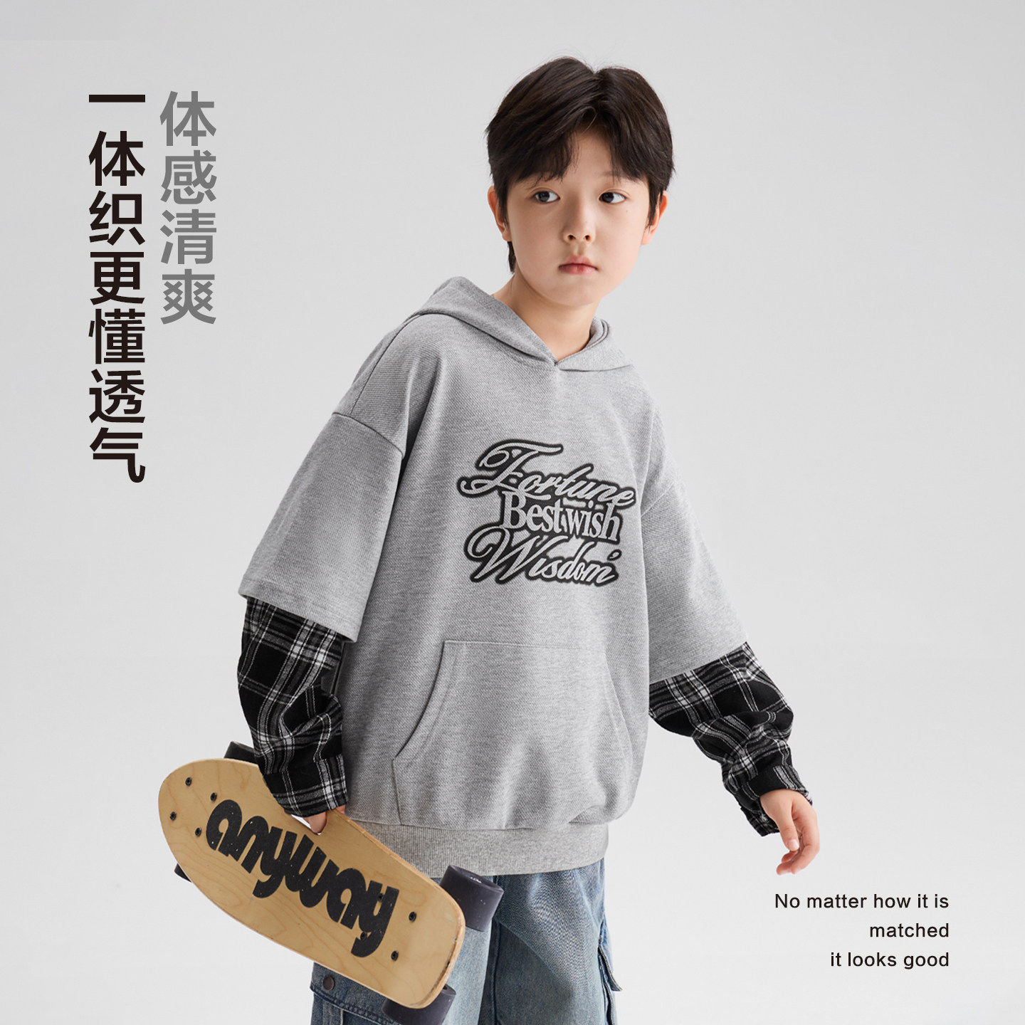 左西童装男童假两件连帽卫衣春装2026新款儿童帅气男孩春秋款上衣