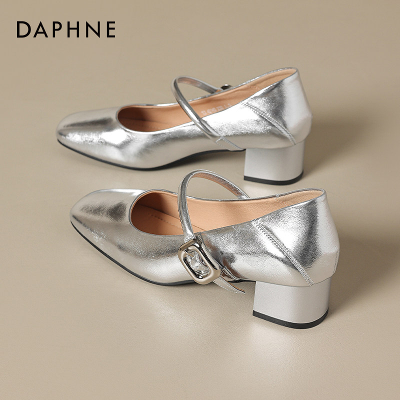 达芙妮银色粗跟玛丽珍鞋2026新款春夏方头高跟单鞋配裙子女鞋皮鞋