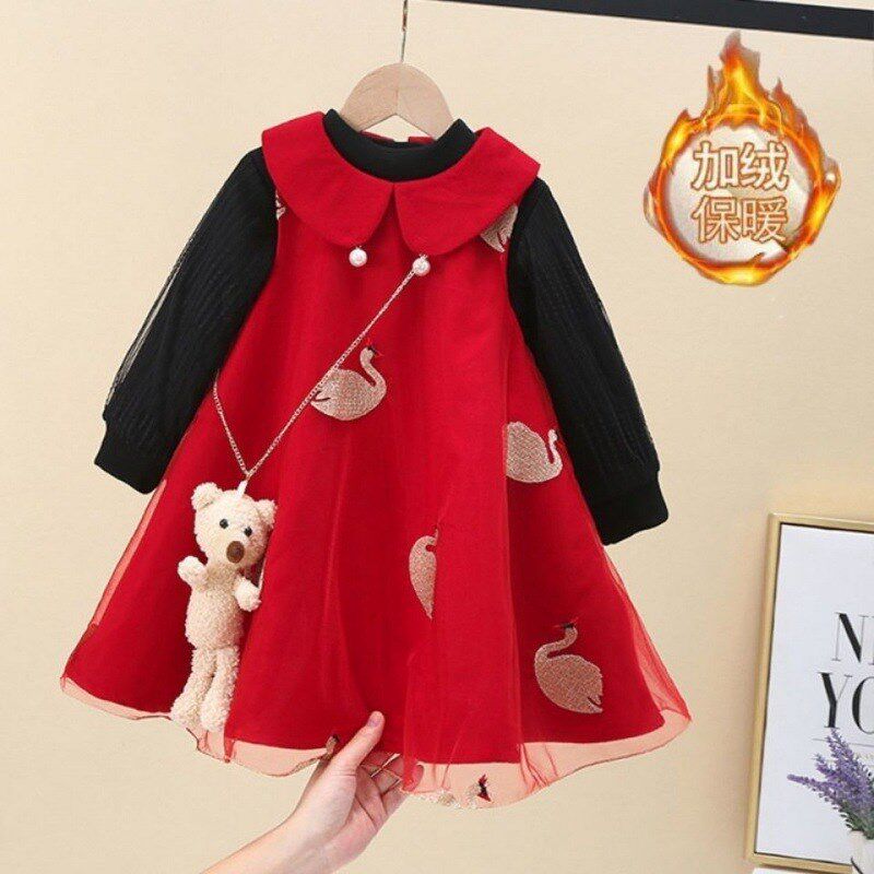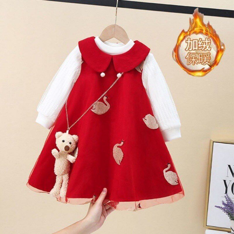女童毛呢背心裙2024秋冬宝宝加绒加厚红色呢子拜年服连衣裙两件套