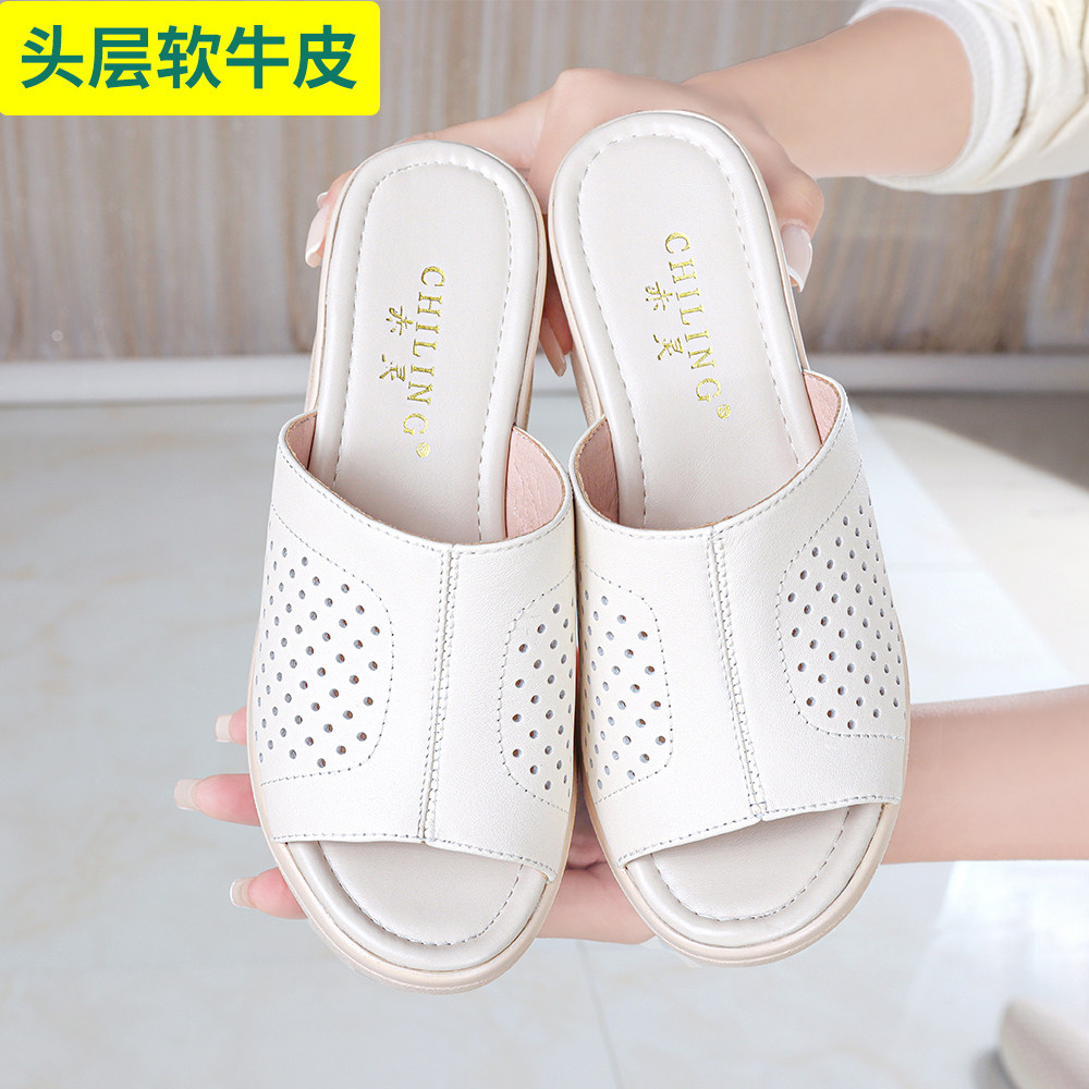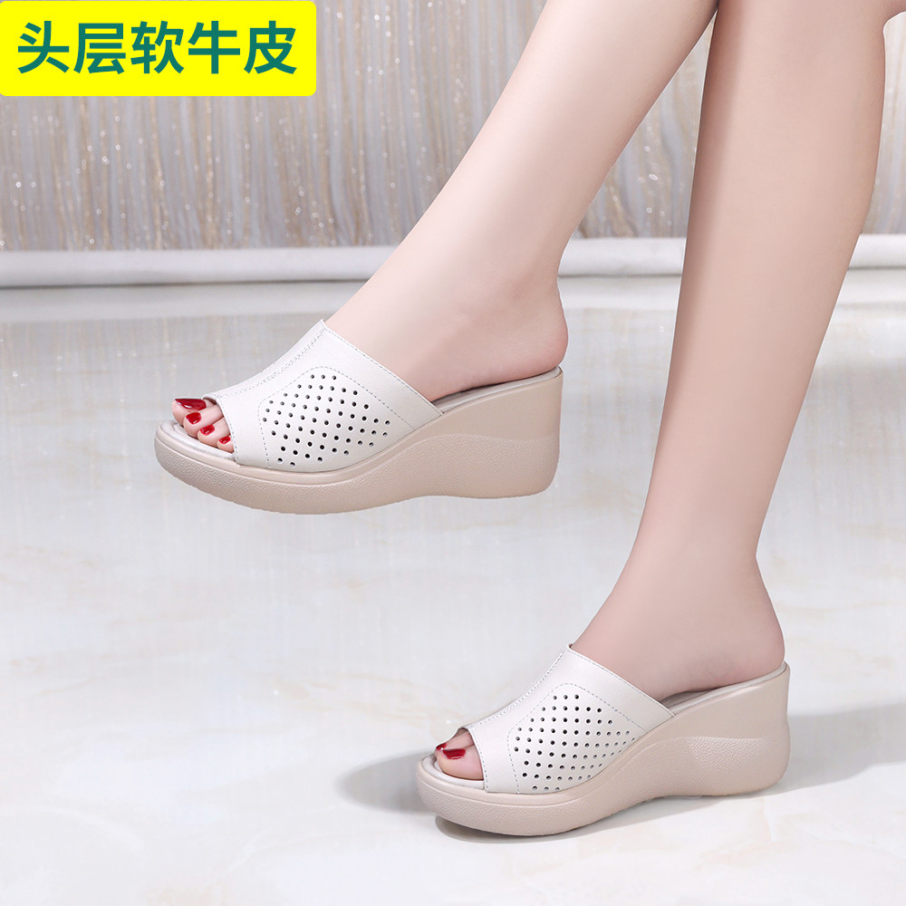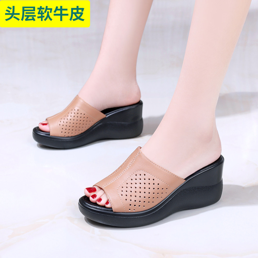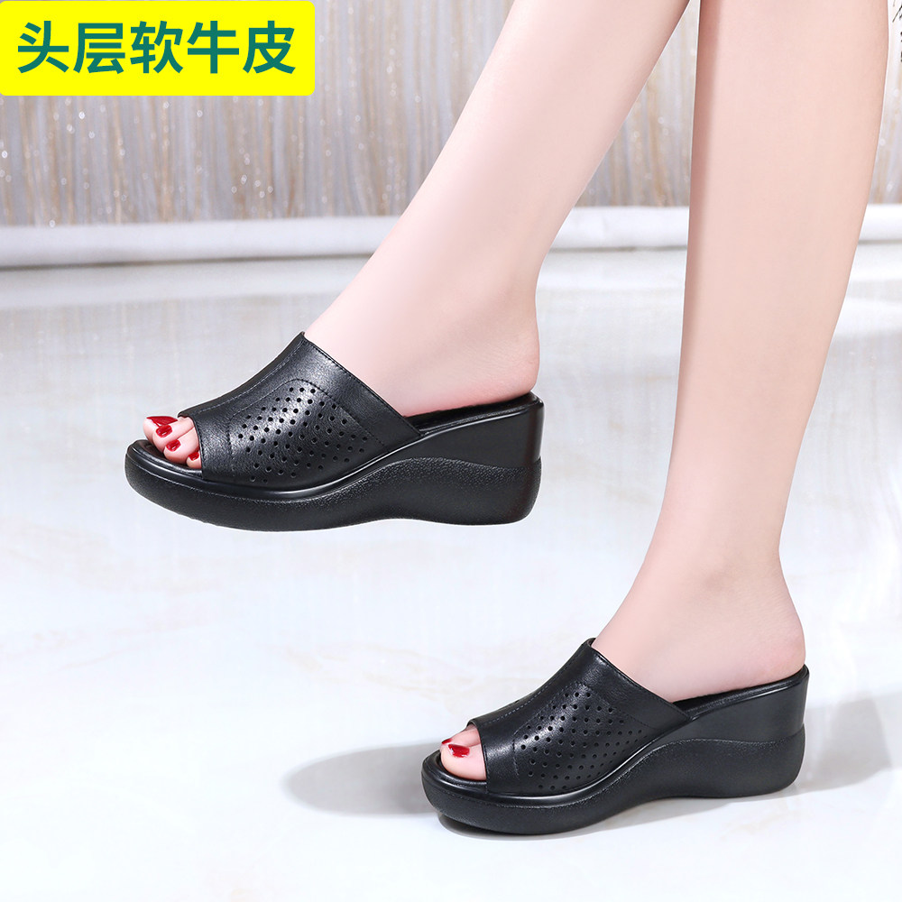 头层牛皮坡跟洞洞鞋夏季透气防滑厚底凉拖鞋轻便简约时尚百搭女鞋