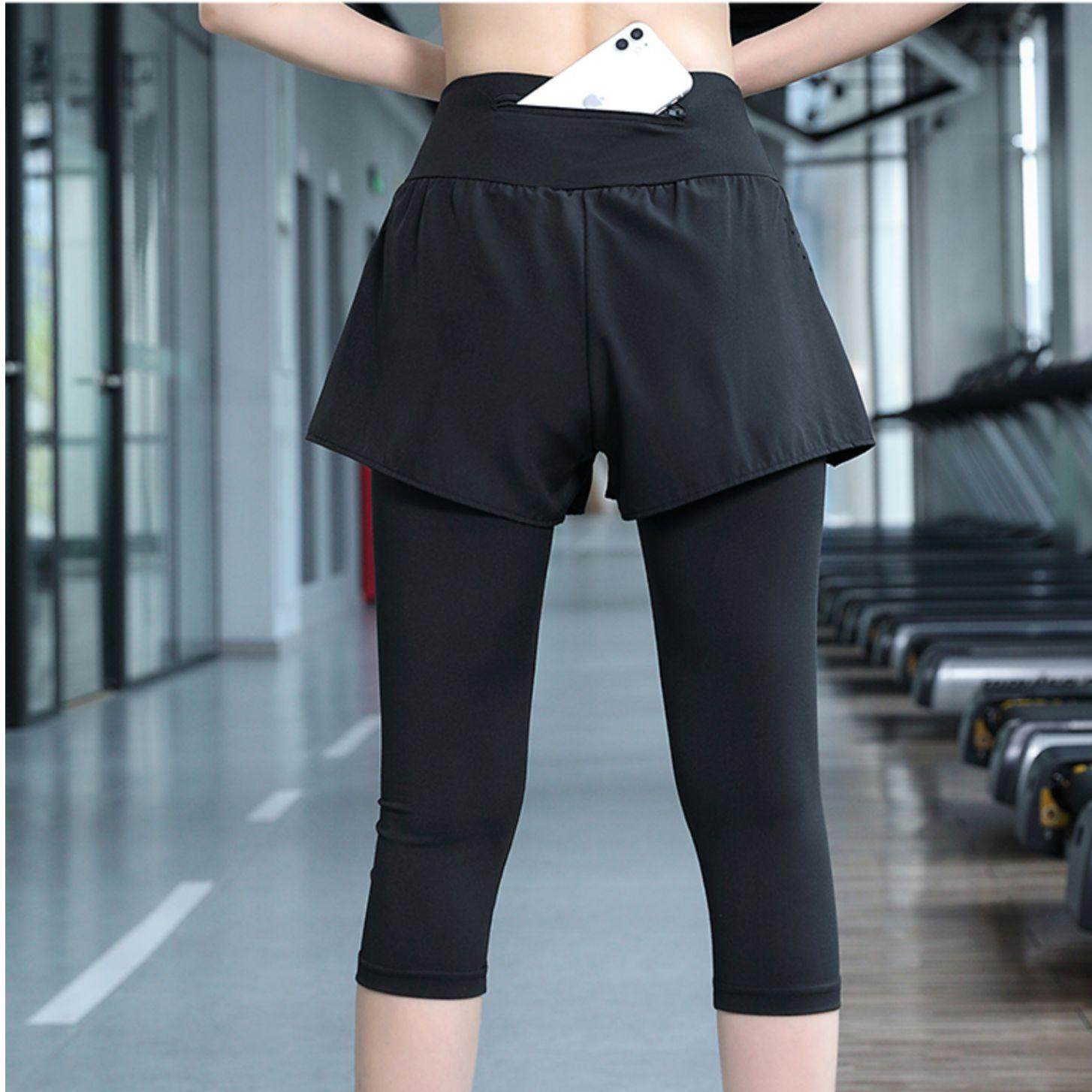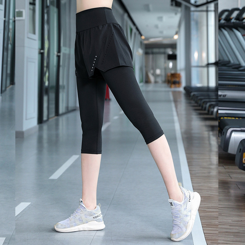 夏天健身跑步运动速干女胖mm高腰大码假两件瑜伽七分短裤宽松薄款