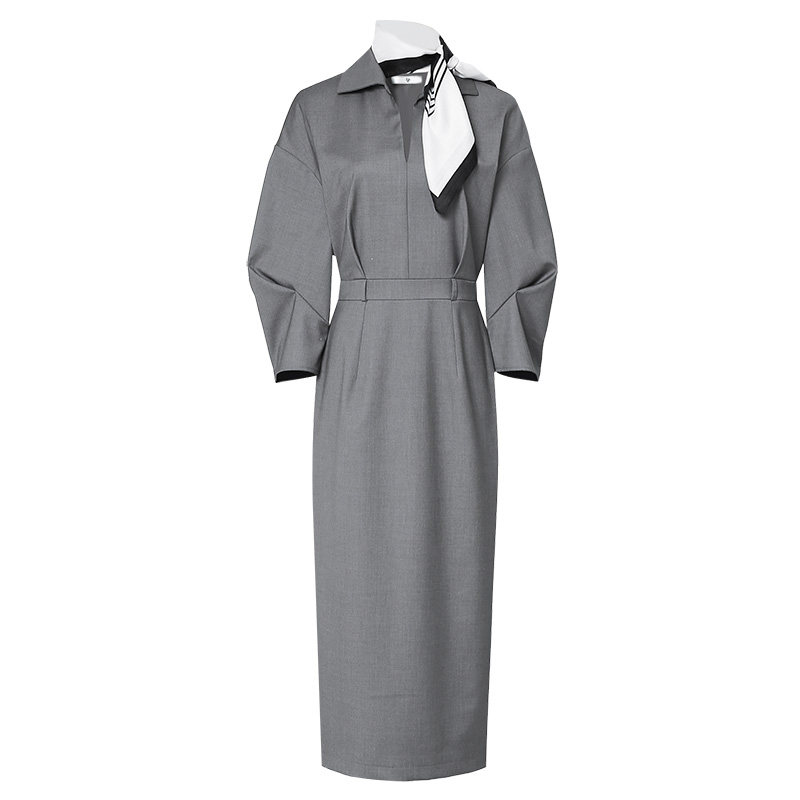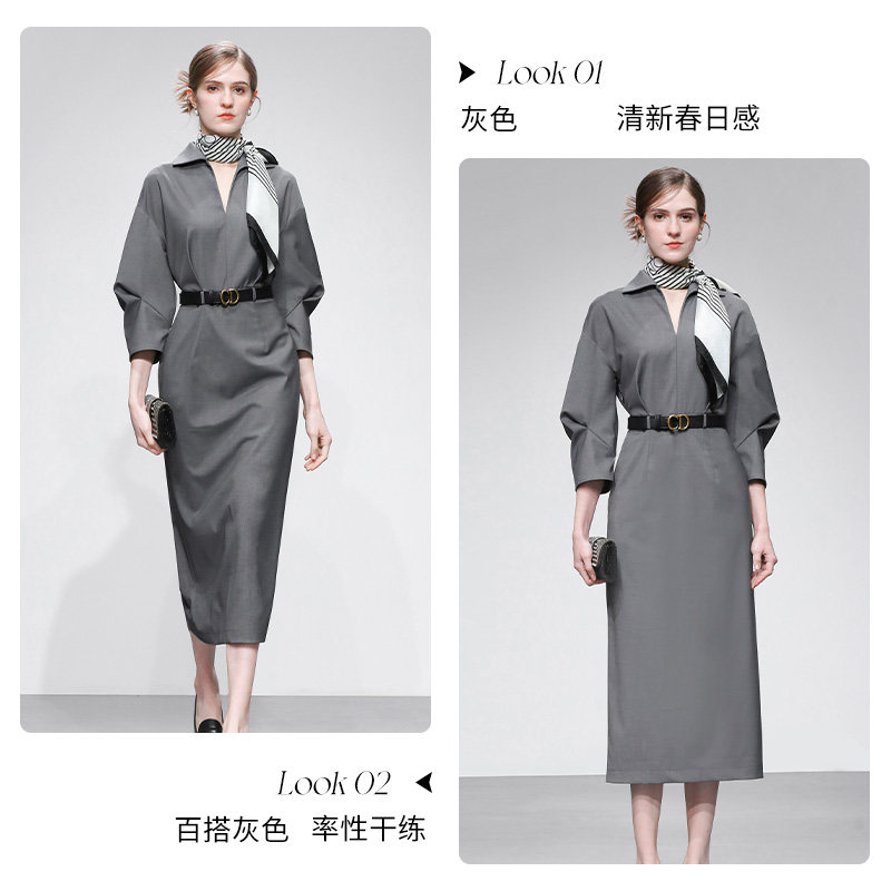 2026春季新款时尚轻奢气质通勤翻领设计收腰长款直筒灰色连衣裙