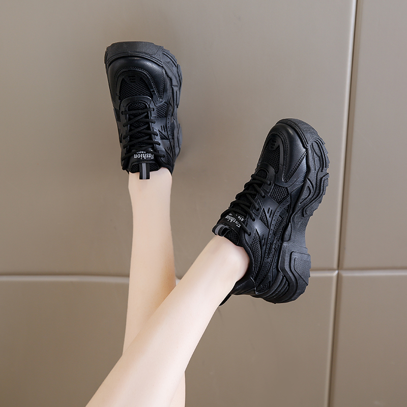 全黑色厚底老爹鞋女透气网面运动休闲鞋轻便软底防滑舒适工作鞋女