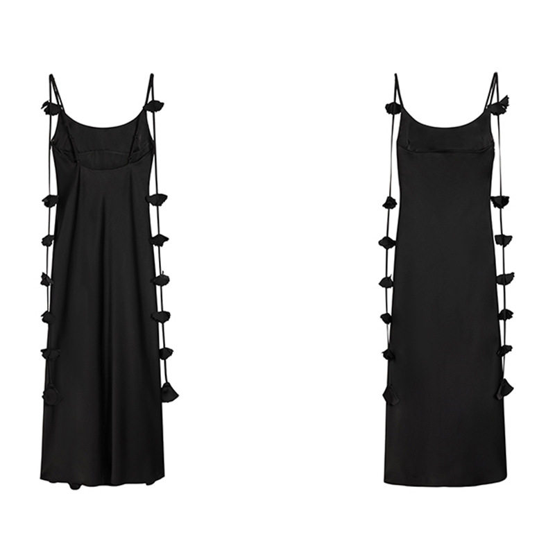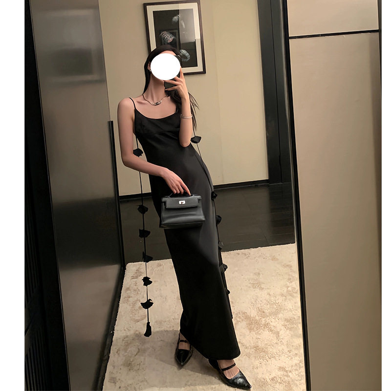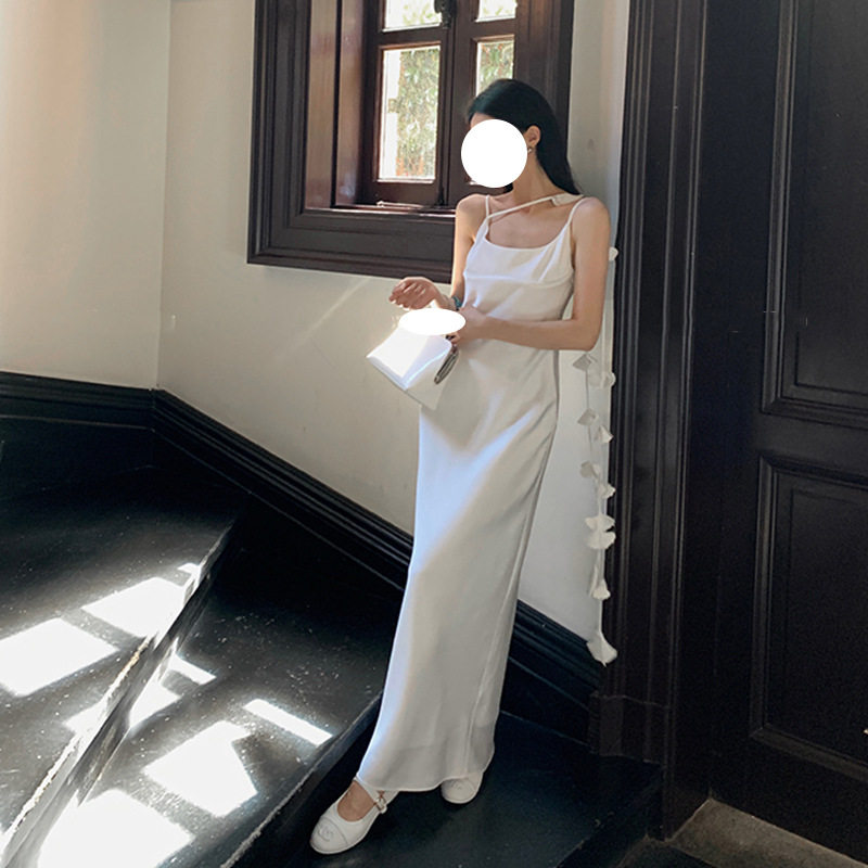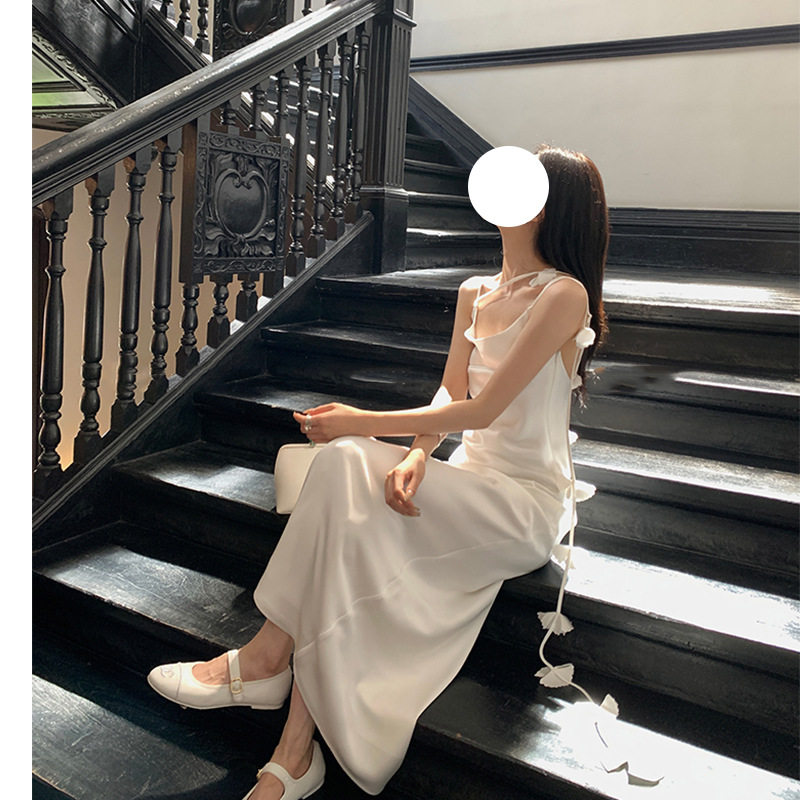 高级感法式白色缎面飘带连衣裙女仙气吊带露背长裙收腰显瘦礼服裙