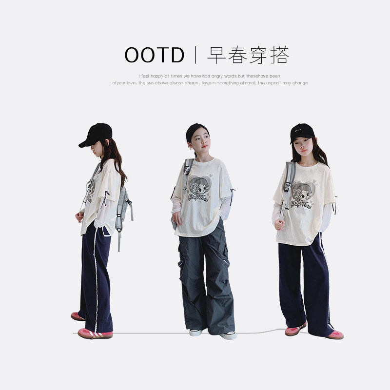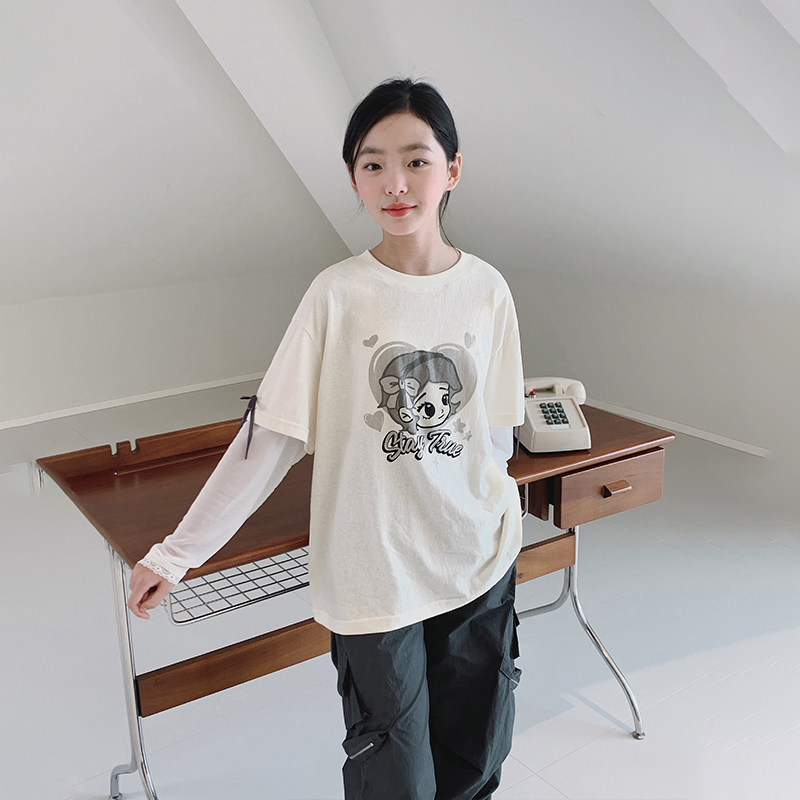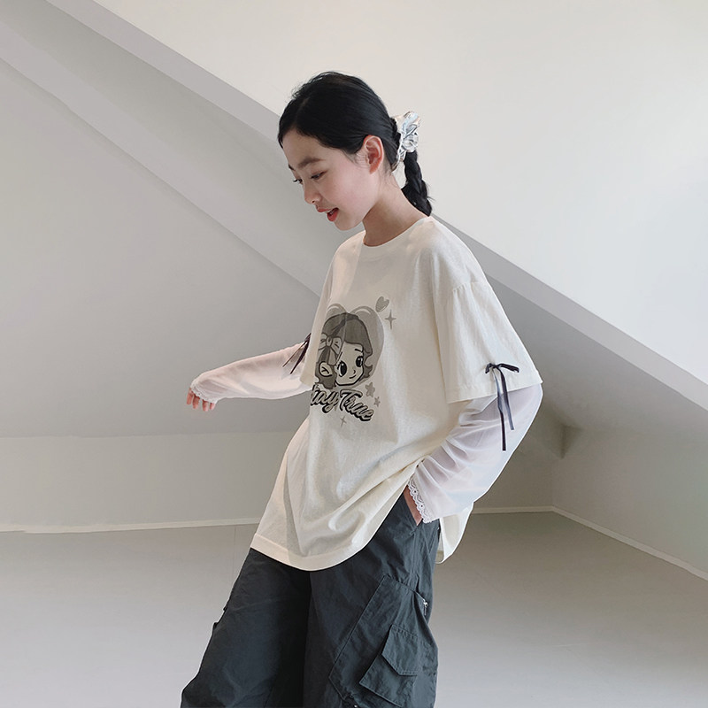 【浪漫少女】初中生女T恤2026春夏新款青少年网纱假两件长袖T恤衫