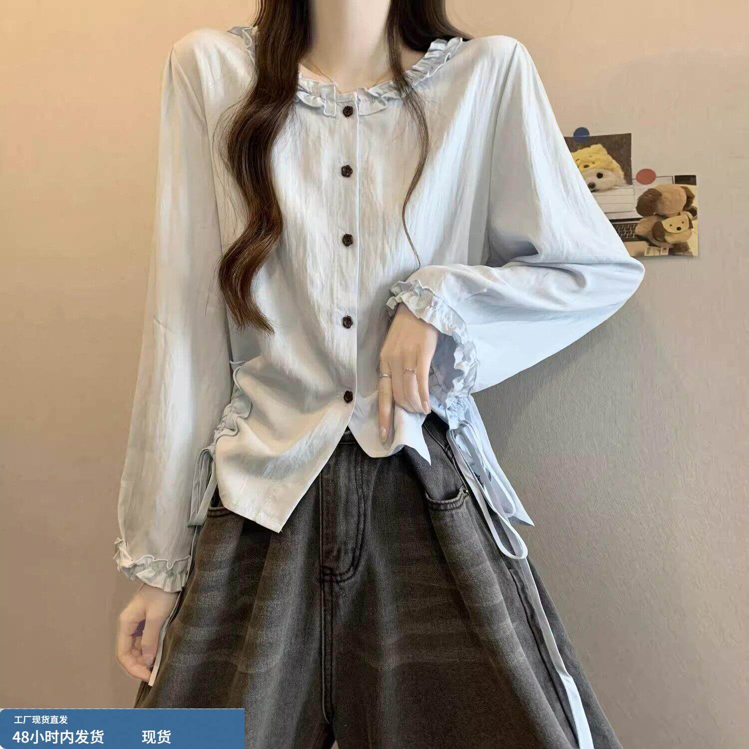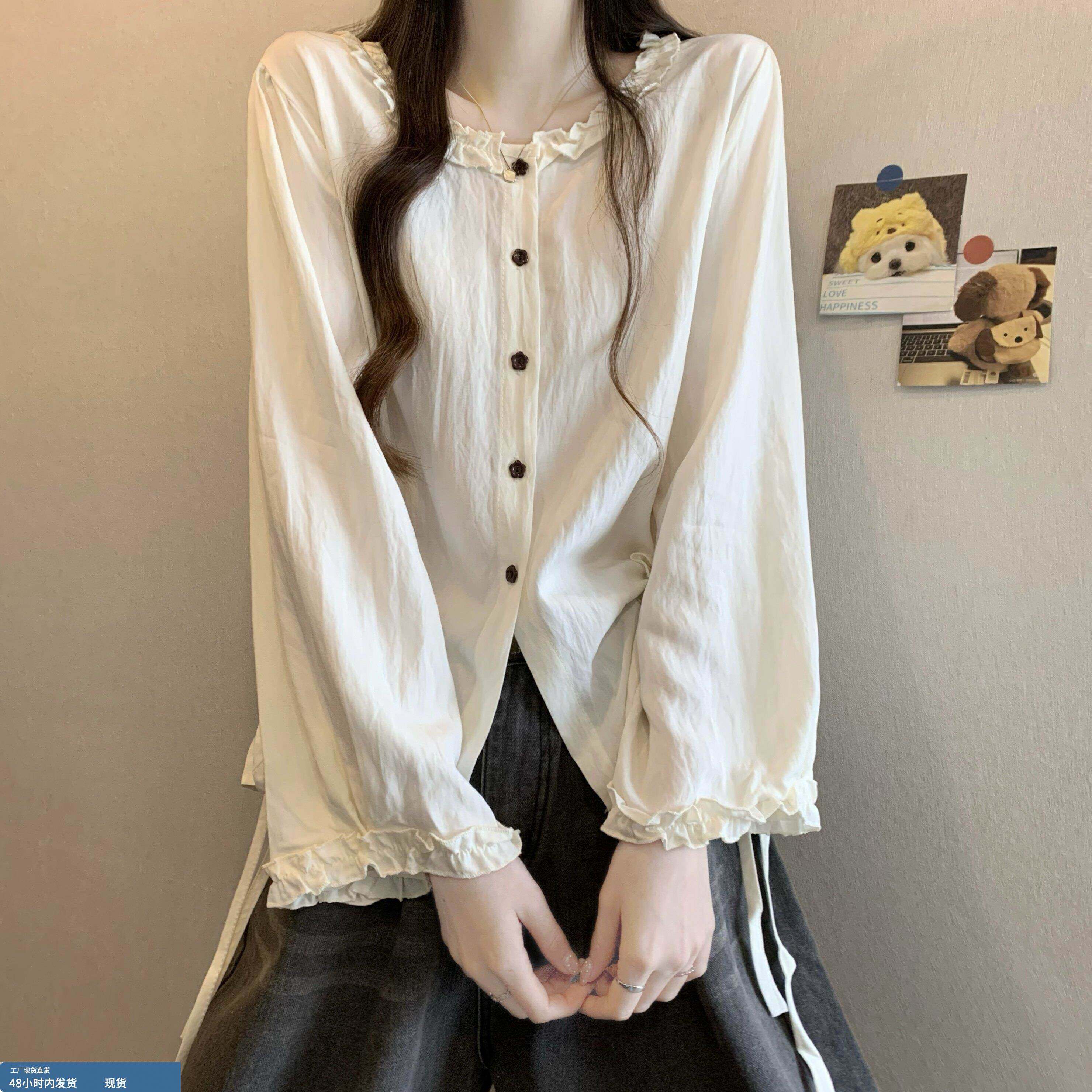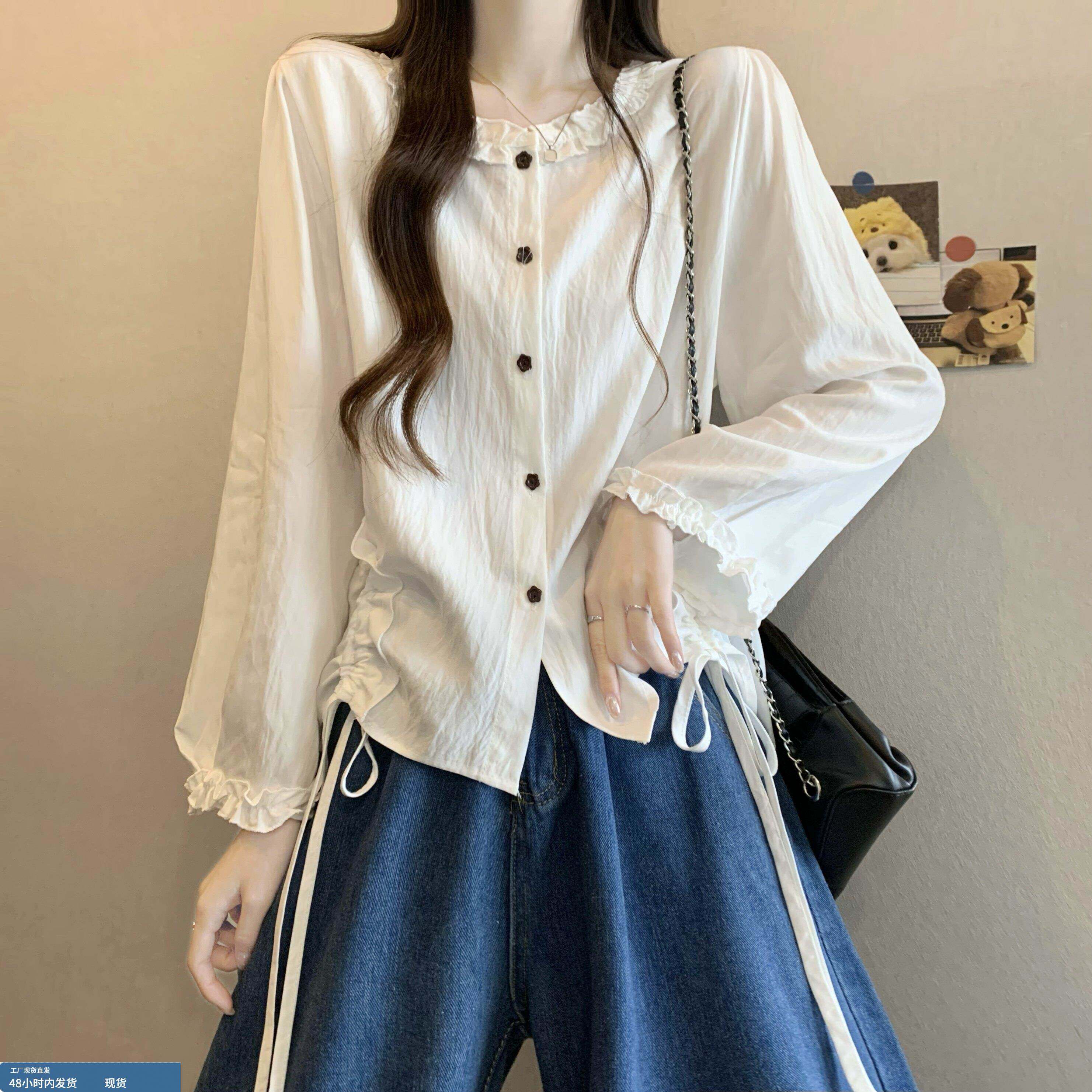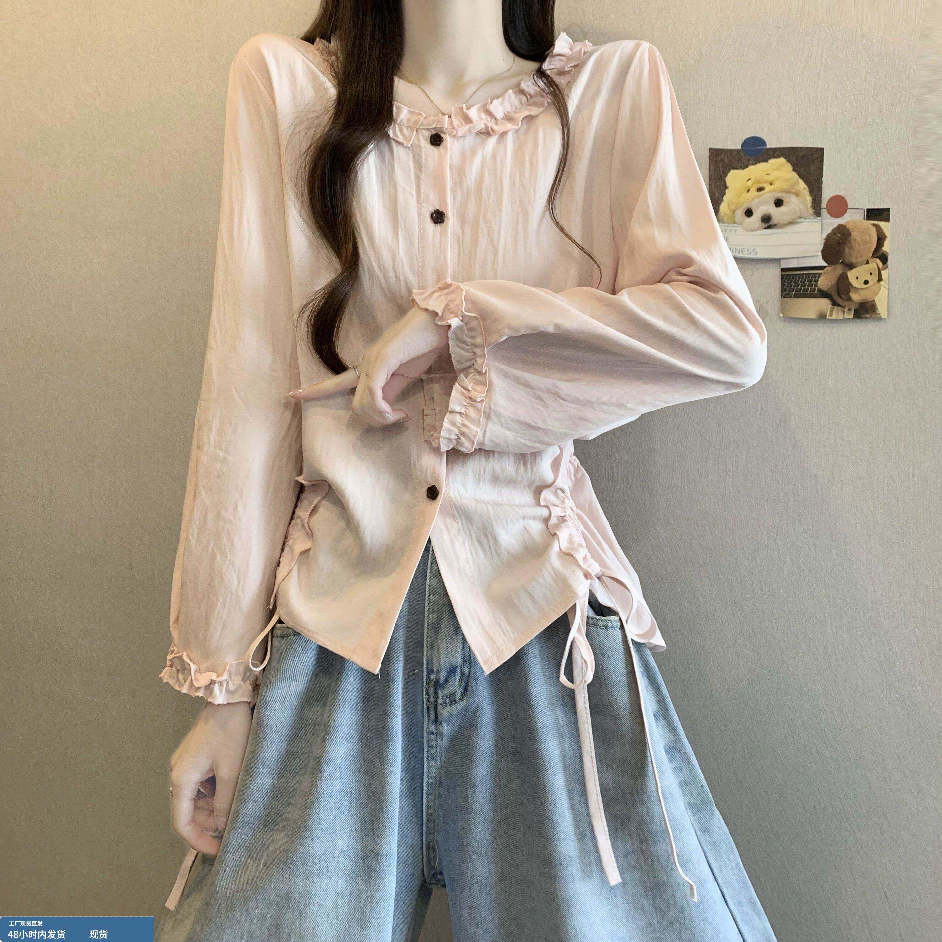 春装女款2026年新款爆款法式木耳边衬衫抽绳巨好看短款长袖小上衣