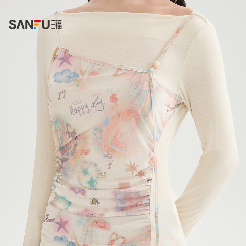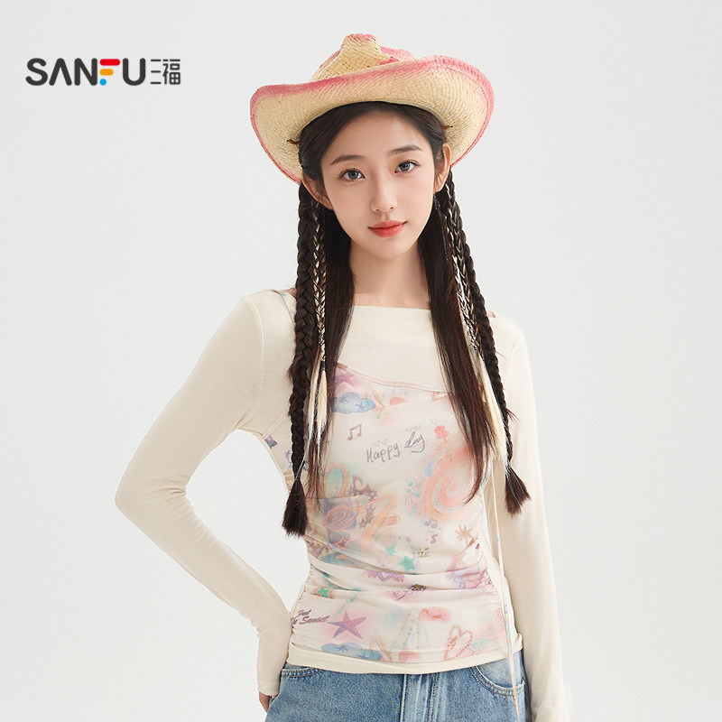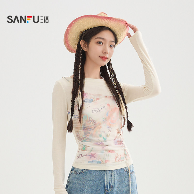 三福长袖T恤2026新款夏季别致露背网纱拼接假两件上衣女装521011