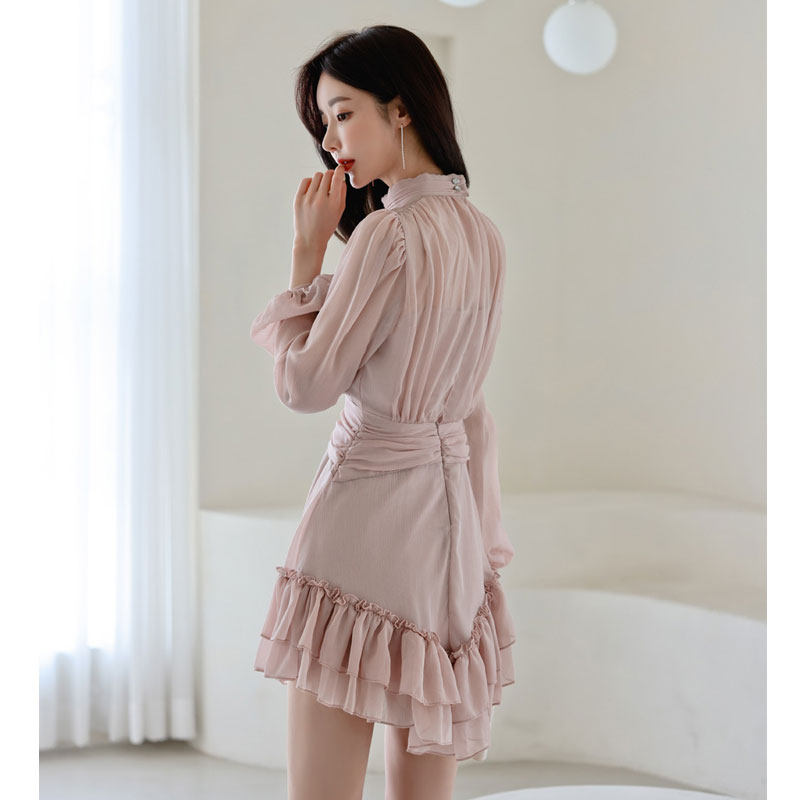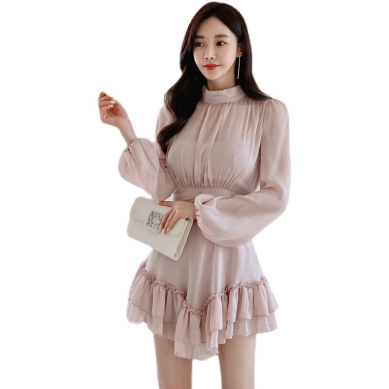 现货新款韩国东大门气质荷叶边雪纺连衣裙长袖短款女装法式晚礼服