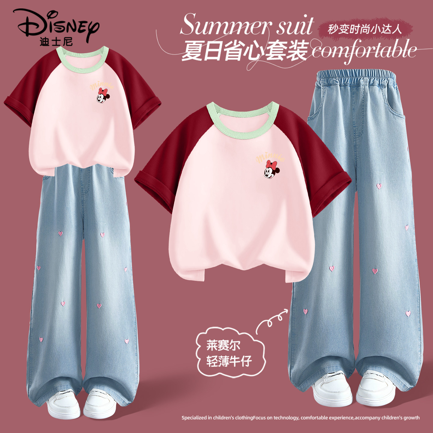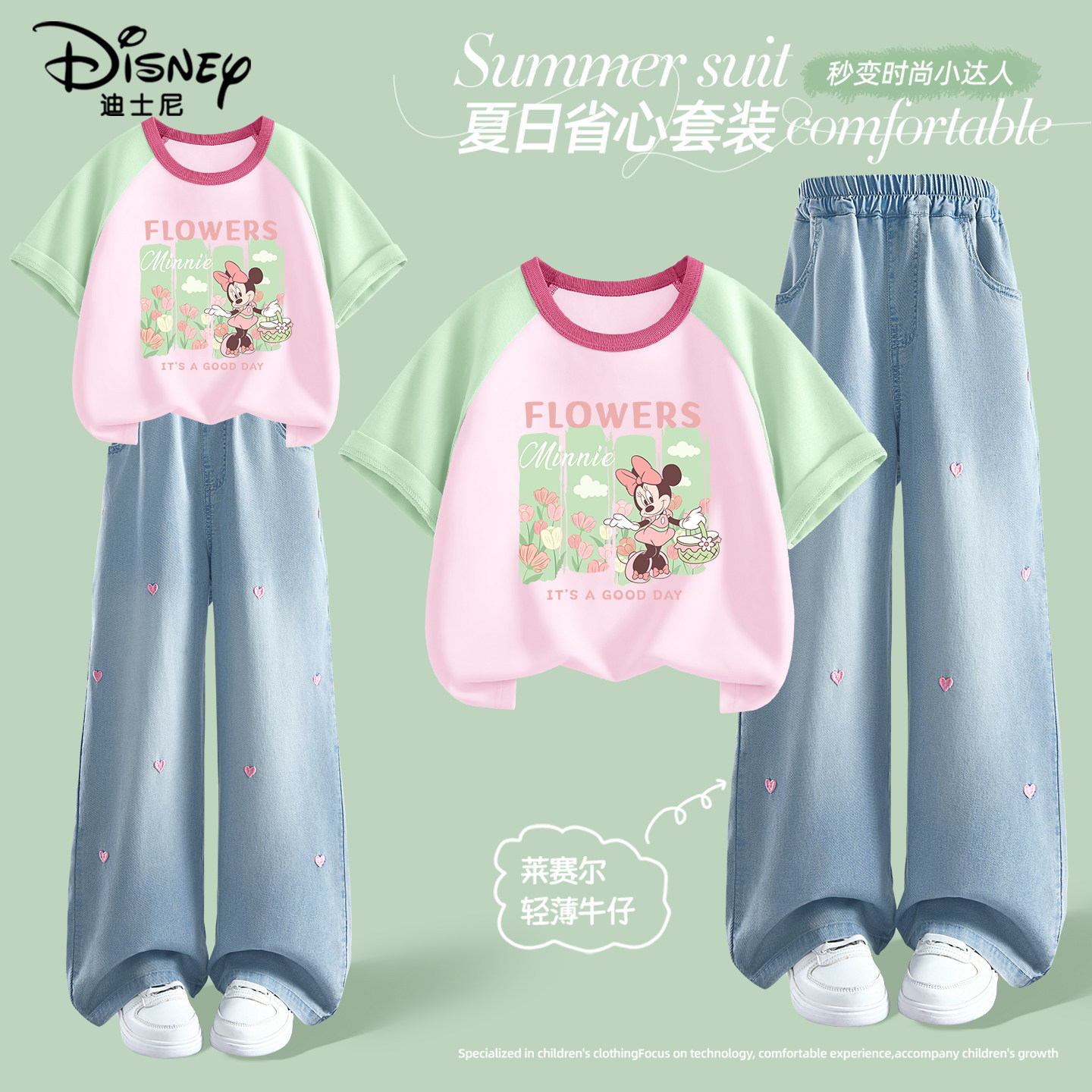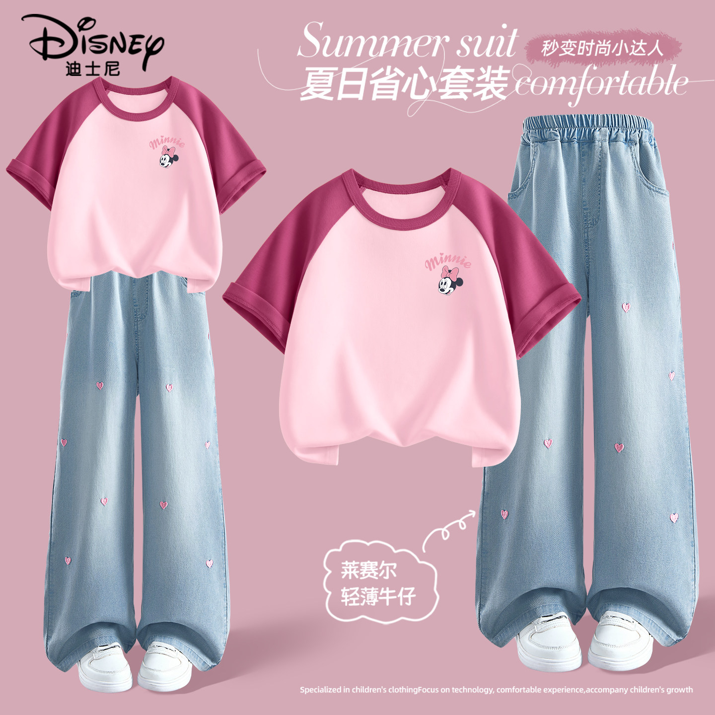 迪士尼女童夏季套装2026新款女孩纯棉短袖t恤时髦儿童夏装牛仔裤