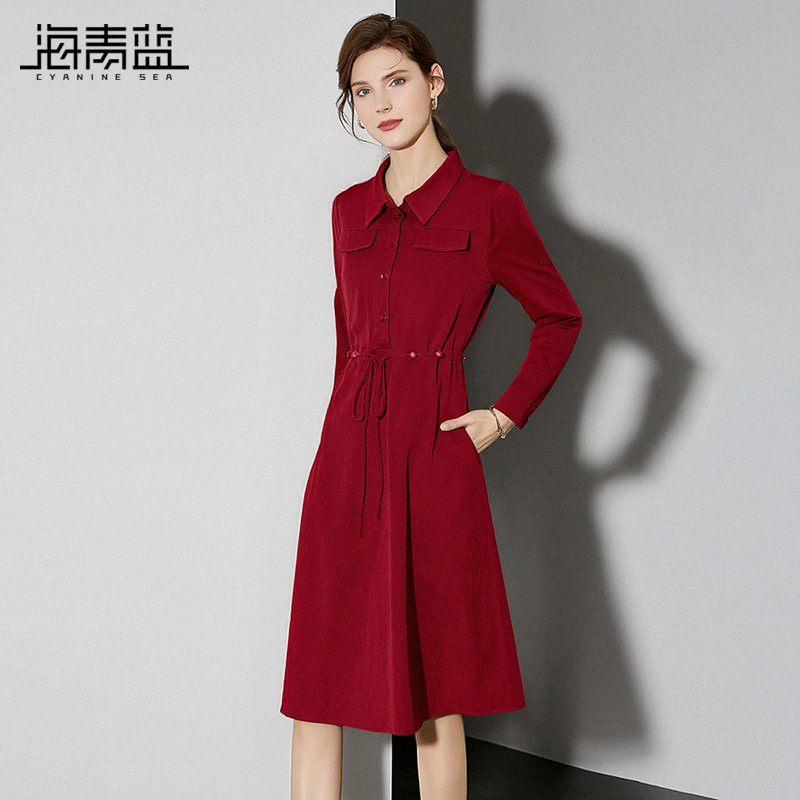 海青蓝 秋冬连衣裙女2026年新款系带翻领纯色长袖中长款高级裙子