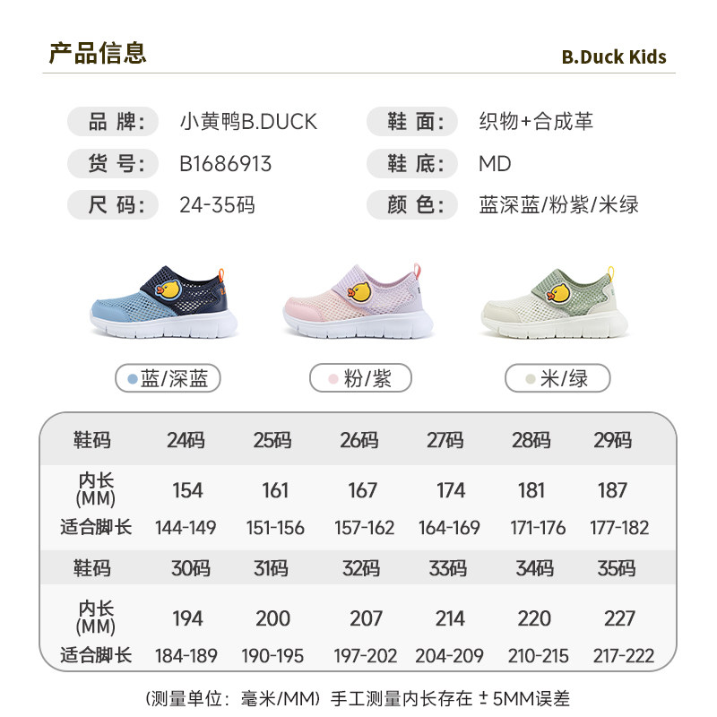 B.Duck小黄鸭童鞋男童运动鞋夏秋儿童镂空网鞋透气网面女童大网眼
